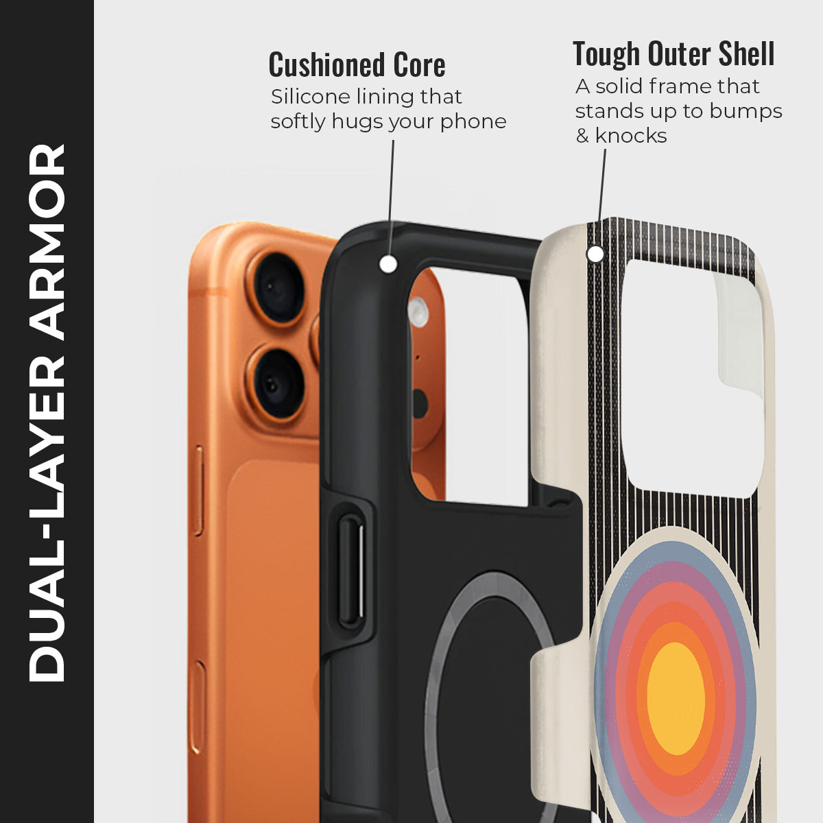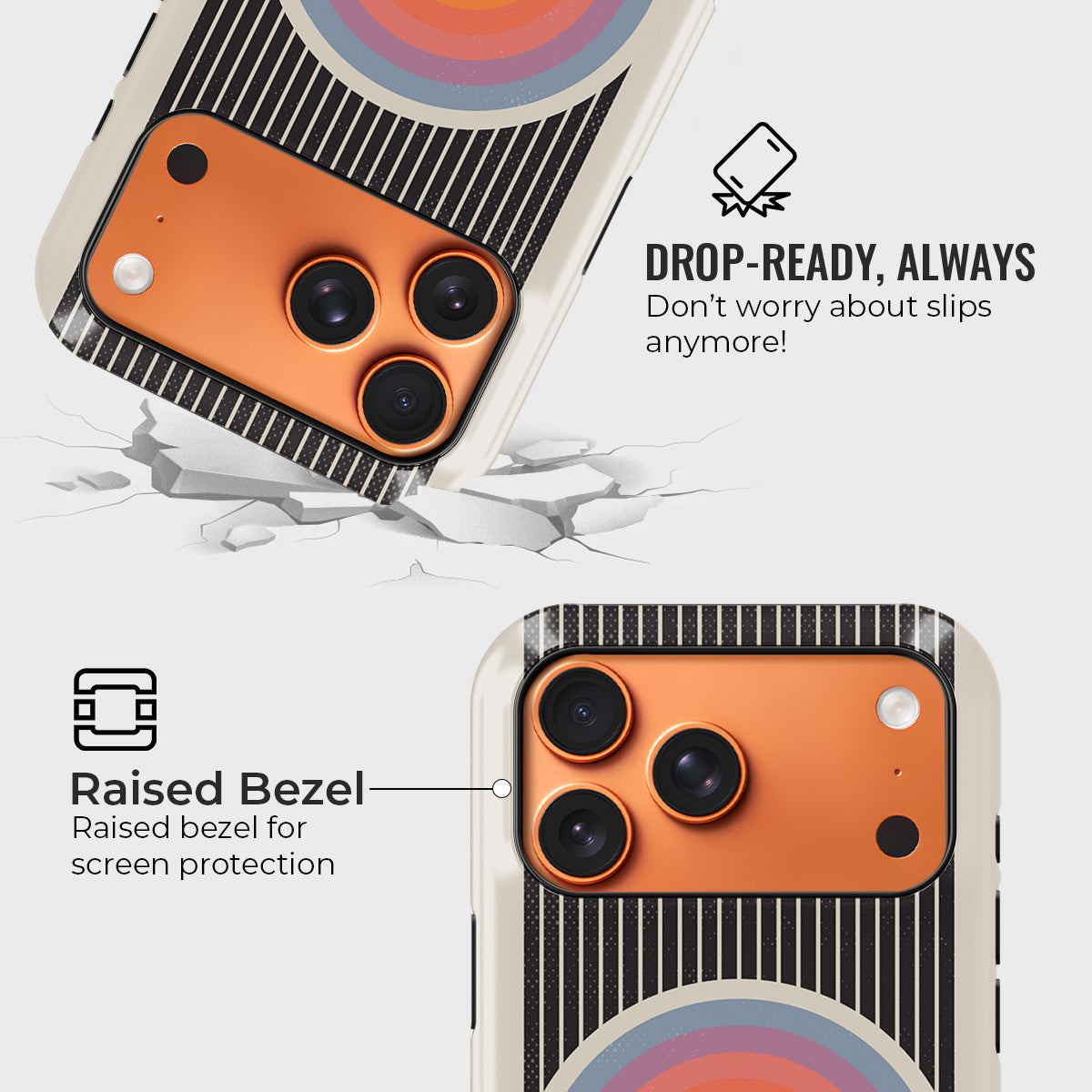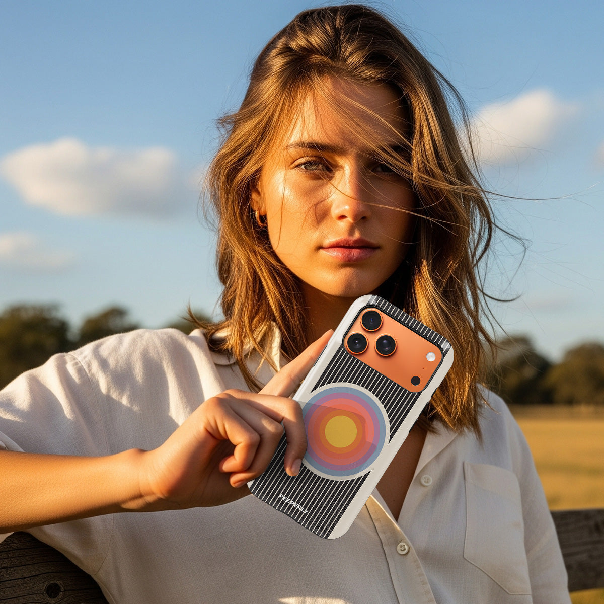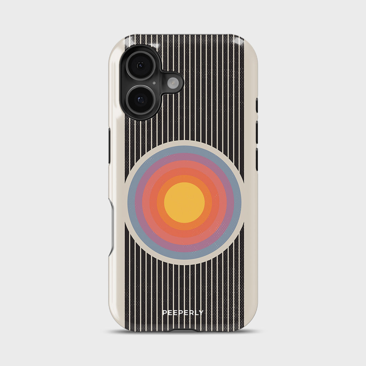 Step into the cosmos with Celestial Target, a bold fusion of retro design and galactic inspiration. This phone case features a hypnotic series of concentric circles radiating in vibrant sunset tones—yellow, orange, red, lavender, and deep blue—set against a sleek, black-striped backdrop.
