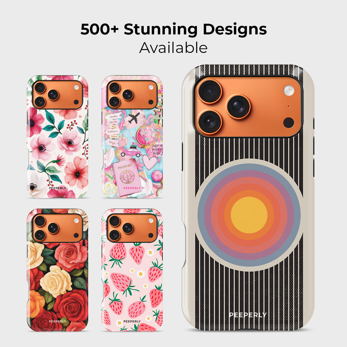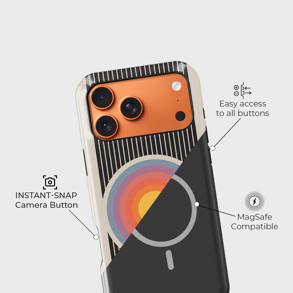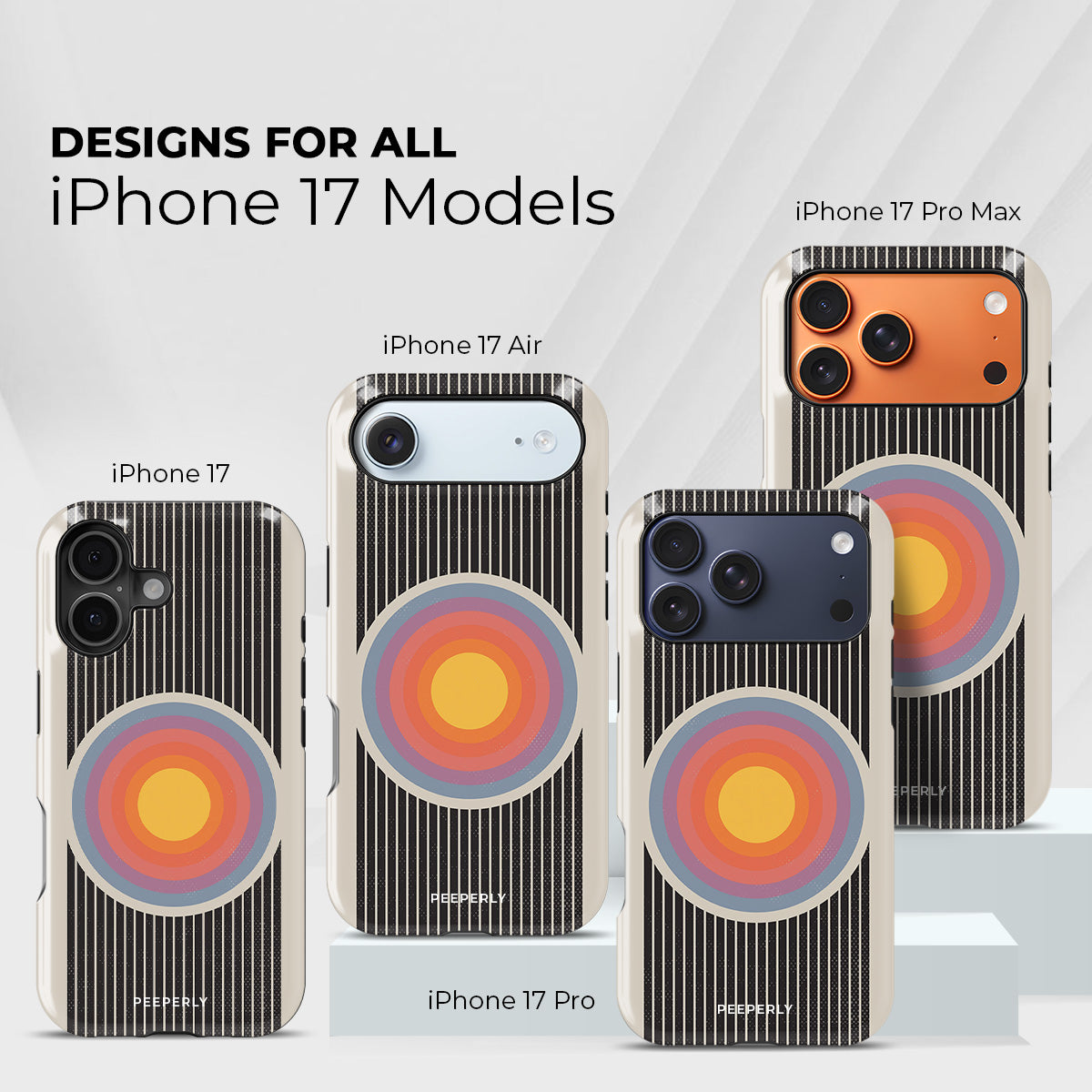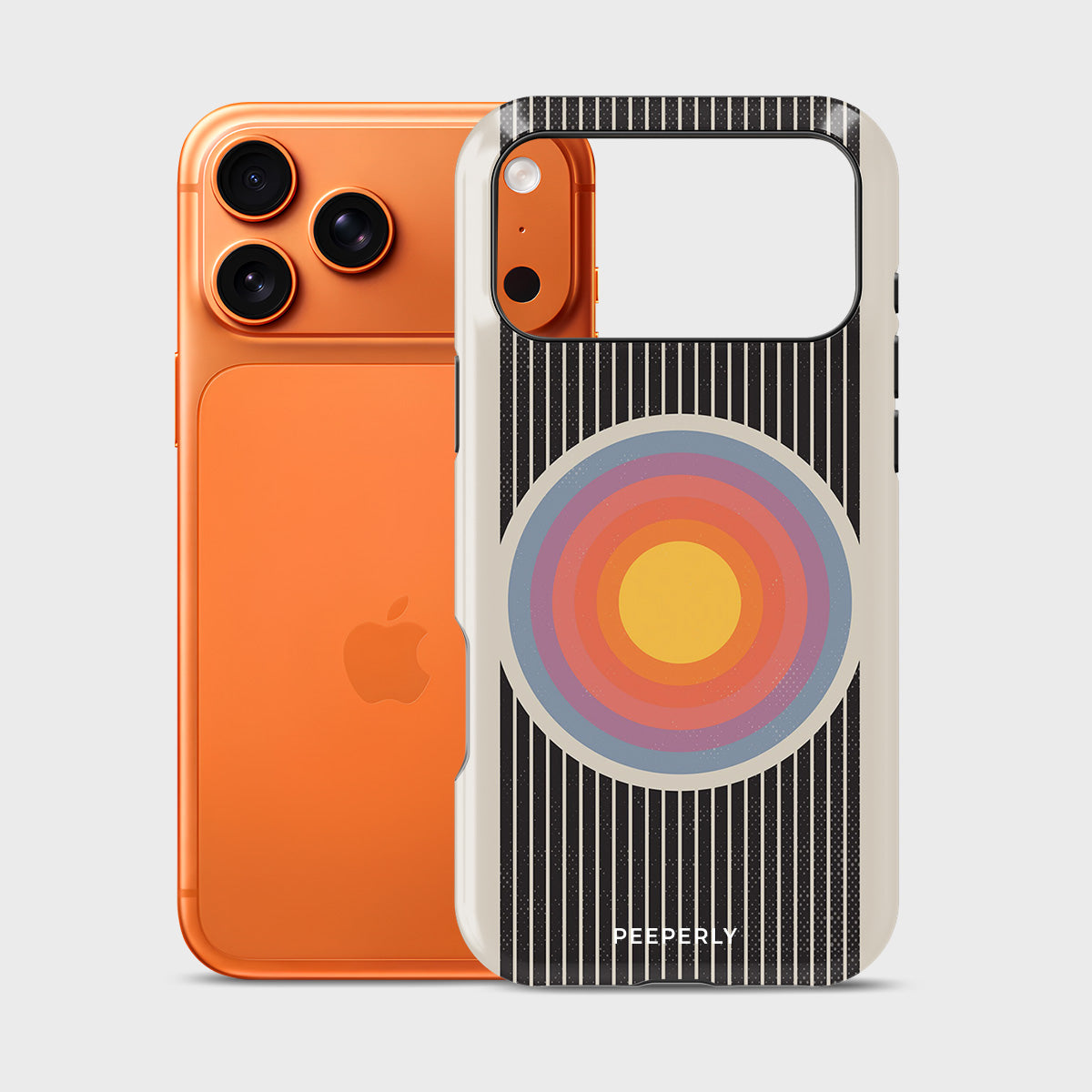 Step into the cosmos with Celestial Target, a bold fusion of retro design and galactic inspiration. This phone case features a hypnotic series of concentric circles radiating in vibrant sunset tones—yellow, orange, red, lavender, and deep blue—set against a sleek, black-striped backdrop.