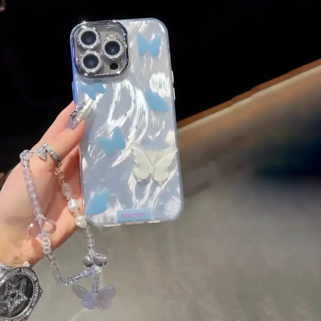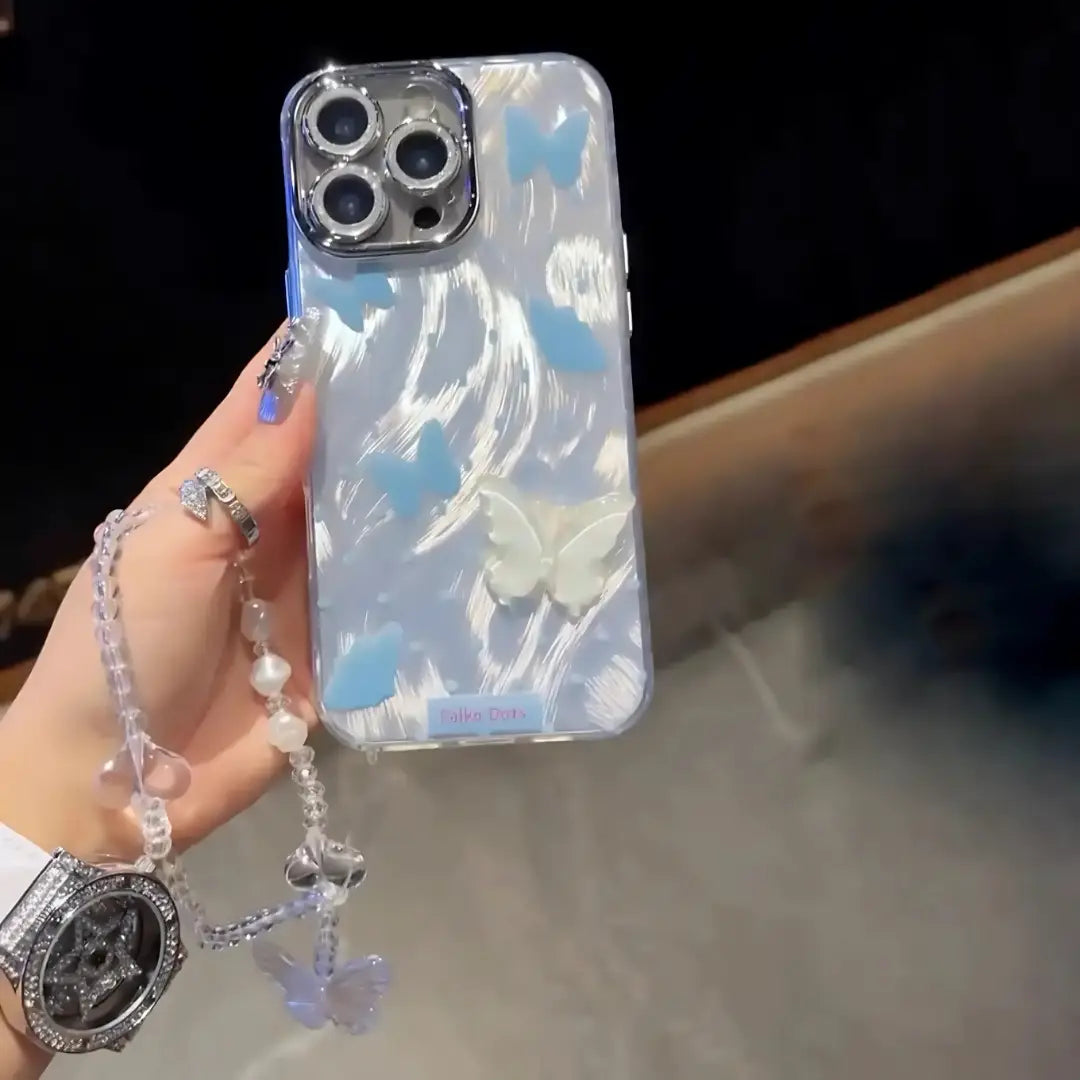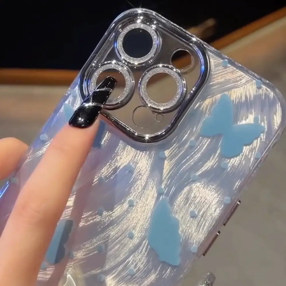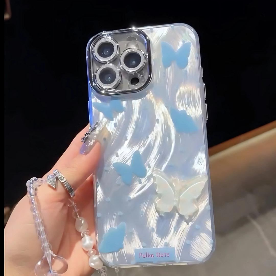 Wrap your phone in the ethereal elegance of Crystalwing, a phone case that turns everyday protection into a magical fashion statement. With dreamy swirls of iridescent shimmer and delicate 3D butterflies in soft blue and white, this case captures the essence of whimsical charm.