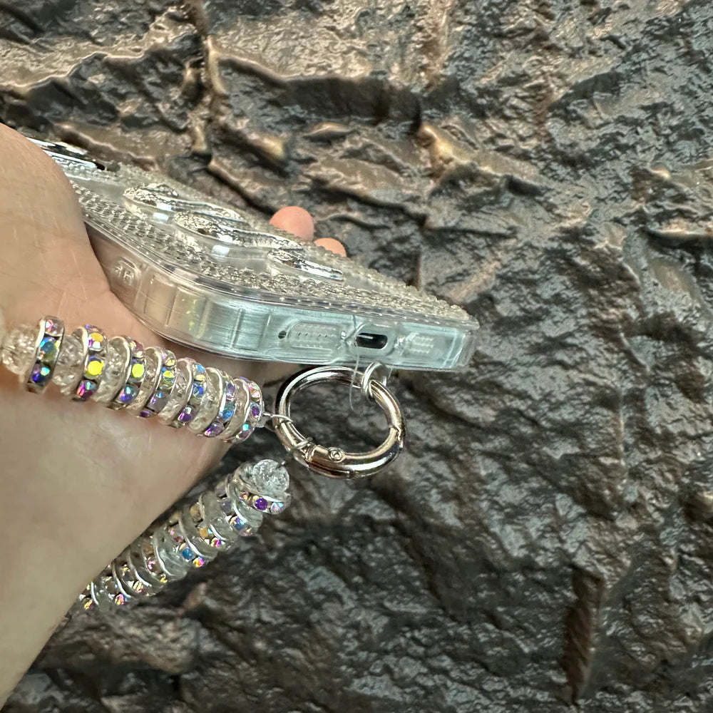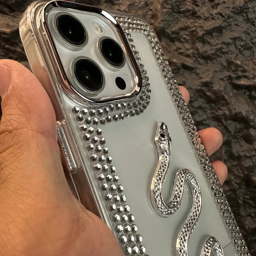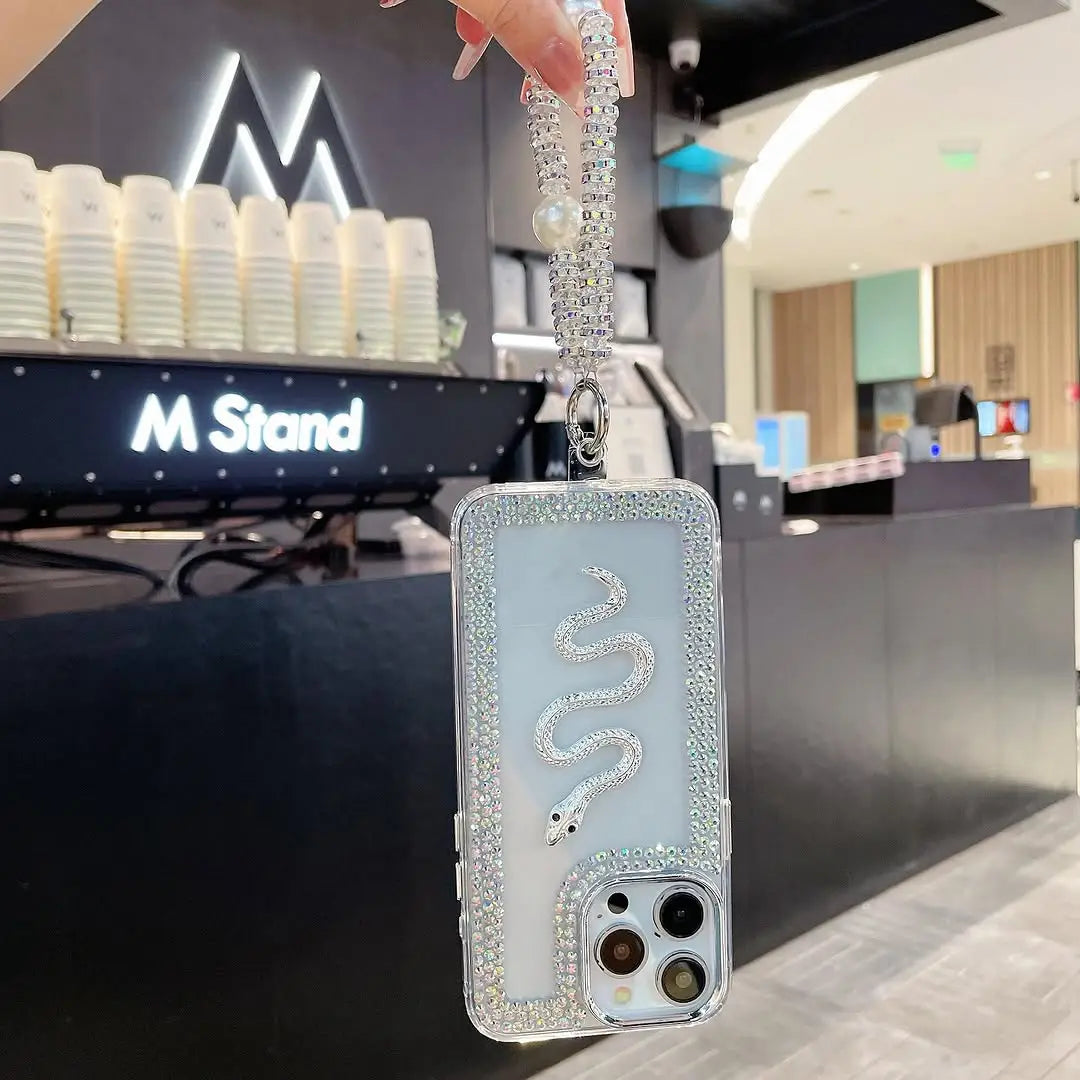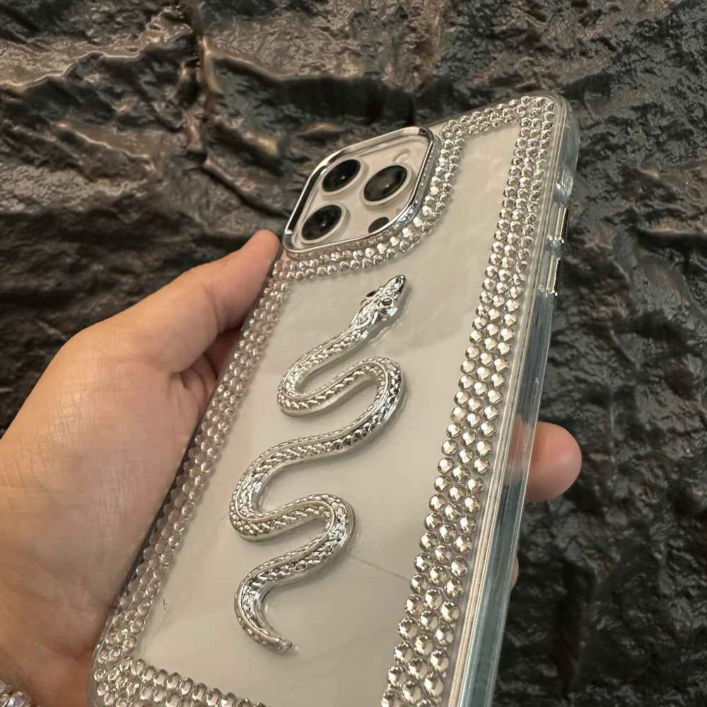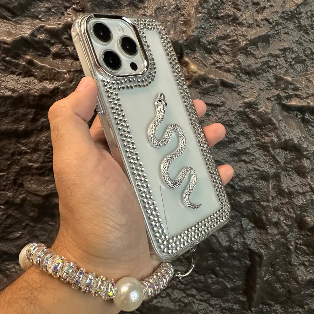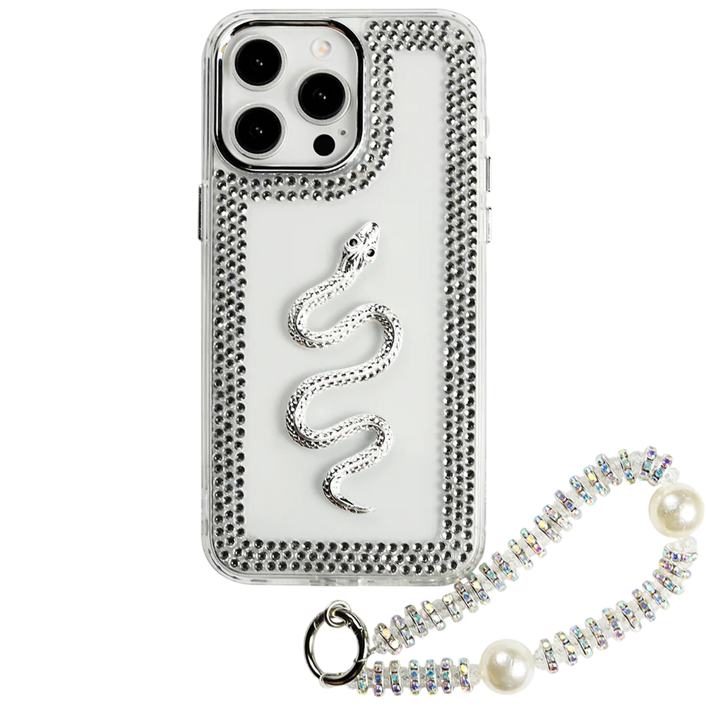 Unleash your bold side with Viper Elegance, a phone case that fuses luxury with fierce style. Featuring a metallic snake centerpiece framed by dazzling rhinestones, this case exudes both power and sophistication. The shimmering bracelet strap adds a touch of glam, making your phone as much a fashion accessory as it is a device.
