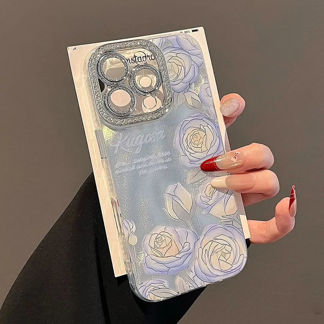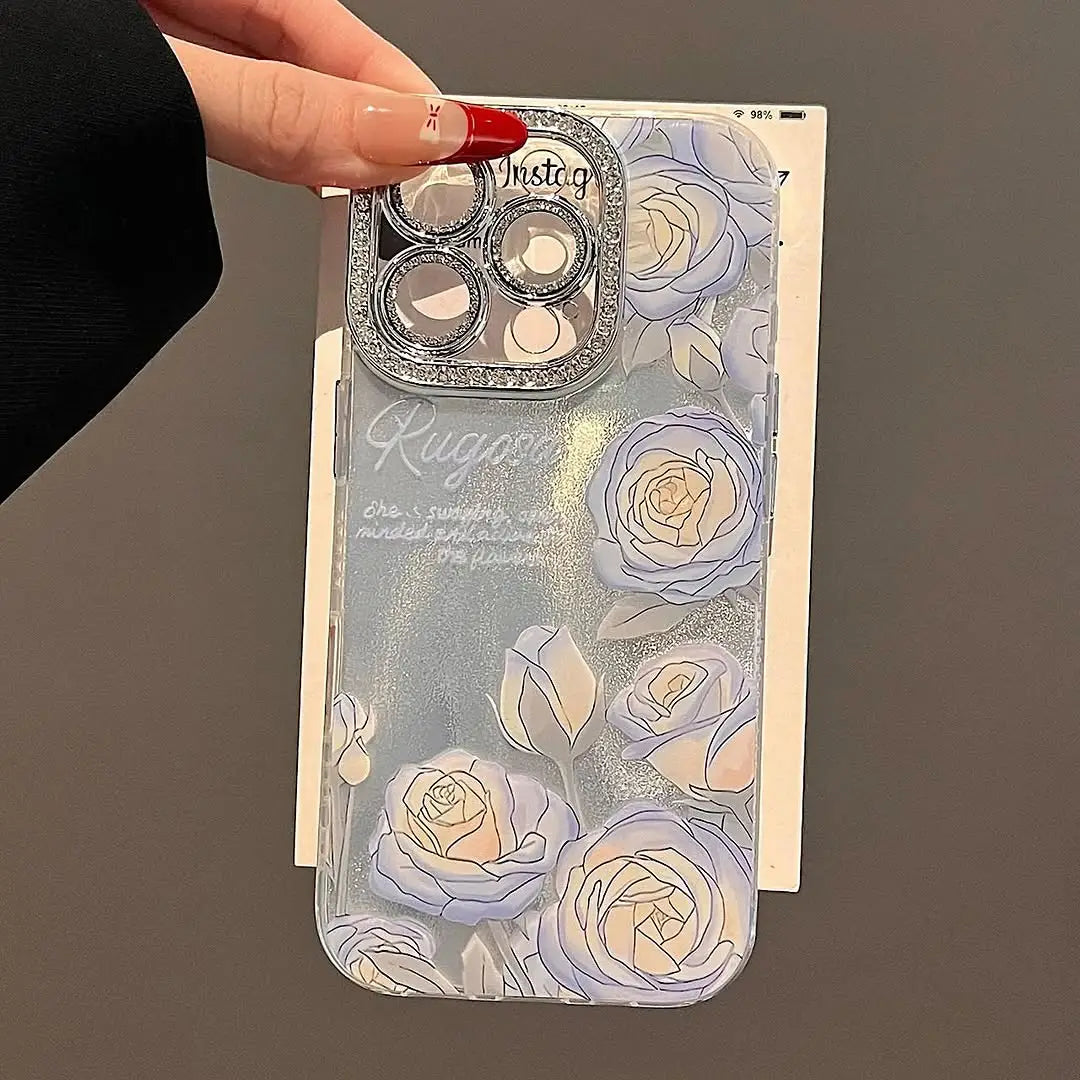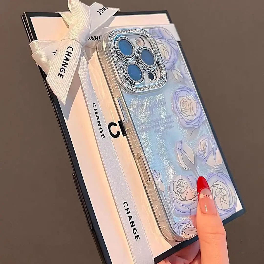 Capture the beauty of a moonlit garden with Moonlit Celestial Roses, a case that blends elegance with sparkle. Featuring delicate blue and ivory roses over a shimmering backdrop, this case evokes the magic of midnight blooms kissed by starlight.