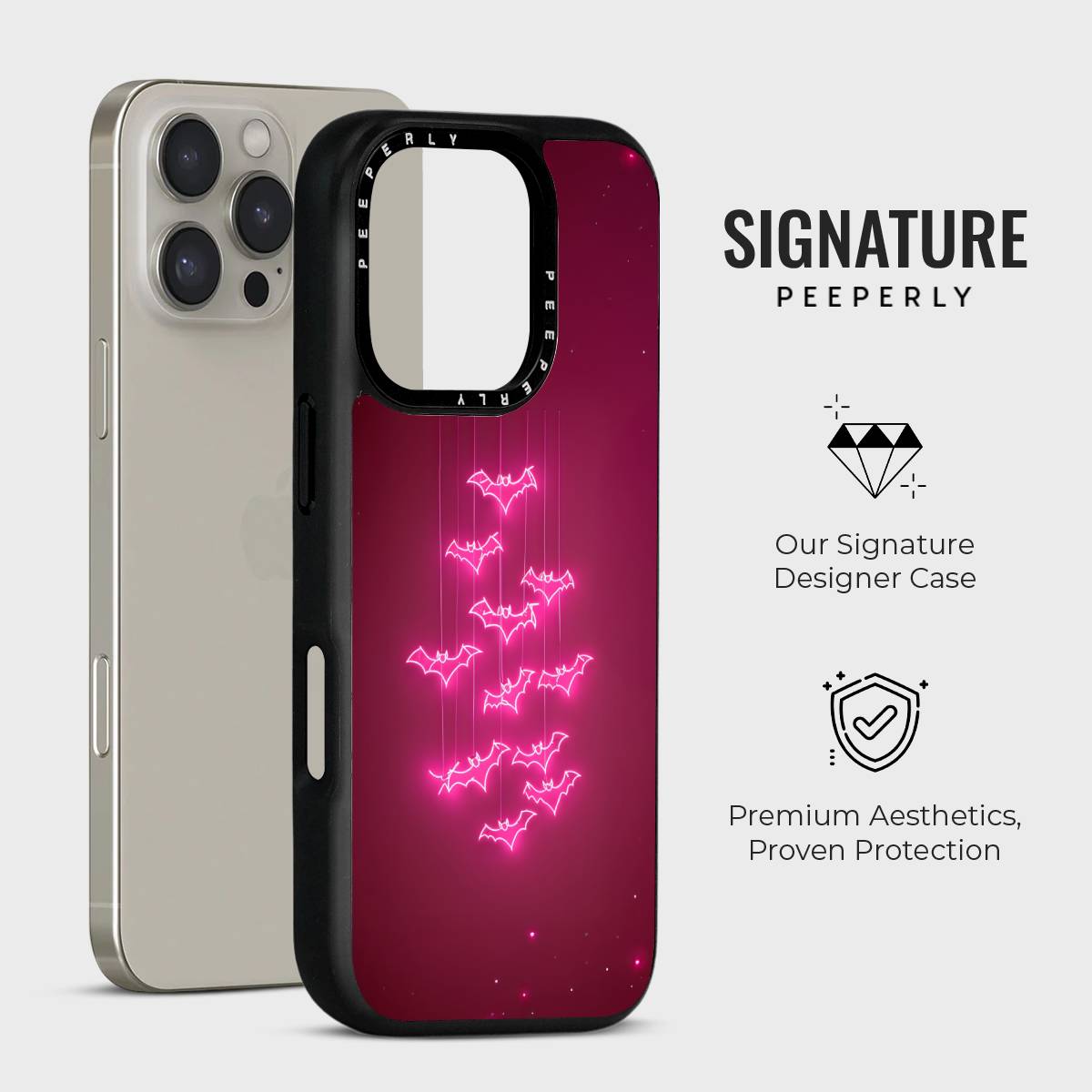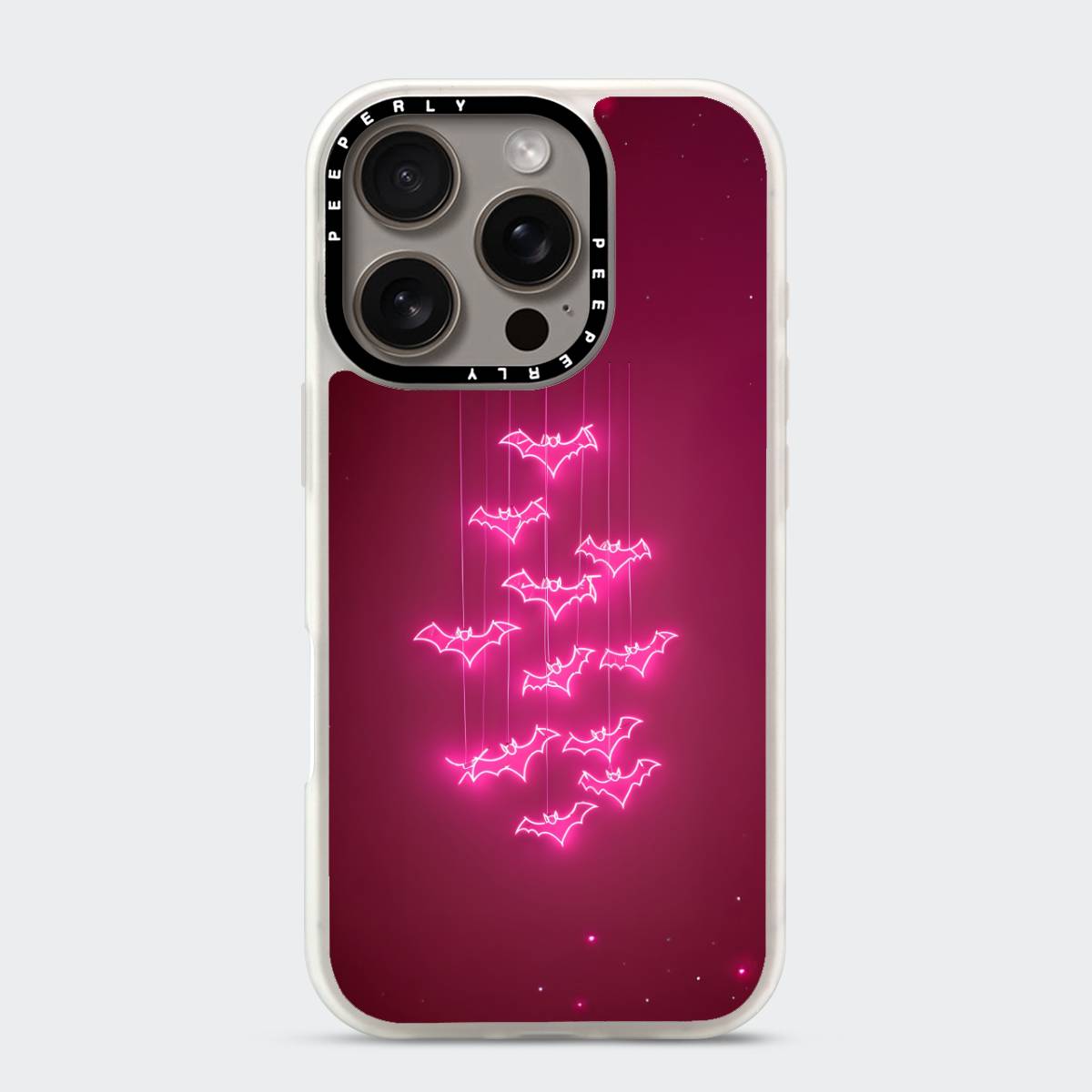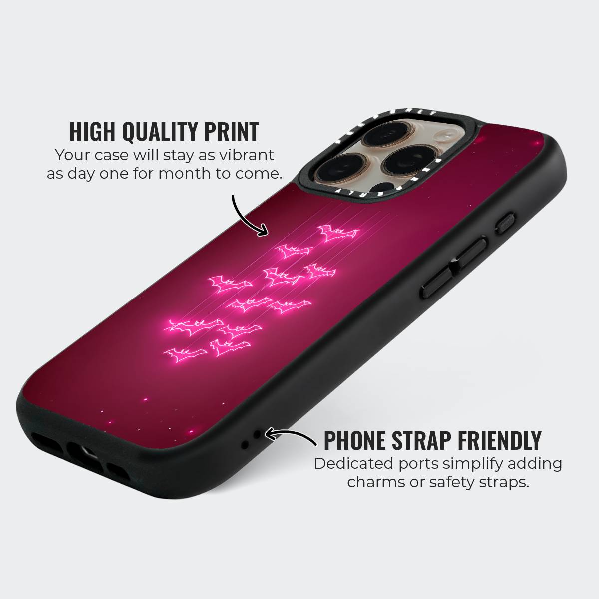 Fuchsia Flight captures the thrill of midnight skies with a playful twist. Neon-bright bats glide downward across a rich fuchsia backdrop, creating a dazzling glow-in-the-dark vibe. Perfect for anyone who loves bold, edgy, and vibrant designs, this case adds a pop of electric energy while keeping your phone protected in style.