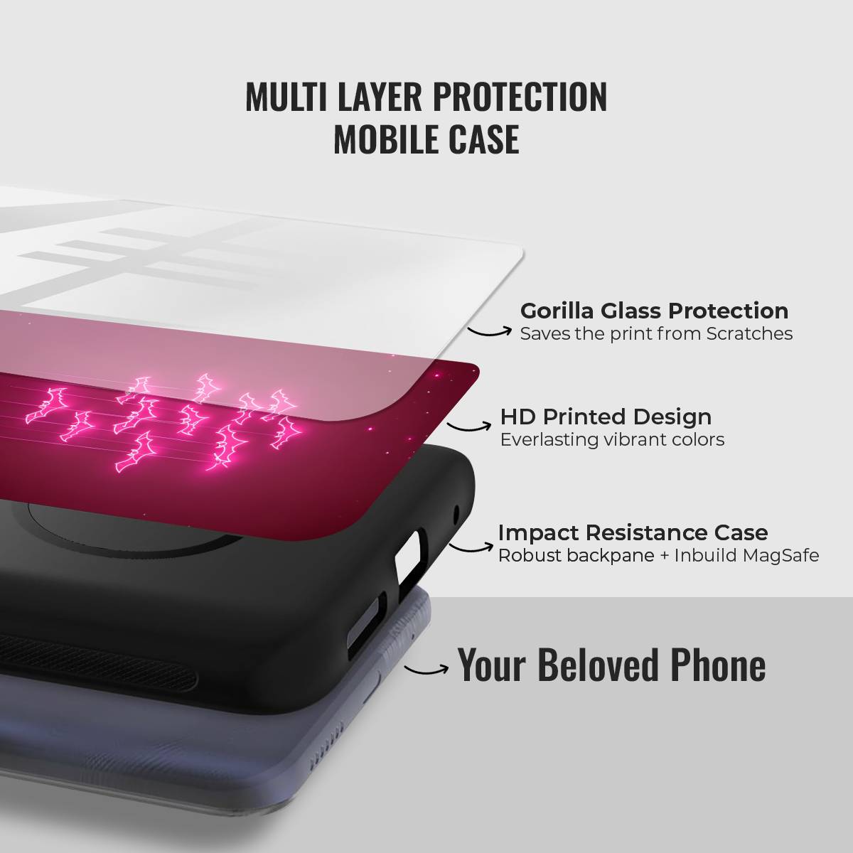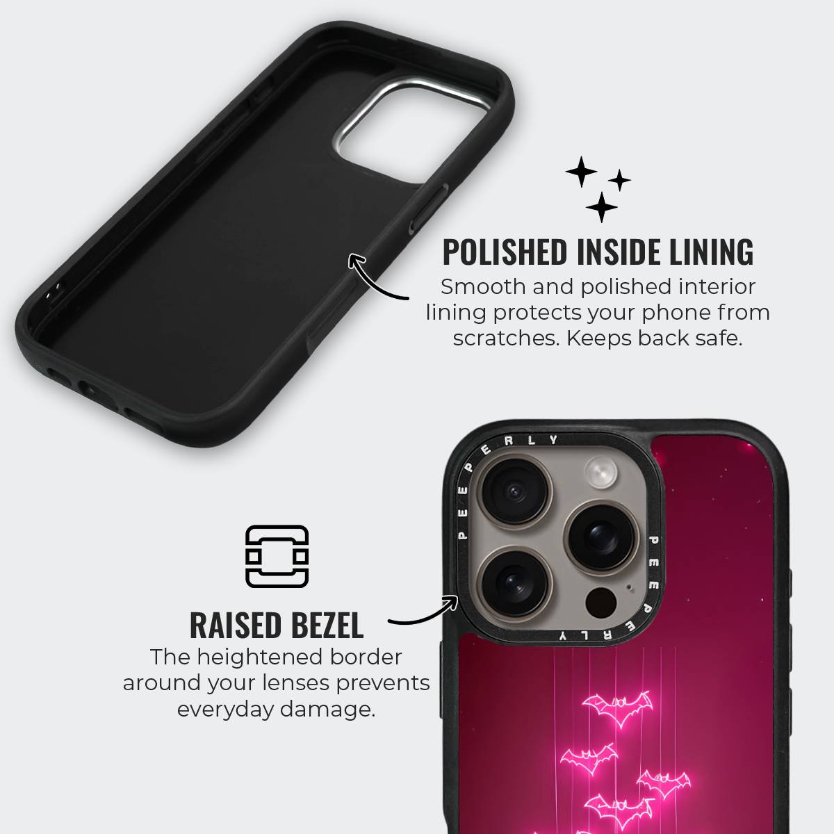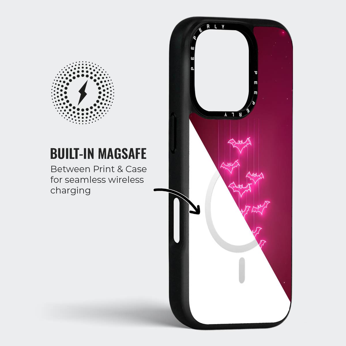 Fuchsia Flight captures the thrill of midnight skies with a playful twist. Neon-bright bats glide downward across a rich fuchsia backdrop, creating a dazzling glow-in-the-dark vibe. Perfect for anyone who loves bold, edgy, and vibrant designs, this case adds a pop of electric energy while keeping your phone protected in style.