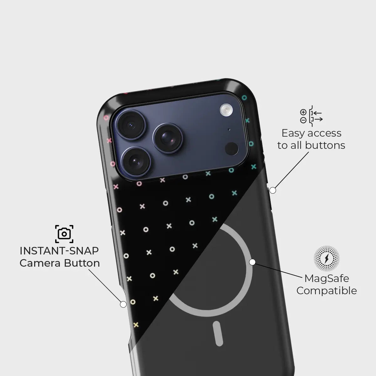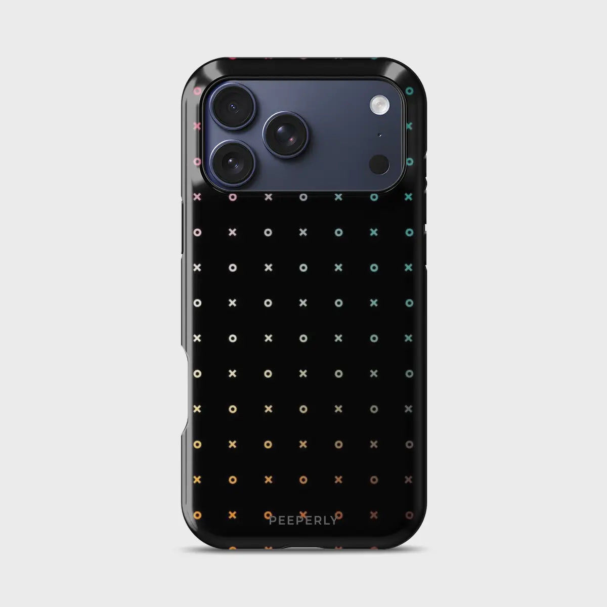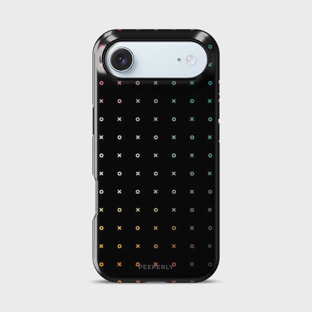 Illuminate your phone with the futuristic shimmer of Holo Cross. A deep black backdrop sets off a sleek grid of holographic crosses that catch the light and shift through a spectrum of colors—like starlight on a midnight sky.