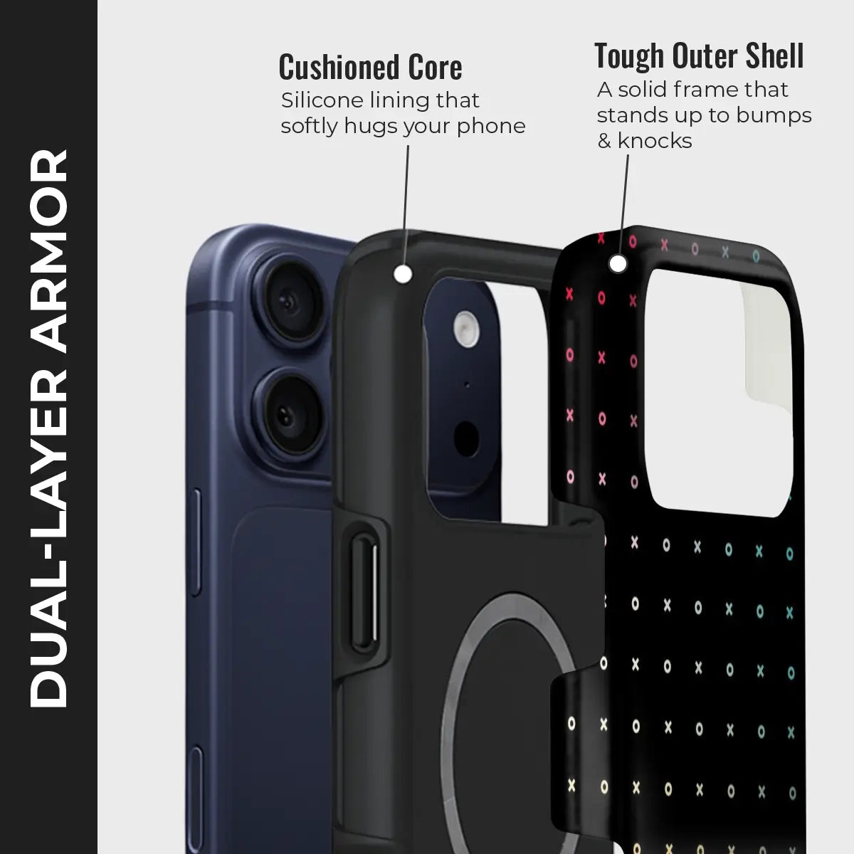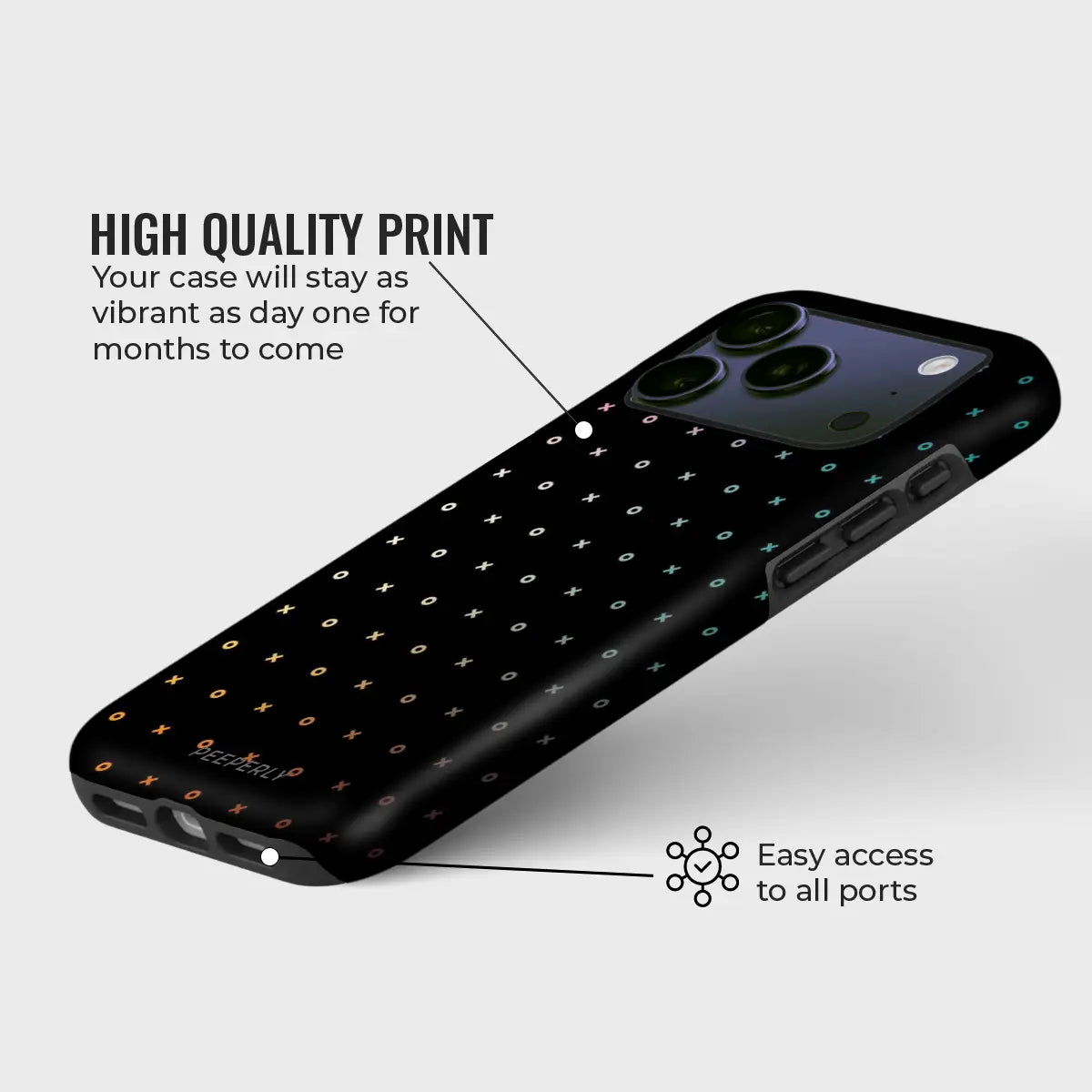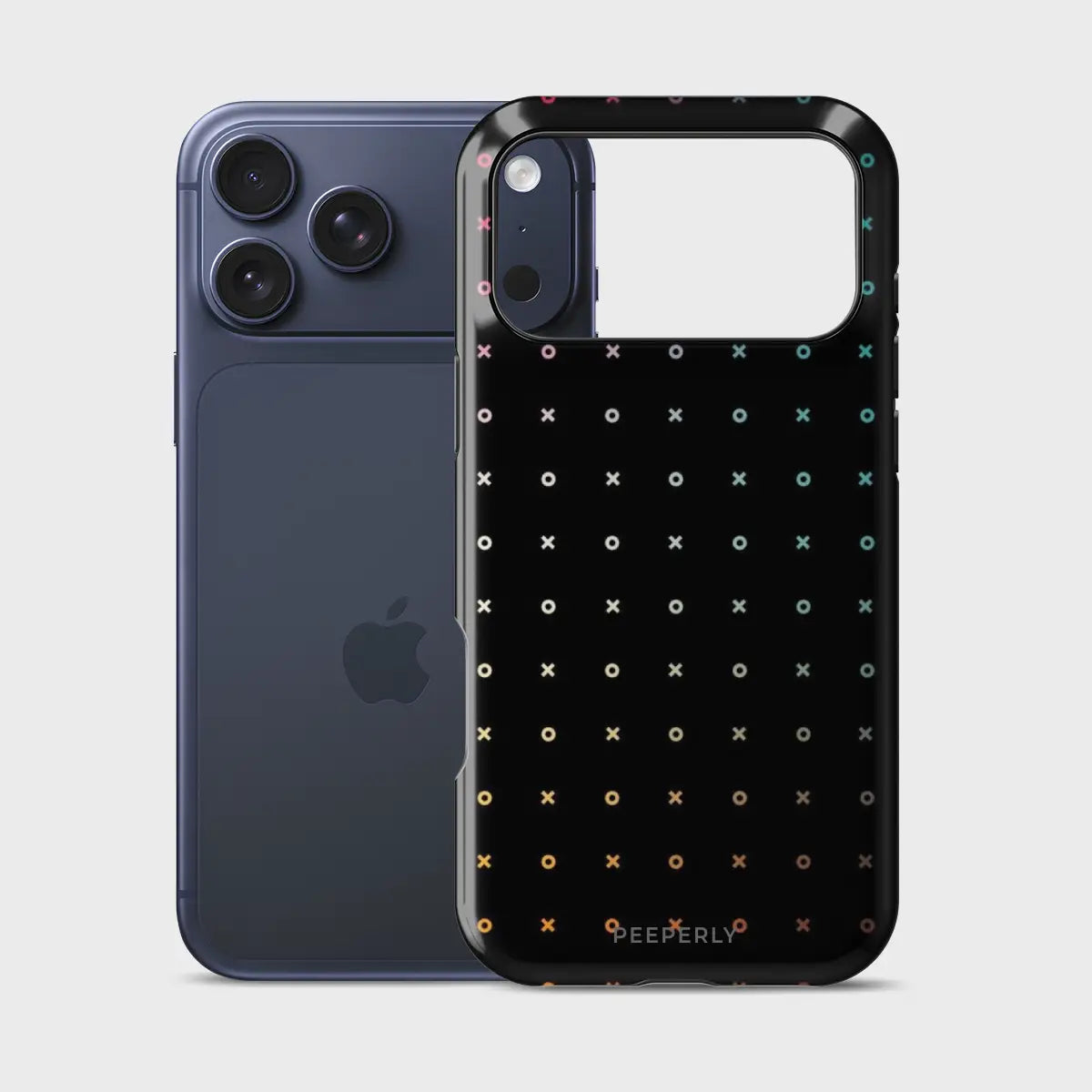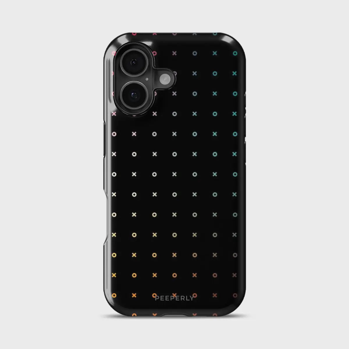 Illuminate your phone with the futuristic shimmer of Holo Cross. A deep black backdrop sets off a sleek grid of holographic crosses that catch the light and shift through a spectrum of colors—like starlight on a midnight sky.
