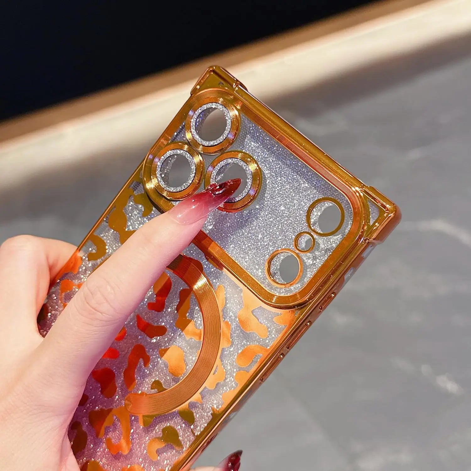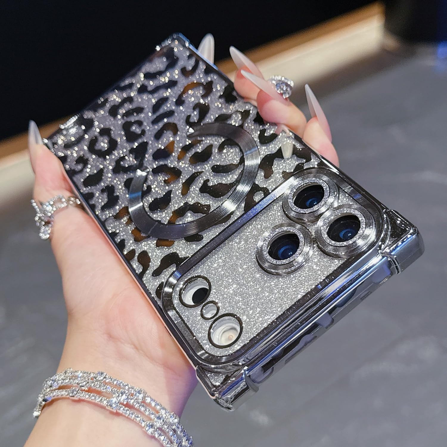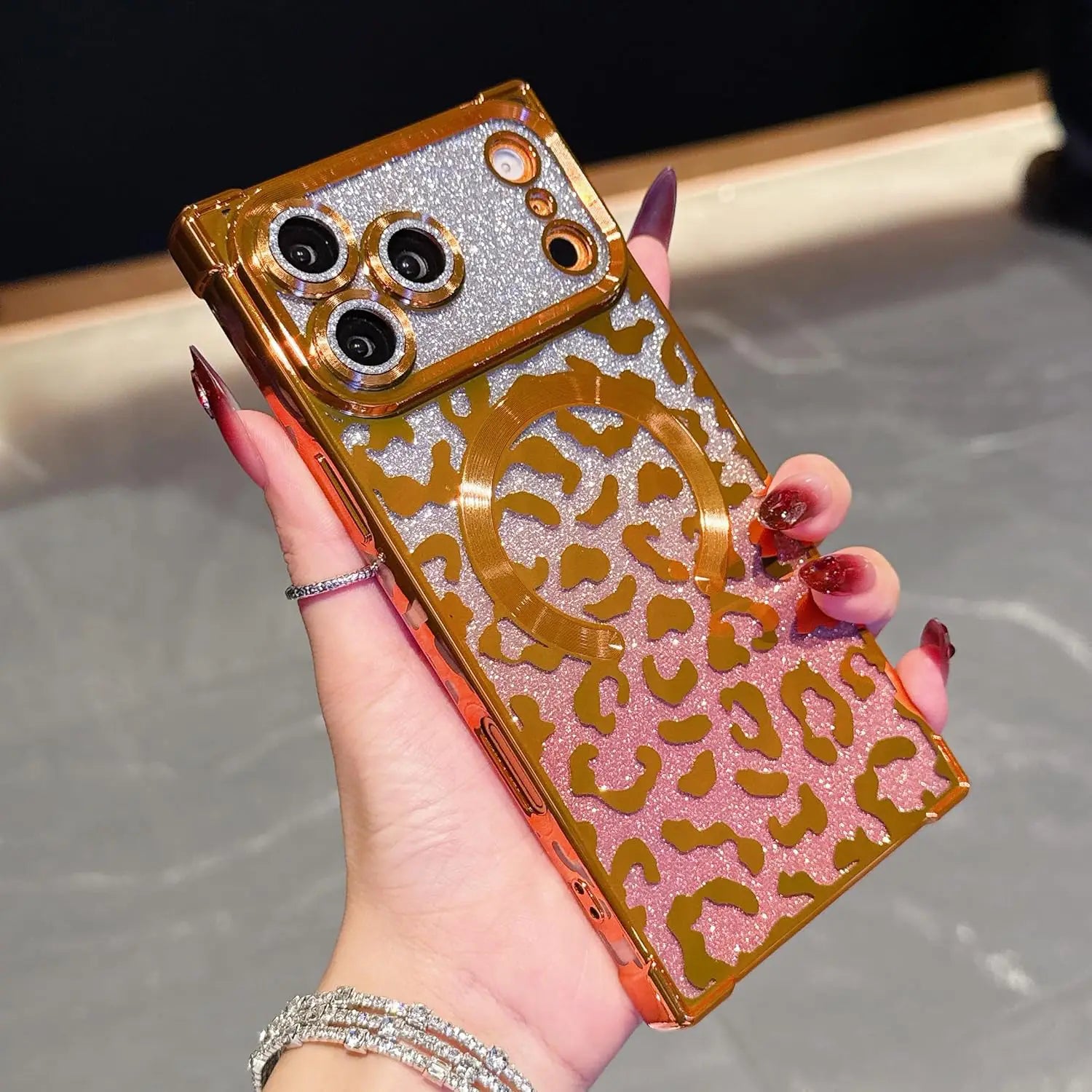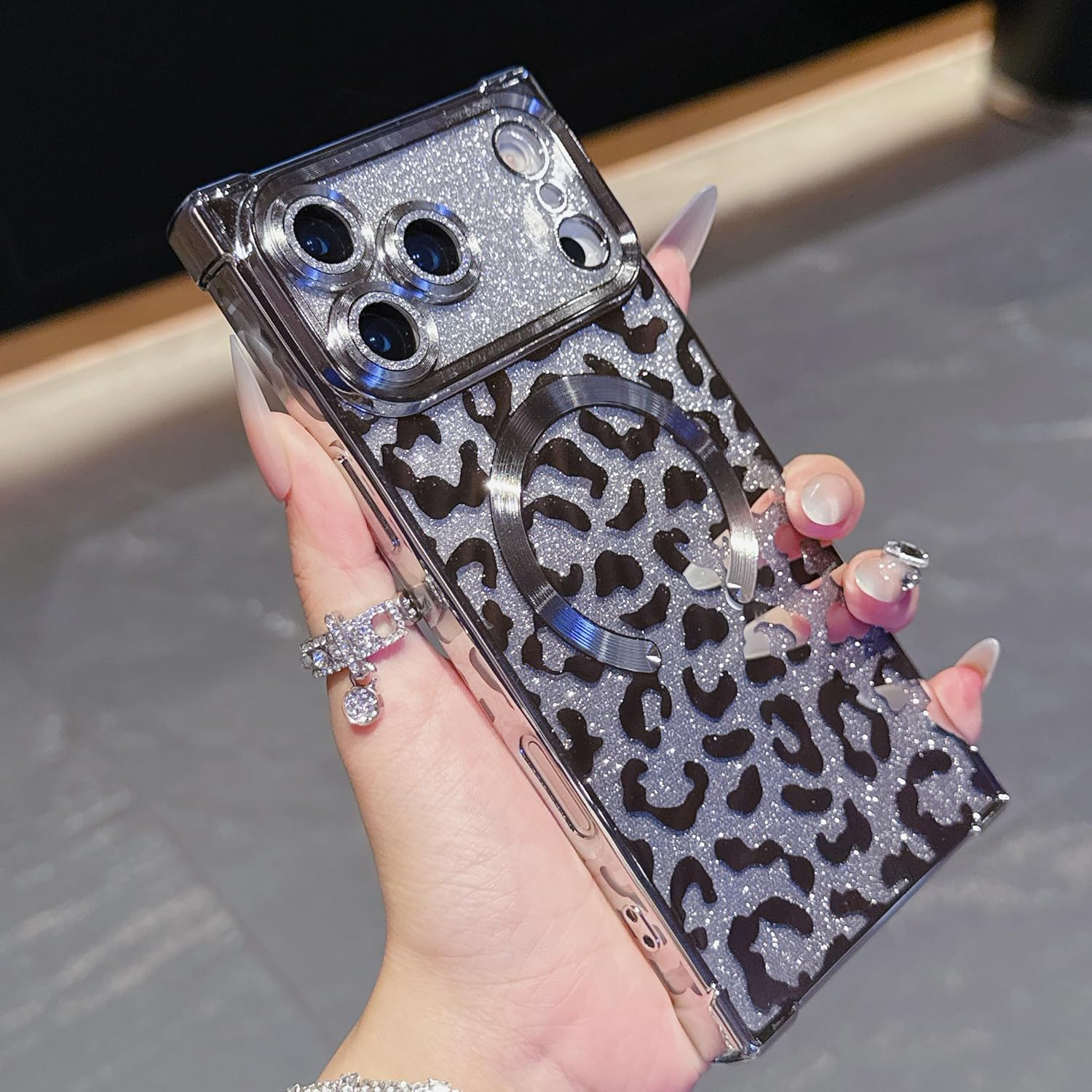 Unleash your bold side with the Wild Luxe Glitter Armor Mag Case, crafted for those who love a perfect mix of glamour and attitude. Featuring a dazzling metallic leopard pattern layered over high-shine glitter, this case turns your phone into a statement accessory.
