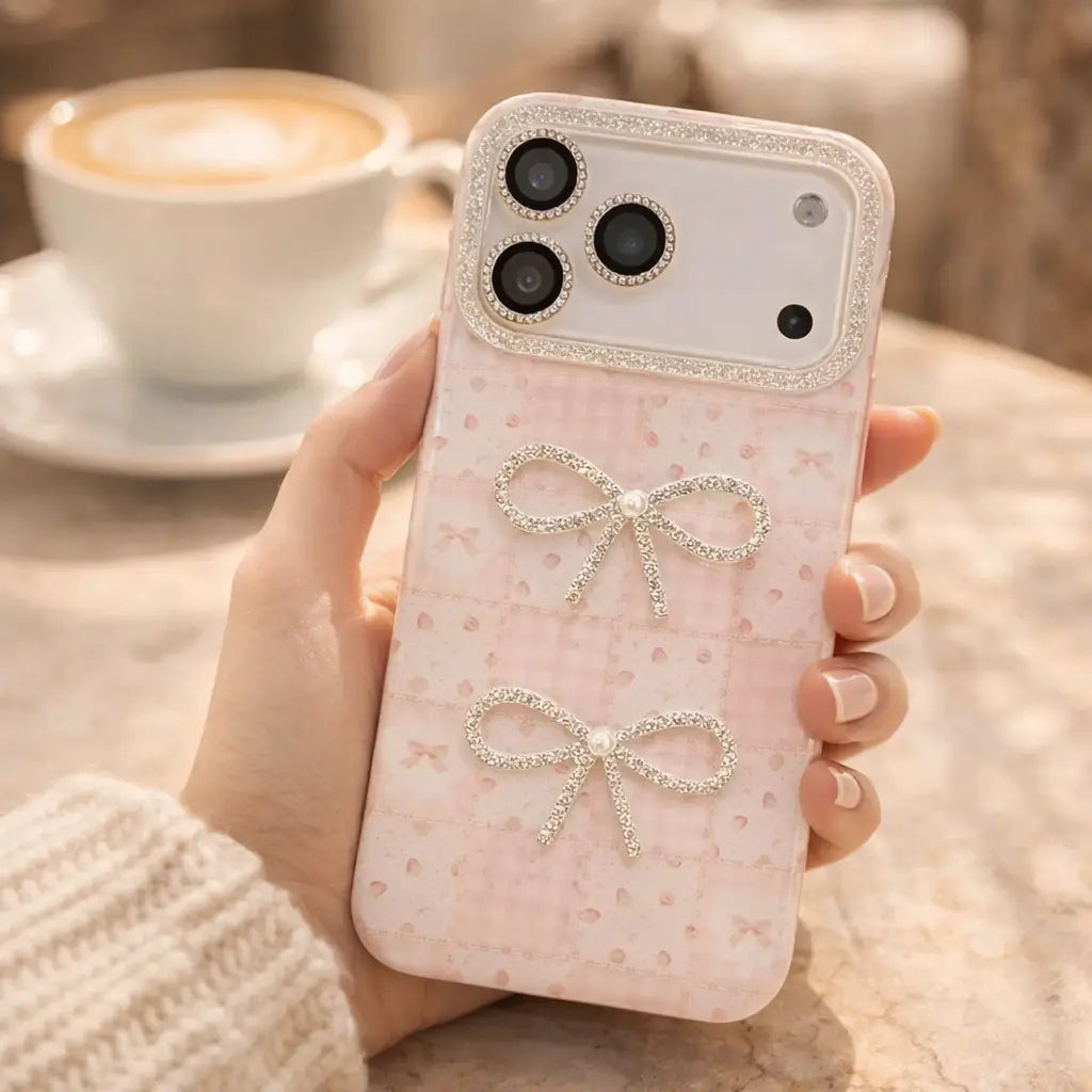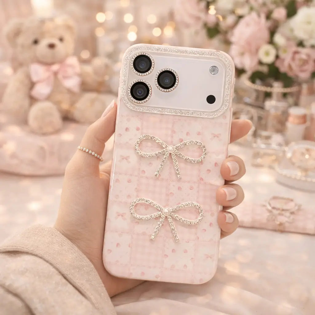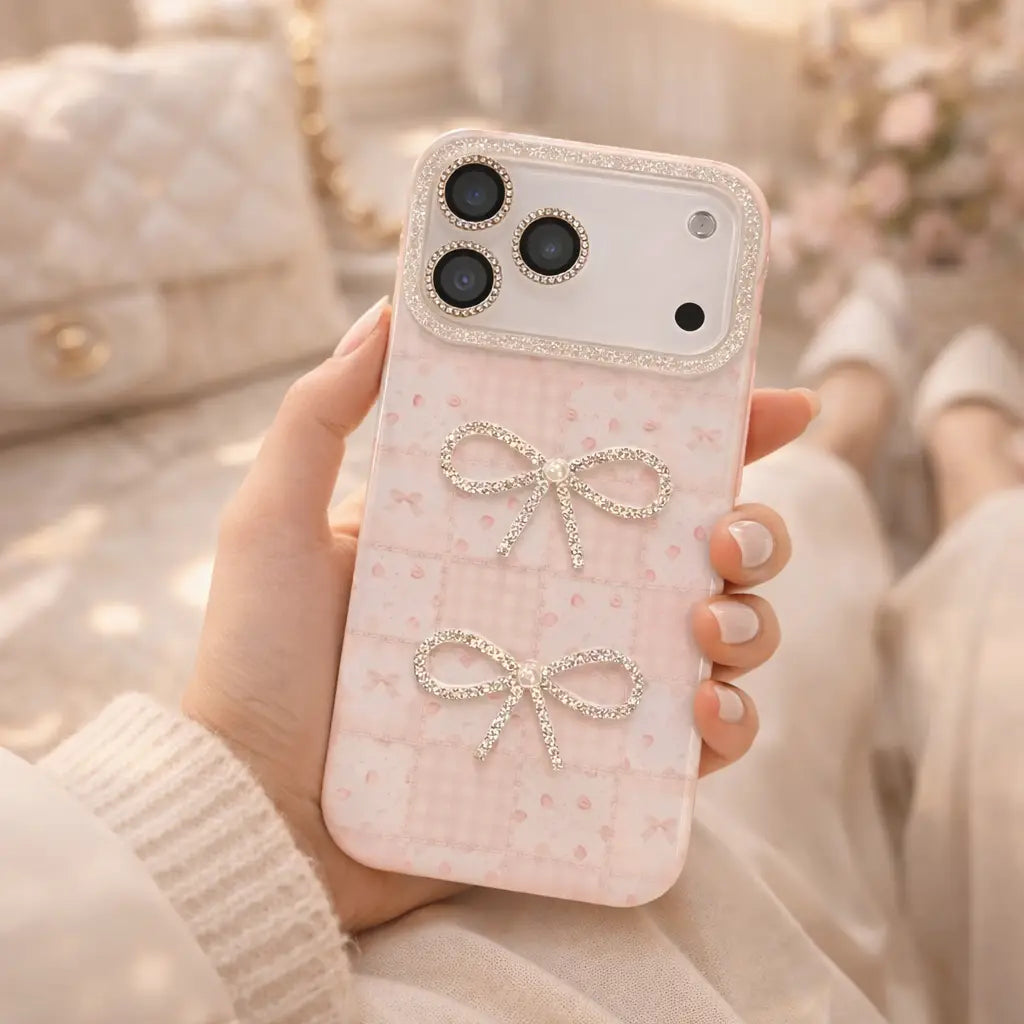 Elevate your phone with the soft charm of the Blush Twin Bow Elegance Case, designed for those who adore a sweet yet sophisticated aesthetic. Featuring a delicate pastel pink patchwork background with subtle patterns, this case is beautifully adorned with two sparkling crystal-studded bows that add a touch of luxury and femininity.