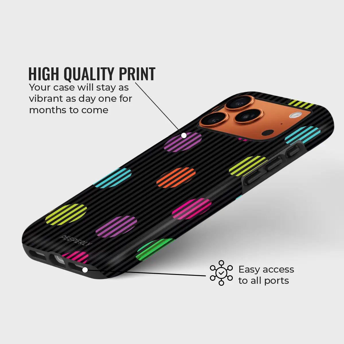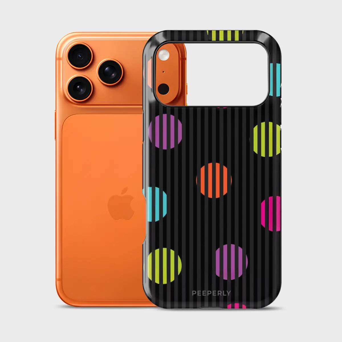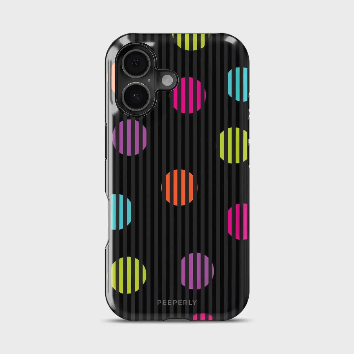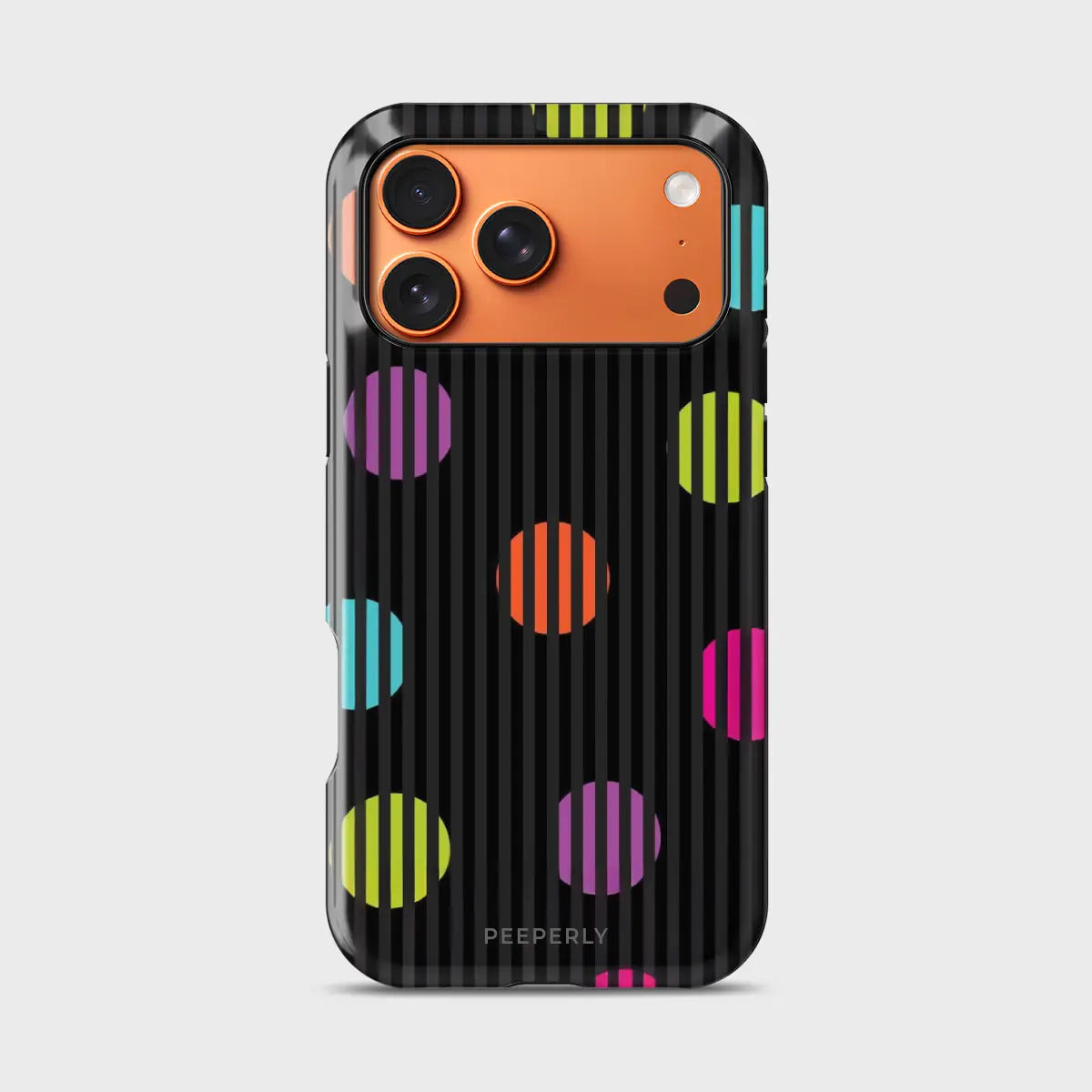 Add a burst of color to your everyday with Dot Pop. This case is a bold remix of retro charm and modern edge — featuring multicolored polka dots that pop against a sleek black background with subtle vertical stripes for added depth. It’s playful, punchy, and impossible to ignore.