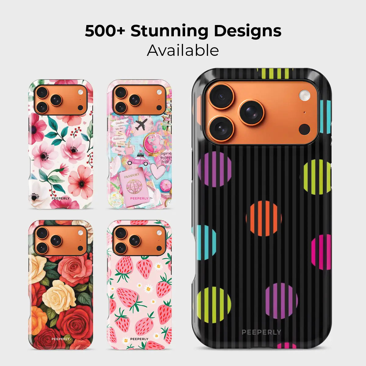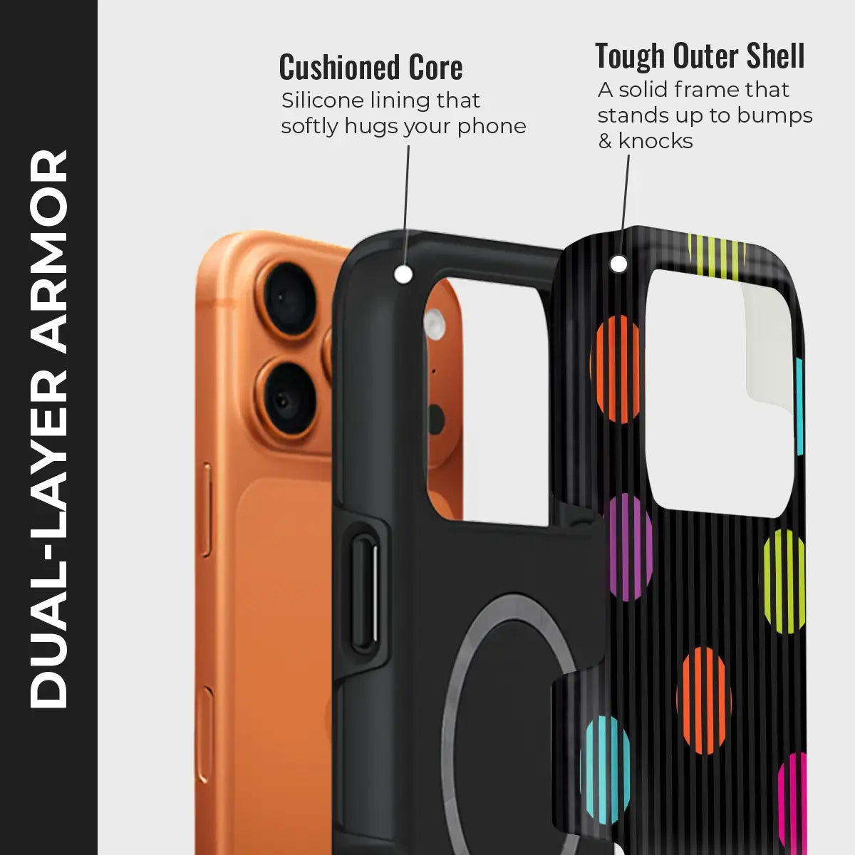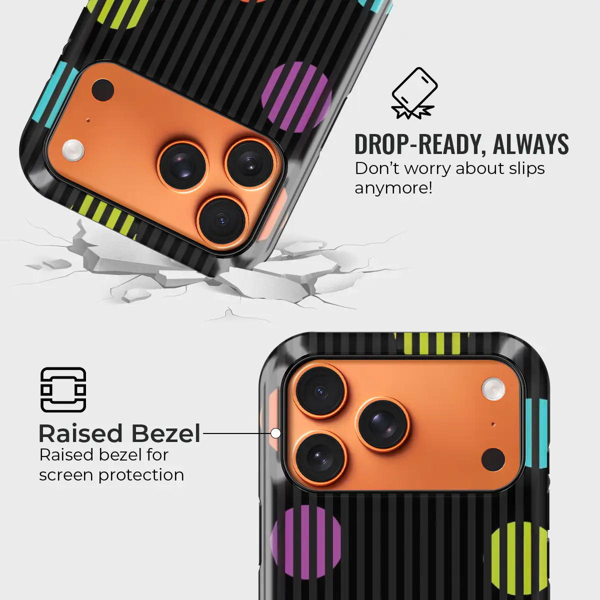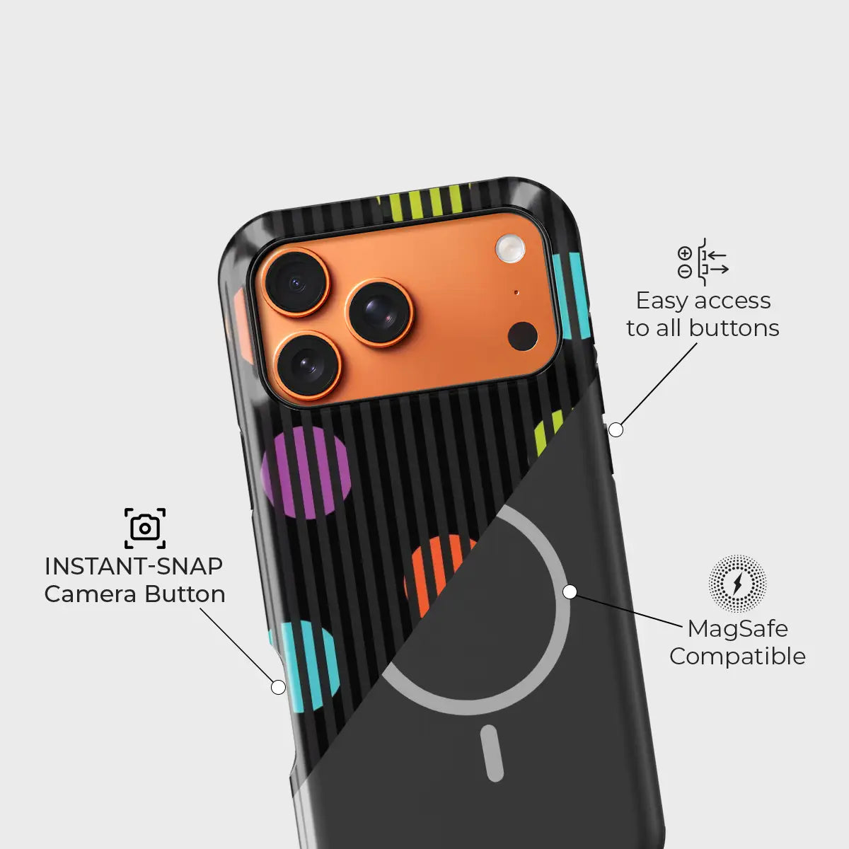Add a burst of color to your everyday with Dot Pop. This case is a bold remix of retro charm and modern edge — featuring multicolored polka dots that pop against a sleek black background with subtle vertical stripes for added depth. It’s playful, punchy, and impossible to ignore.