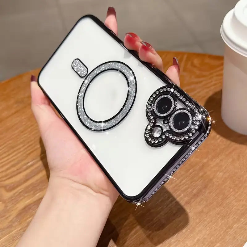 Inspired by the soft glow of sunset, this dazzling case features a golden gradient with a fine glitter finish that shimmers beautifully under any light. The chrome metallic edges and MagSafe-compatible ring add a touch of elegance and practicality, ensuring your phone looks as flawless as it performs.