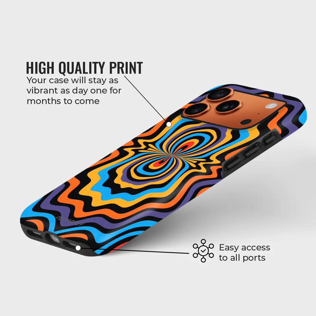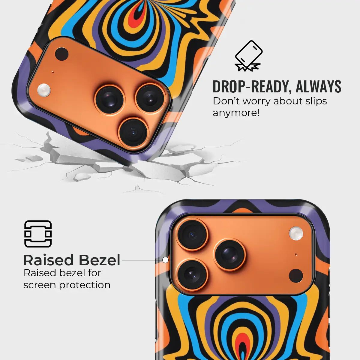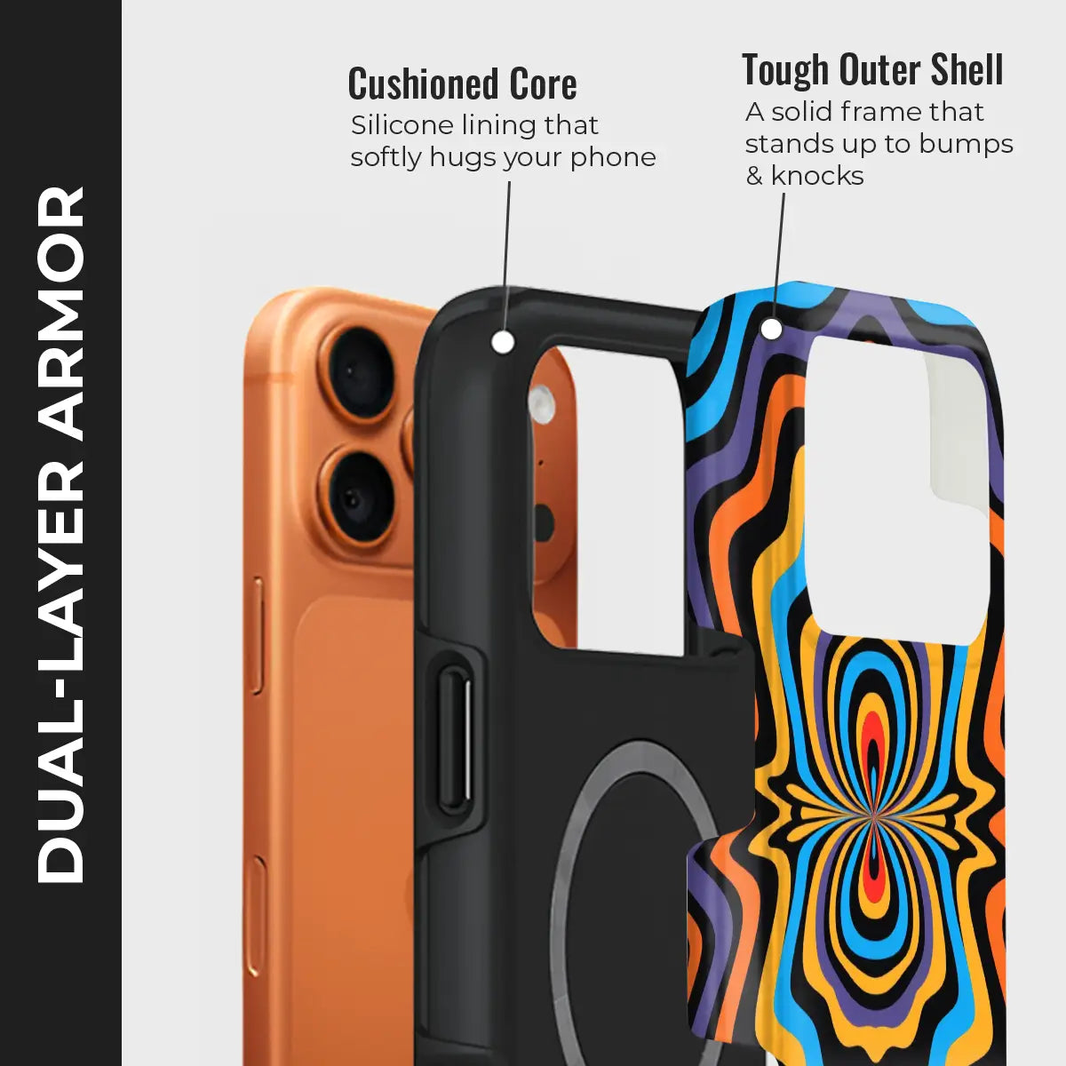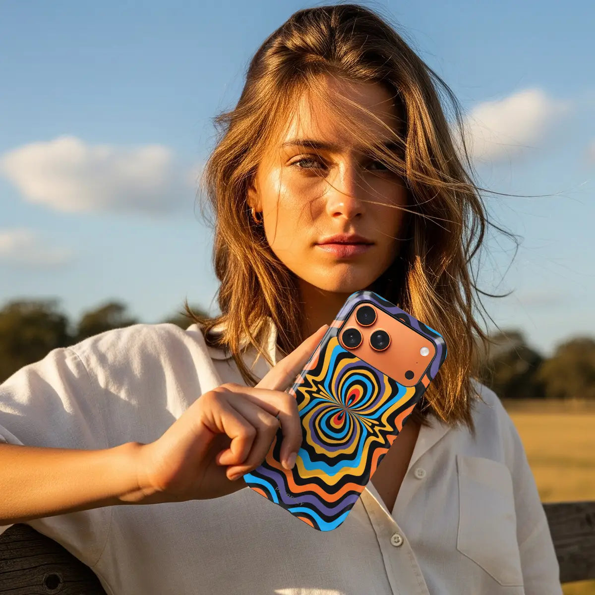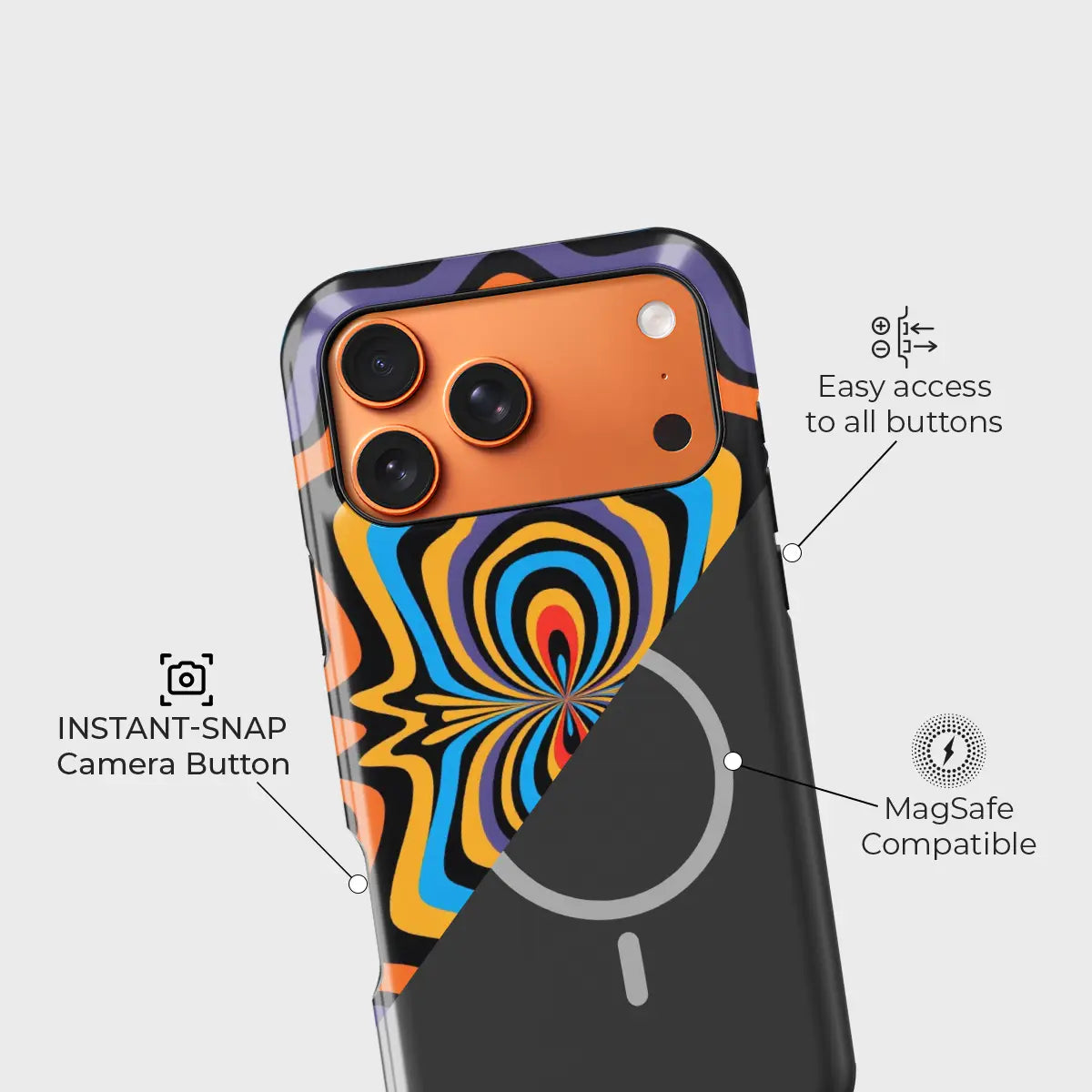 Dare to stand out with OptiCore, a phone case that bends perception and electrifies your style. Featuring a mesmerizing optical illusion pattern in vibrant shades of orange, blue, purple, and yellow, this design radiates energy from the core outward — like a pulse of pure visual power.