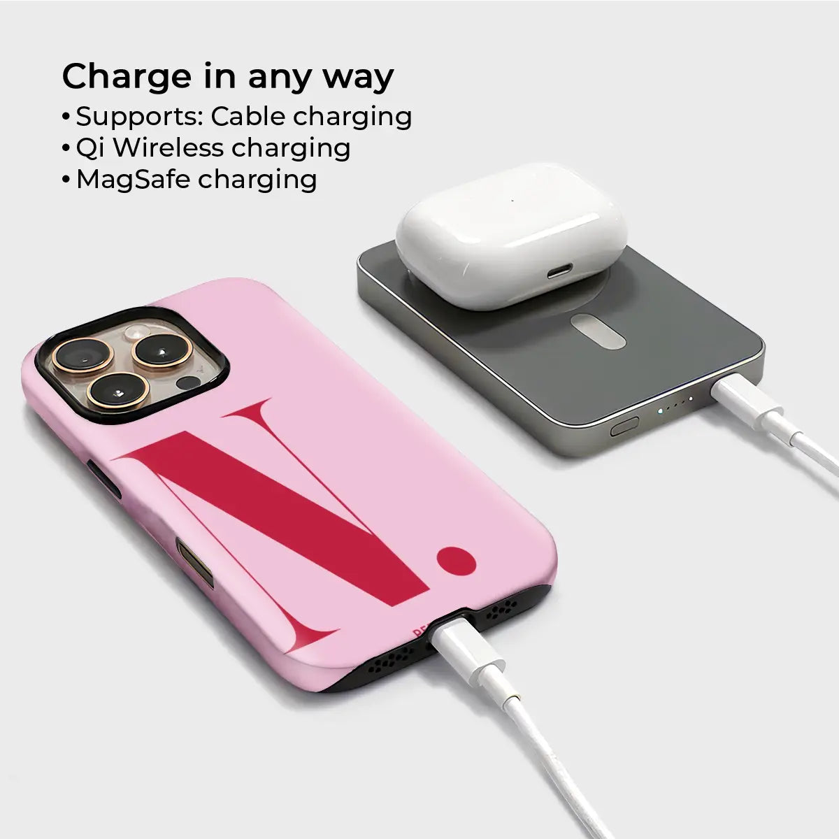 Bold, confident, and effortlessly polished, the Nicole phone case turns a classic initial into a statement of modern elegance. Featuring a rich crimson-red base paired with a soft blush “N,” this design captures attention while maintaining a refined, feminine balance.