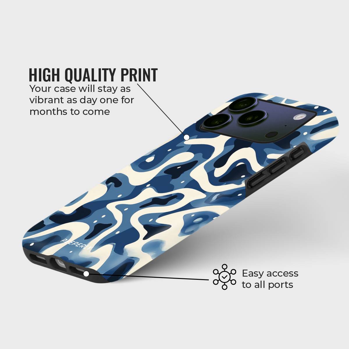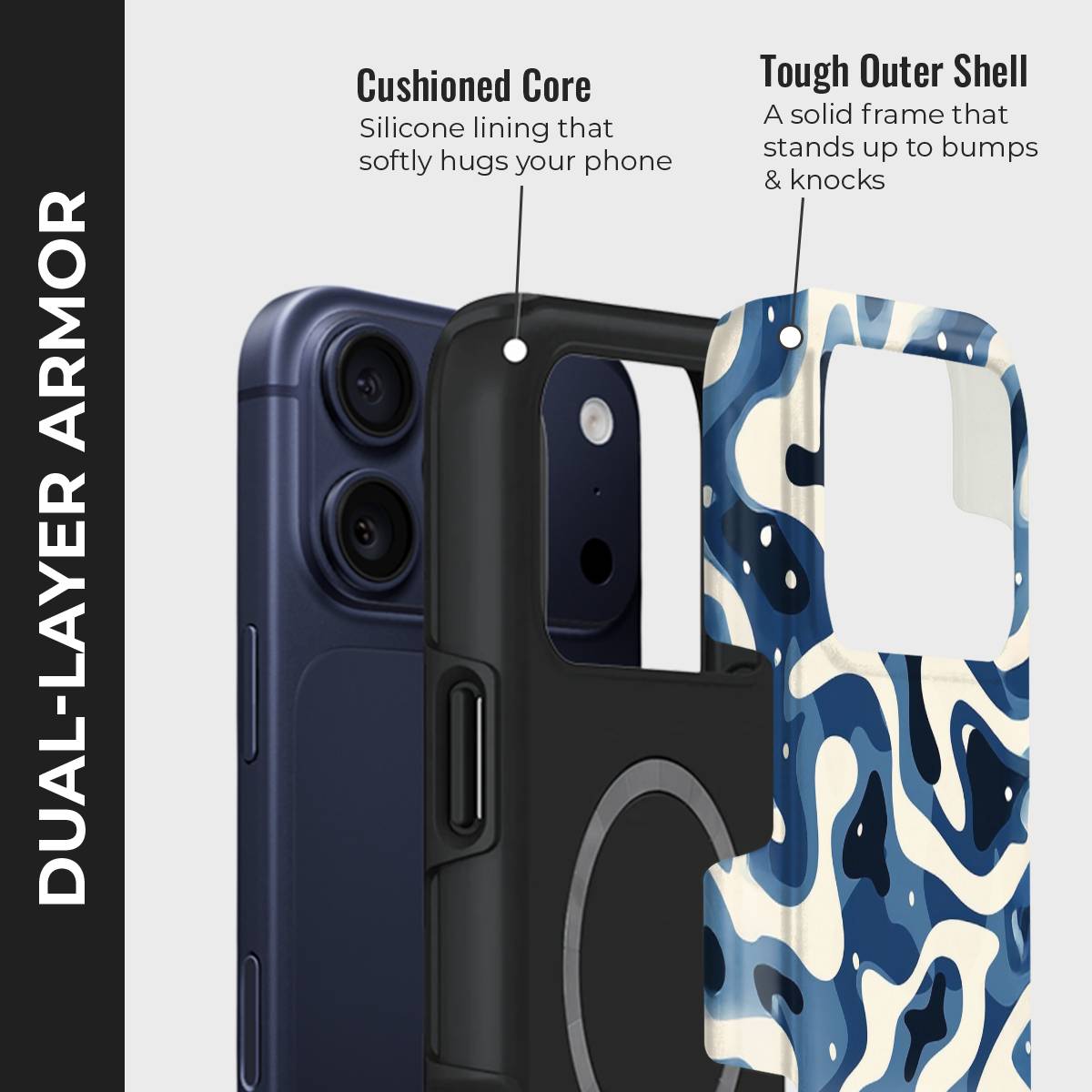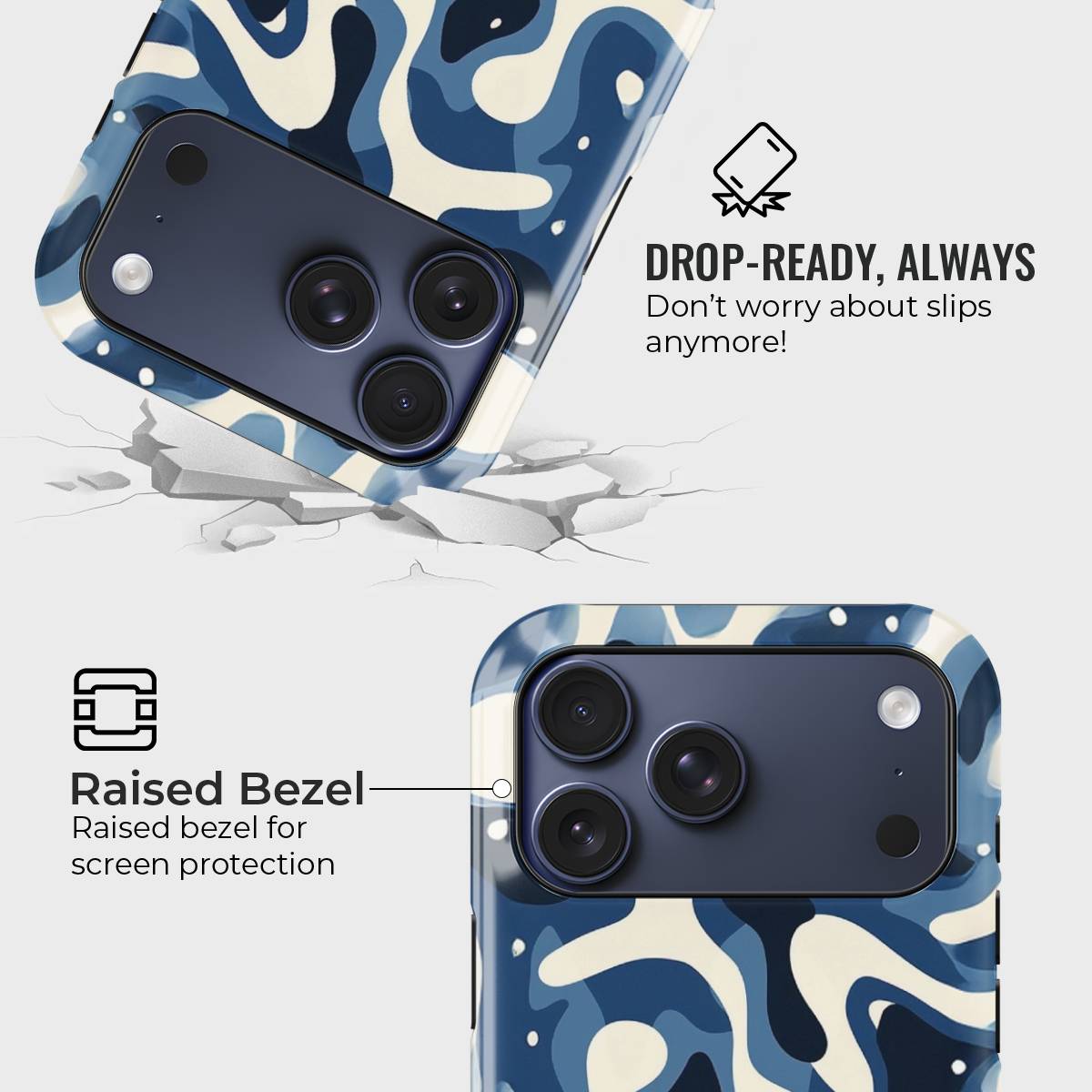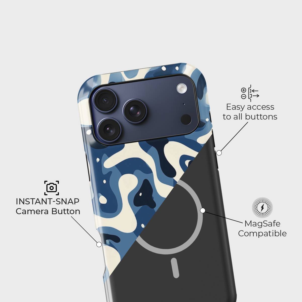 Dive into the deep with Tidal Drift, a bold and fluid design inspired by the restless rhythm of ocean currents. Featuring a mesmerizing blend of navy, cream, and blue abstract waves, this case captures the movement of water in a modern, camo-like pattern that feels both fierce and effortlessly cool.