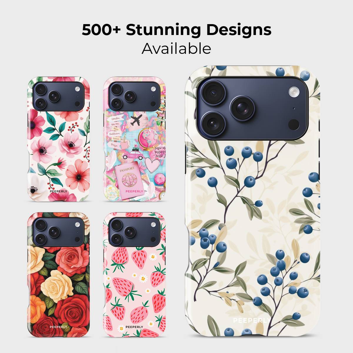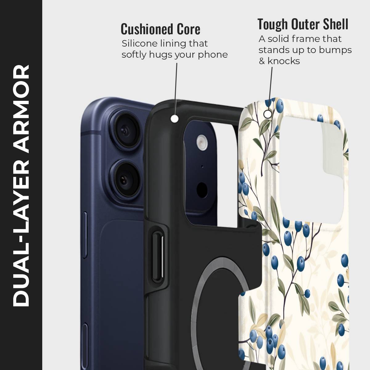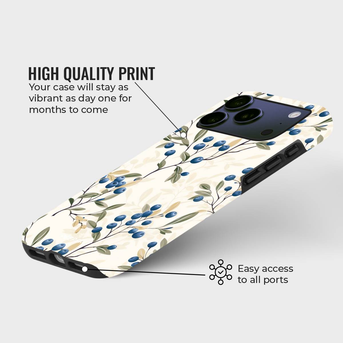 Bring the charm of nature to your phone with the Wild Berries case. This design features delicate branches adorned with lush green leaves and clusters of deep-blue berries, set against a soft, cream-toned background. The botanical illustration exudes a fresh, countryside elegance—perfect for anyone who loves the serene beauty of nature.