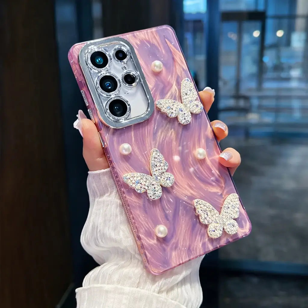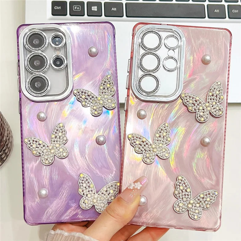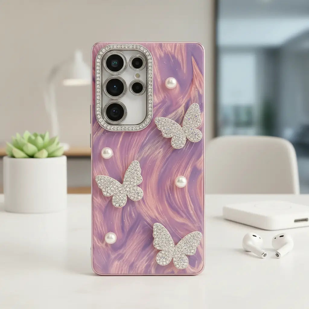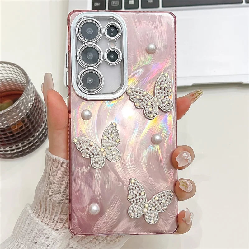 Step into a world of soft shimmer and timeless elegance with the Aurora Butterfly Pearl Glow Case. Designed to captivate, this case features a luminous aurora finish adorned with crystal-studded butterfly accents and delicate pearl details.
