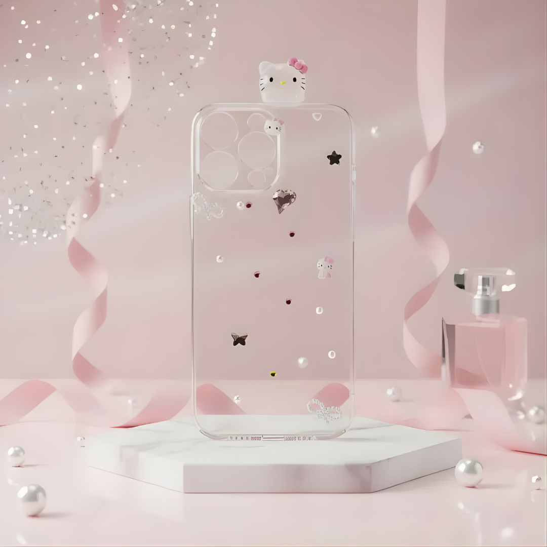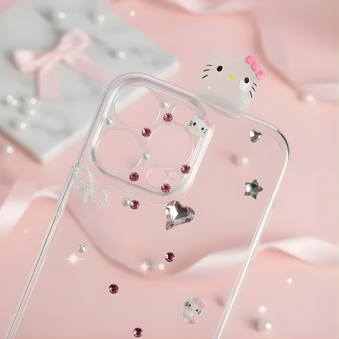 This dazzling phone case features an adorable 3D kitty charm surrounded by sparkling crystals, tiny pearls, and delicate bows, giving your phone a true princess-worthy makeover. The clear base with a pink backdrop lets your phone’s beauty shine through while adding a touch of luxury and fun.