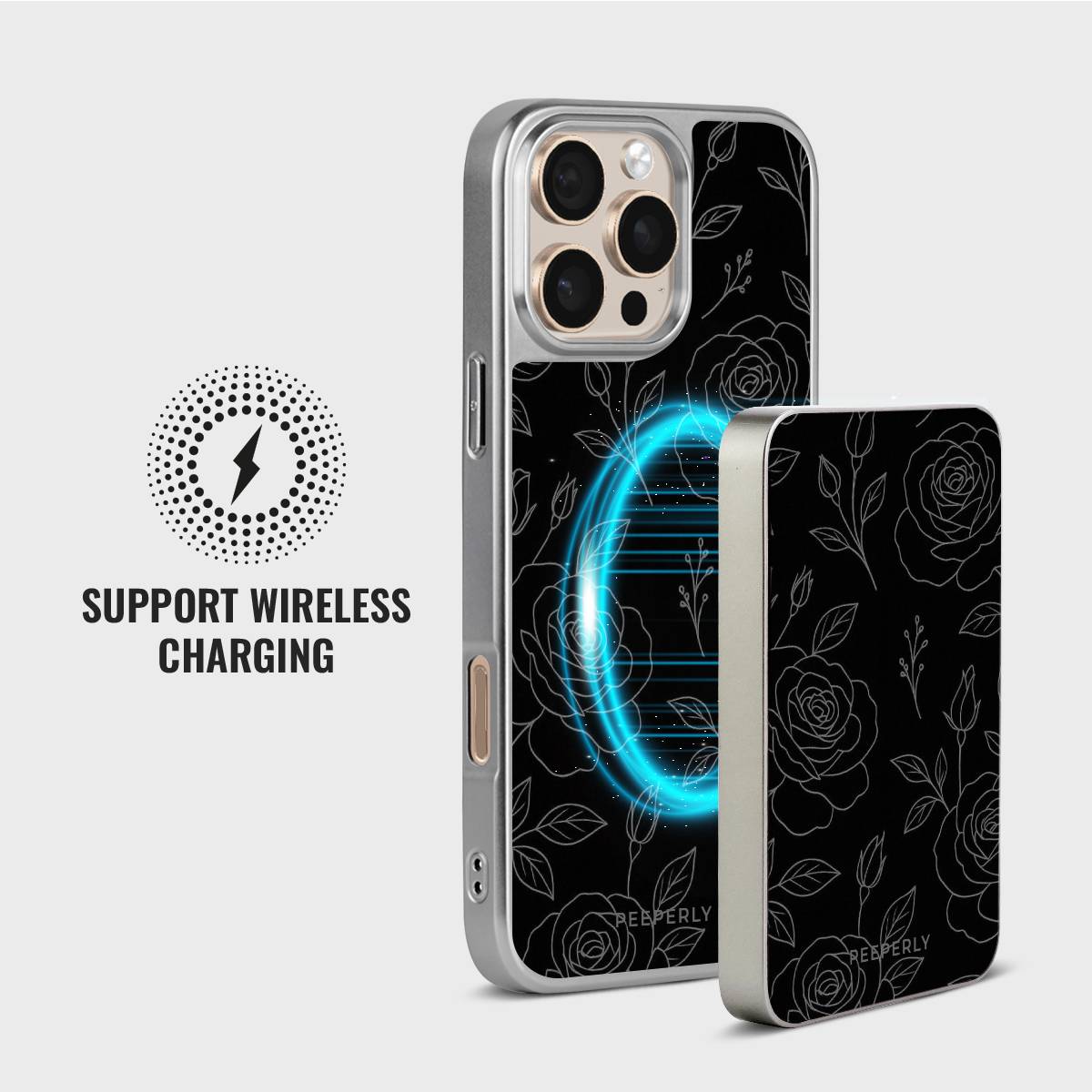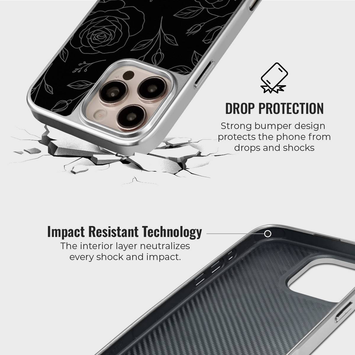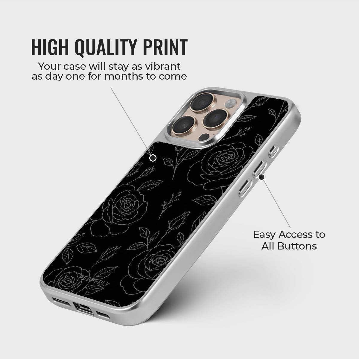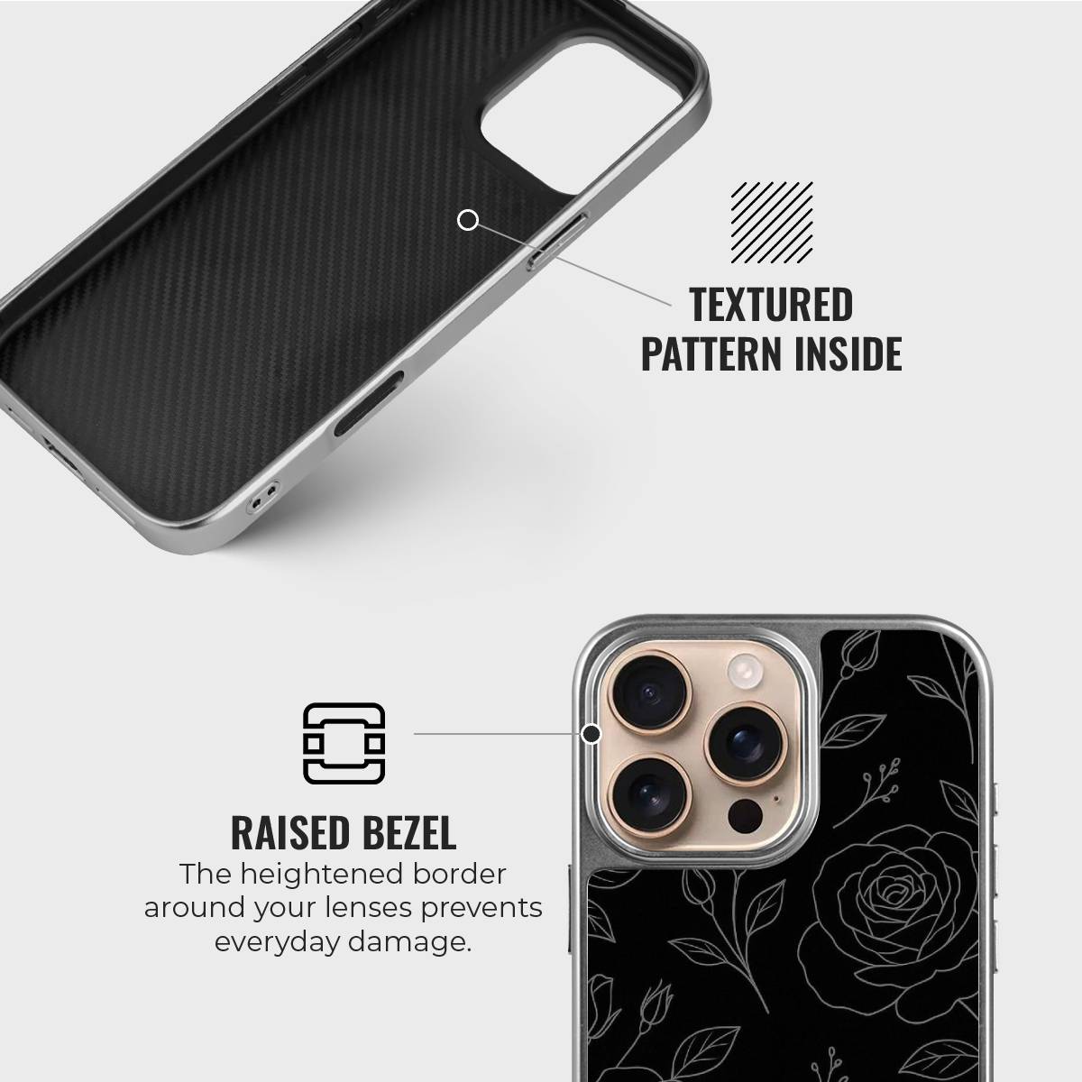 Rose Filigree is a refined case that turns your phone into a piece of modern jewelry. Delicate silver rose linework blooms over deep black, blending lace-like elegance with a luxe, glossy shine. Sleek, detailed, and irresistibly sophisticated.
