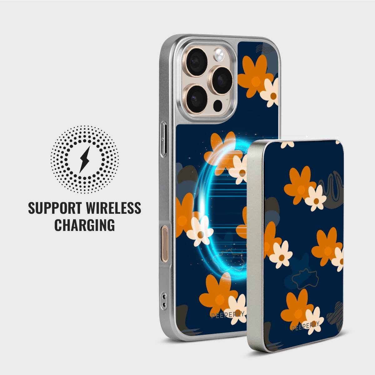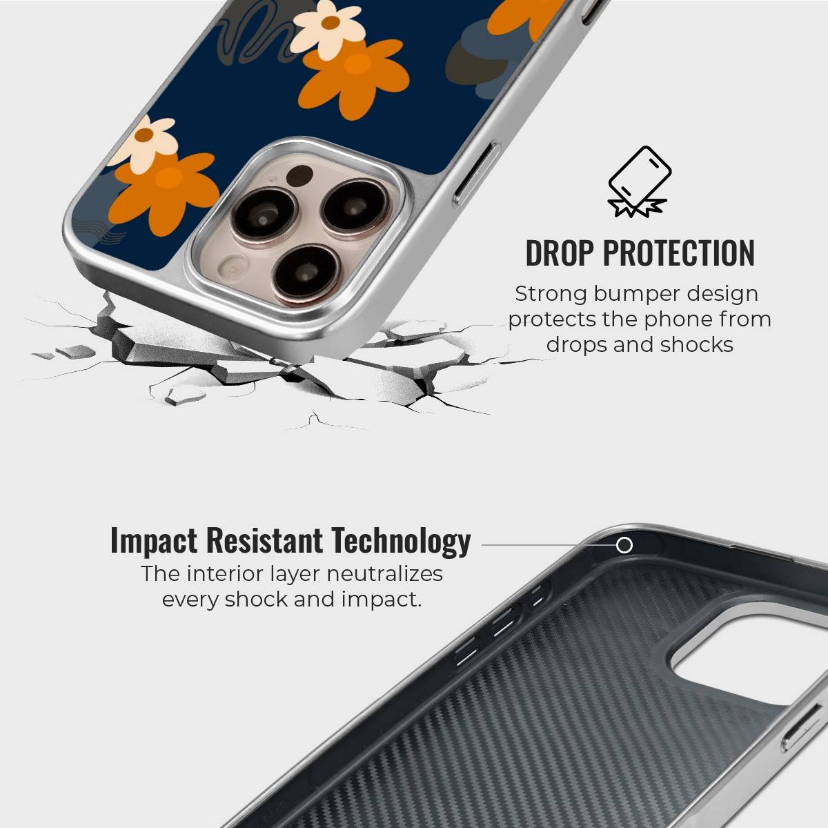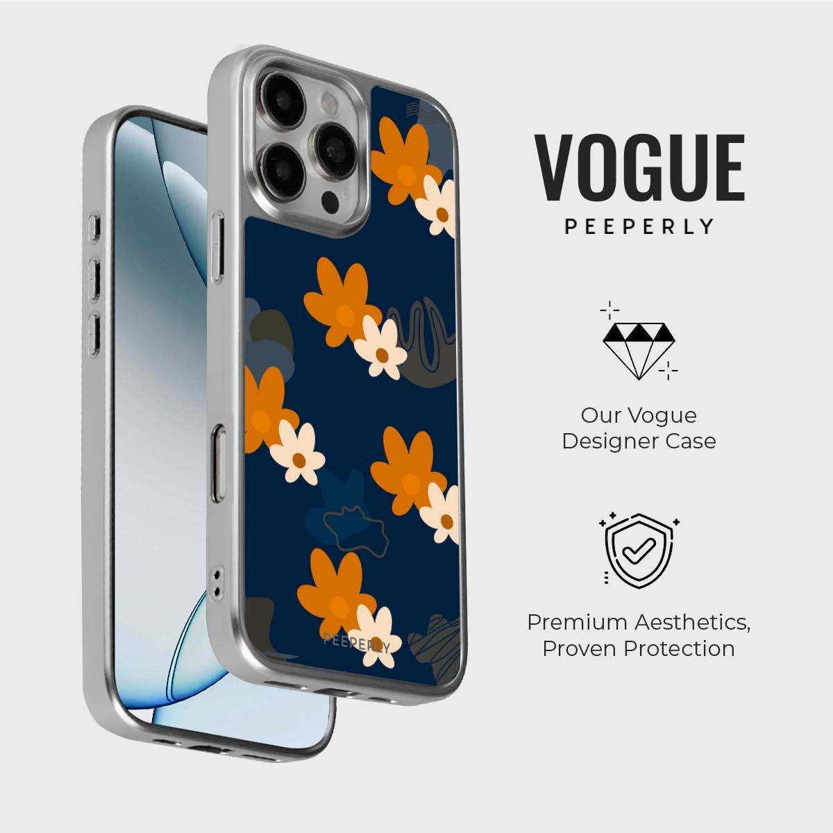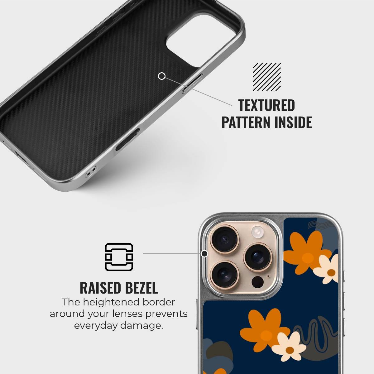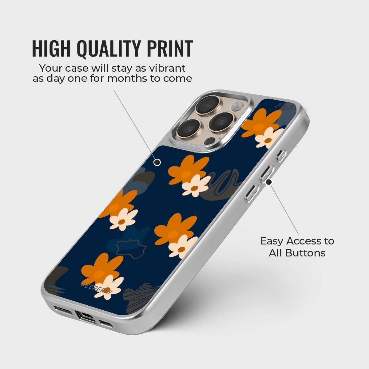 Urban Blossom is a city-chic case that brings modern florals to the midnight streets. Vibrant orange blooms and soft cream petals pop against a deep indigo backdrop, while abstract charcoal doodles add an artsy, metro-cool twist.