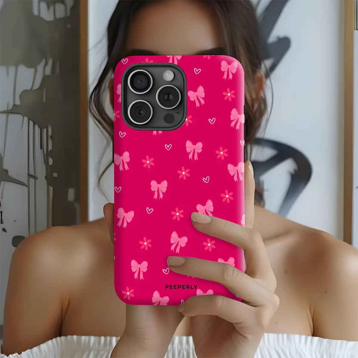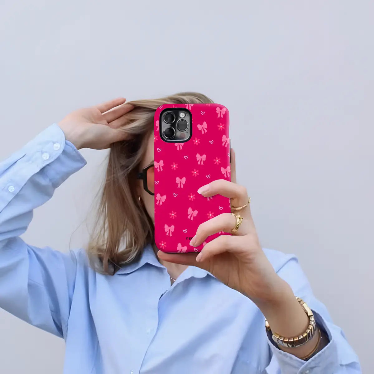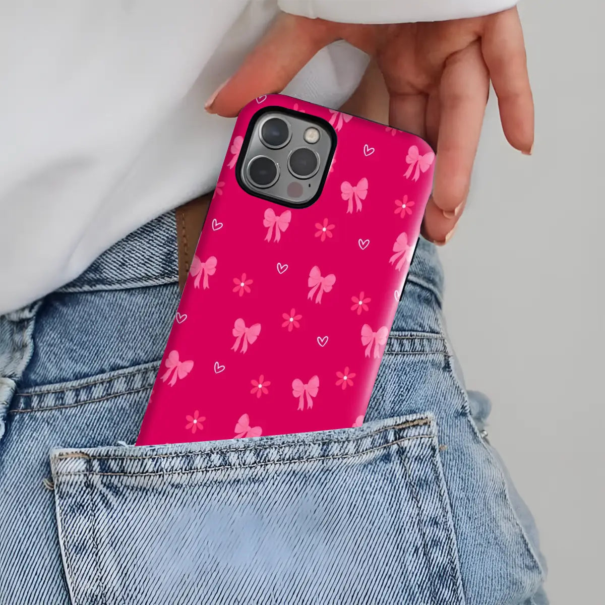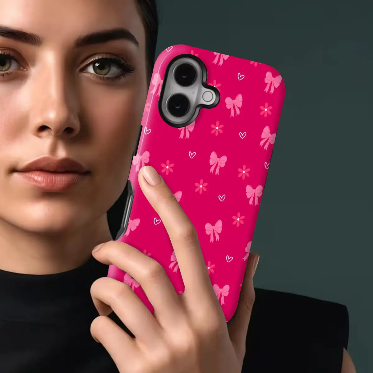 Bow Crush is a playful phone case featuring bright pink tones decorated with charming bow and heart details. The cheerful pattern adds a fun, flirty vibe while keeping the look cute and stylish. Finished with a smooth, durable design for everyday protection, Bow Crush is perfect for anyone who loves bold color and sweet, feminine charm.