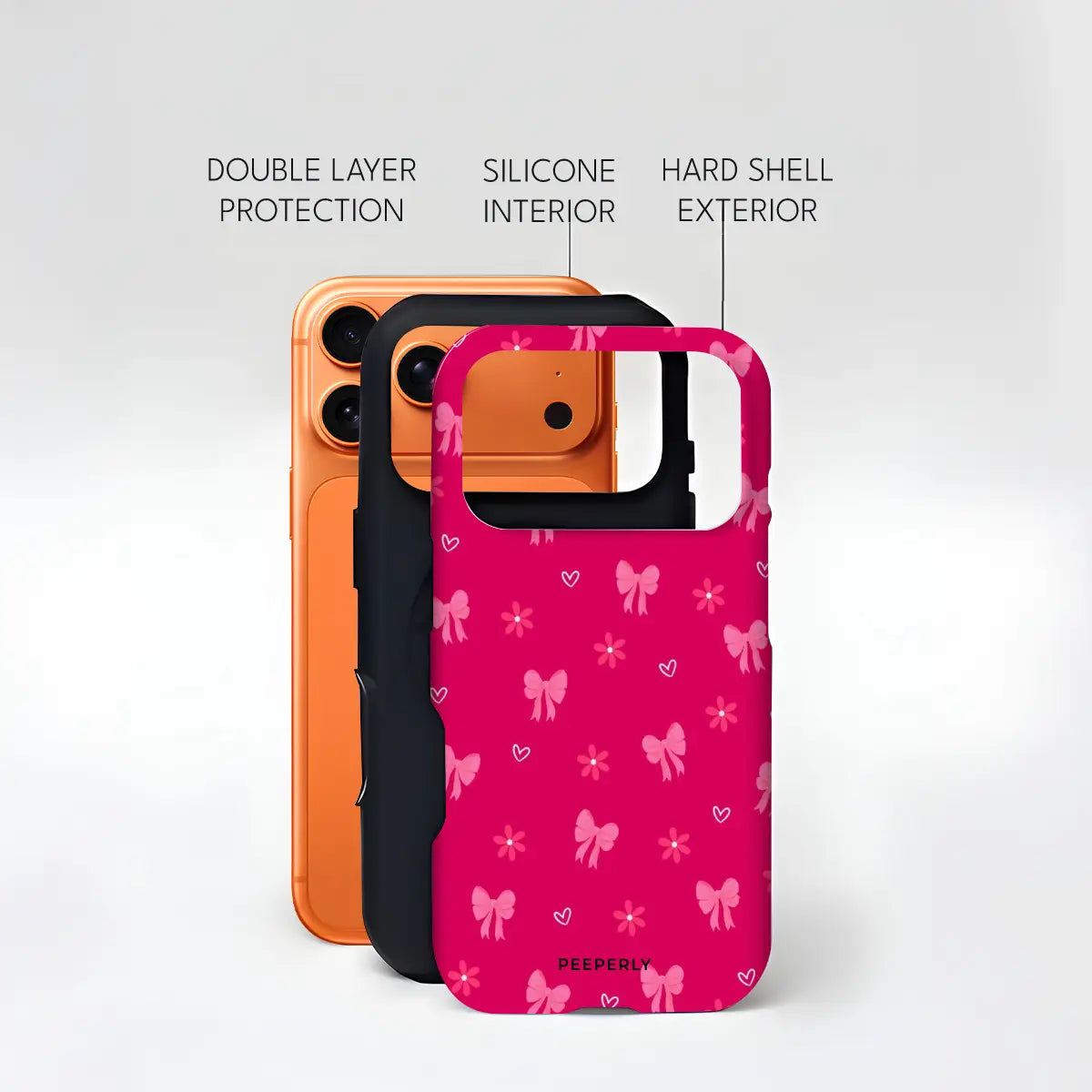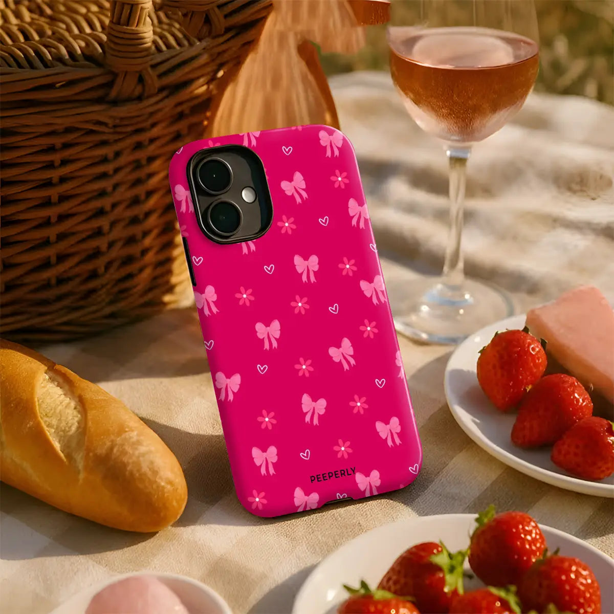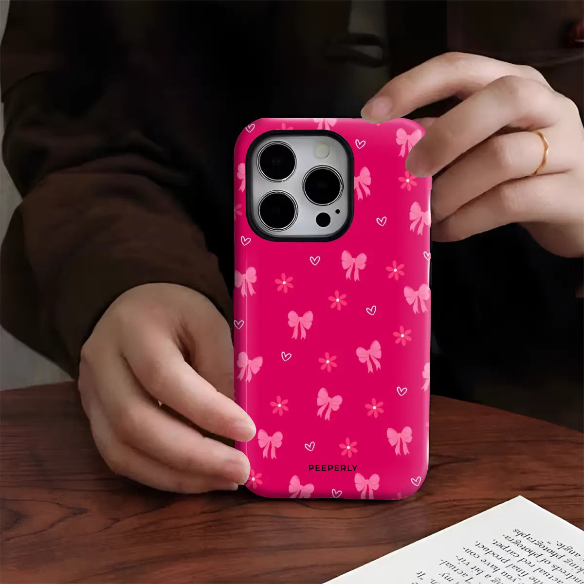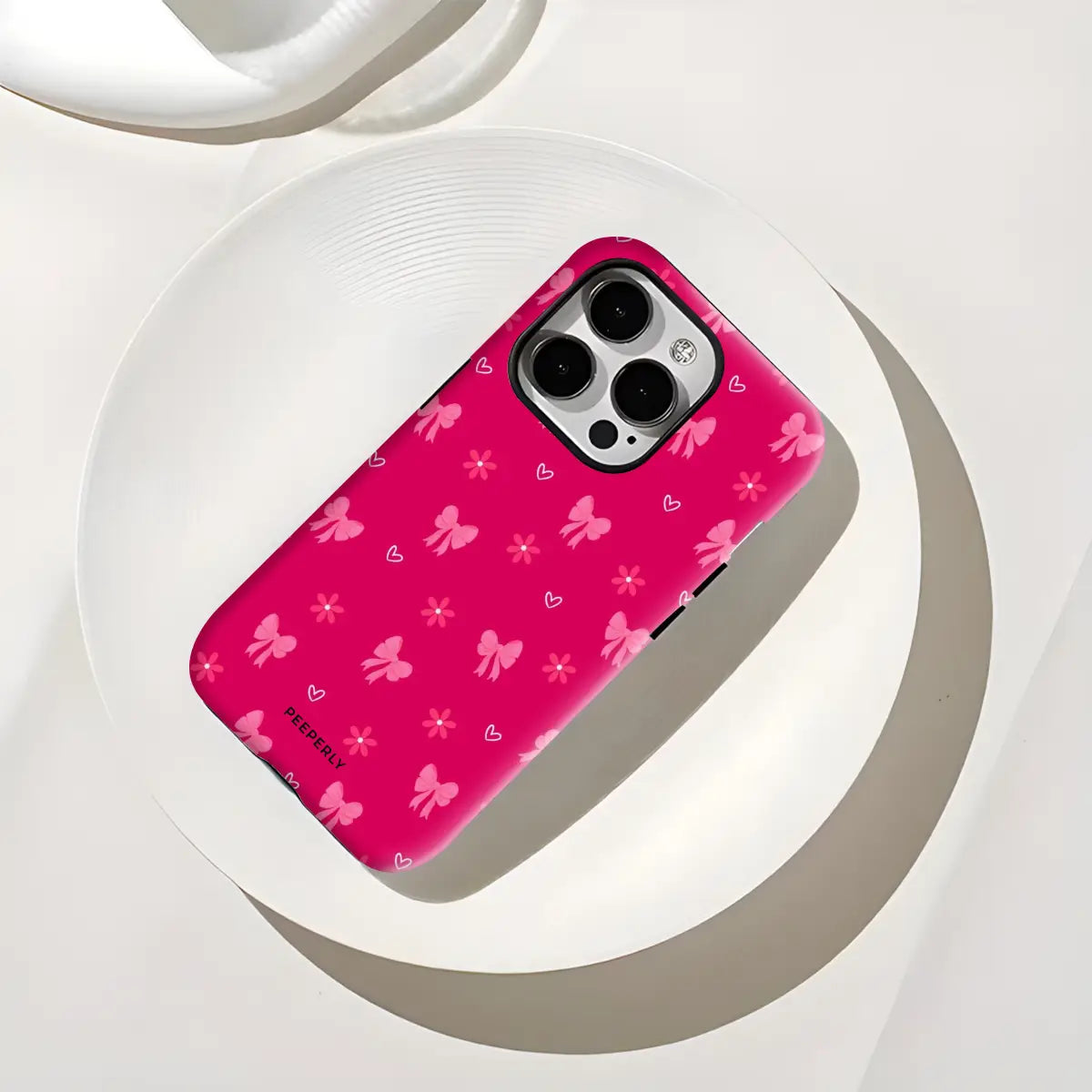 Bow Crush is a playful phone case featuring bright pink tones decorated with charming bow and heart details. The cheerful pattern adds a fun, flirty vibe while keeping the look cute and stylish. Finished with a smooth, durable design for everyday protection, Bow Crush is perfect for anyone who loves bold color and sweet, feminine charm.