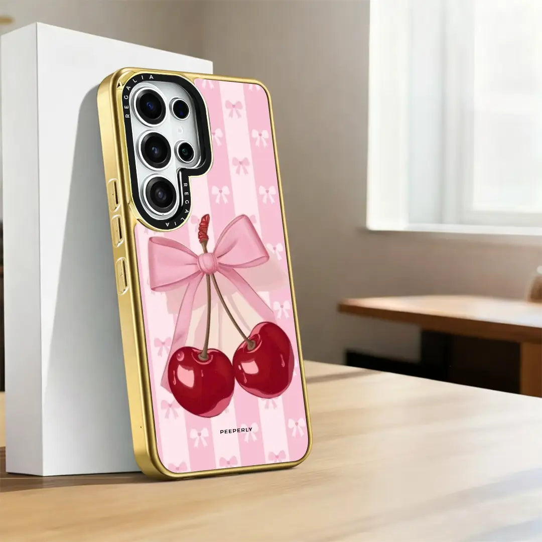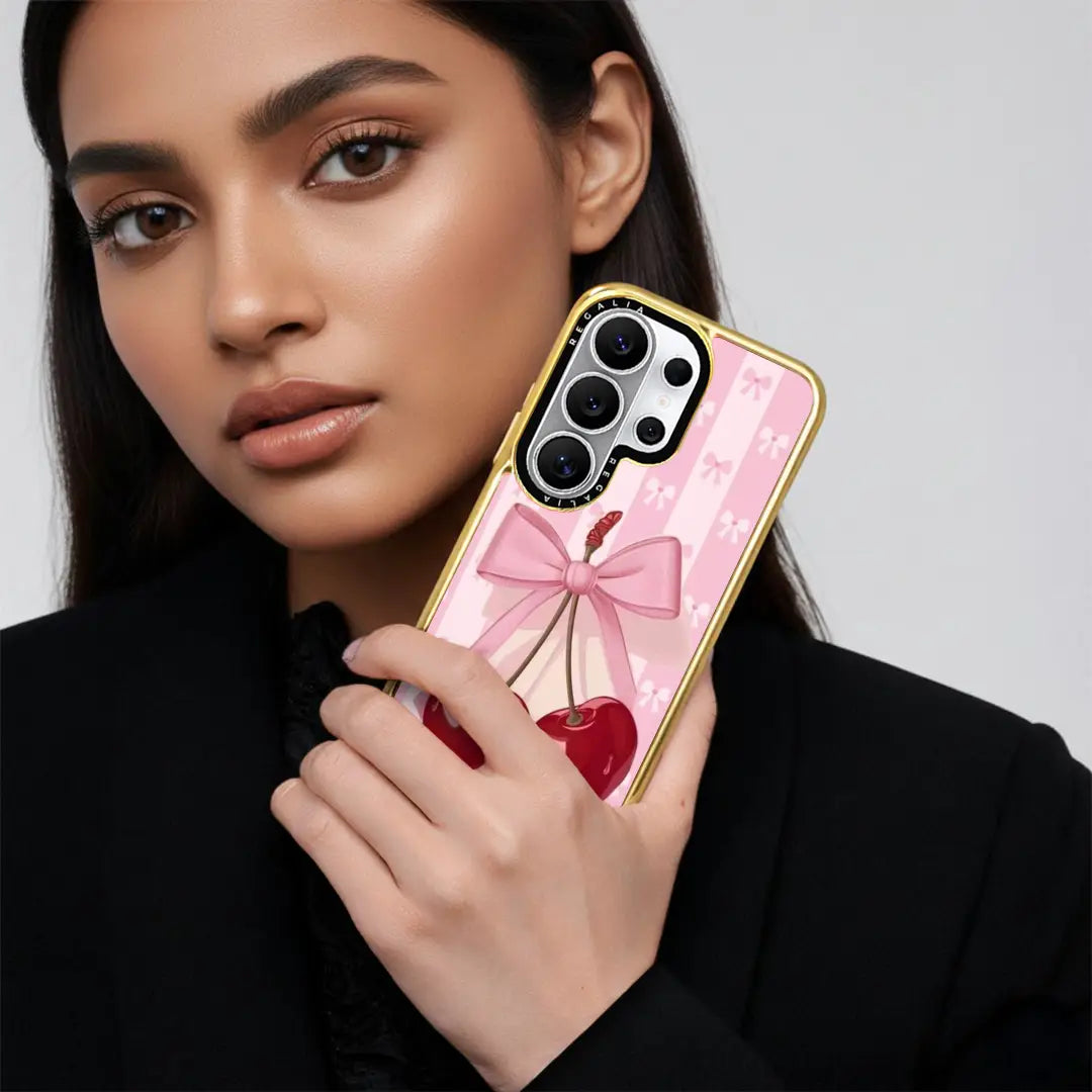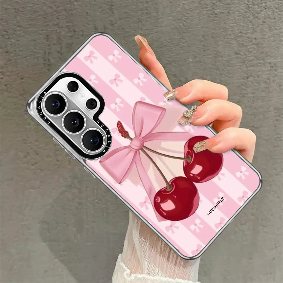 Sweet, playful, and full of charm — the Cupid Berry Bow Case brings a delightful touch of romance to your everyday style. Featuring glossy red cherries tied together with a soft pink ribbon bow, this design sits beautifully on a pastel striped backdrop sprinkled with tiny bows for an extra dose of sweetness.