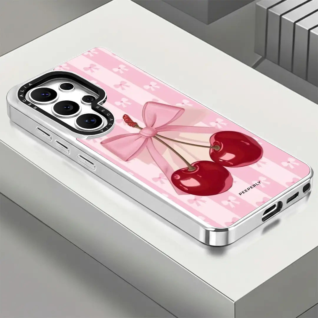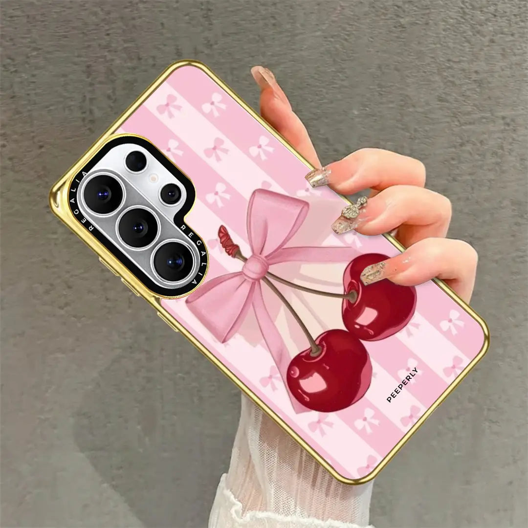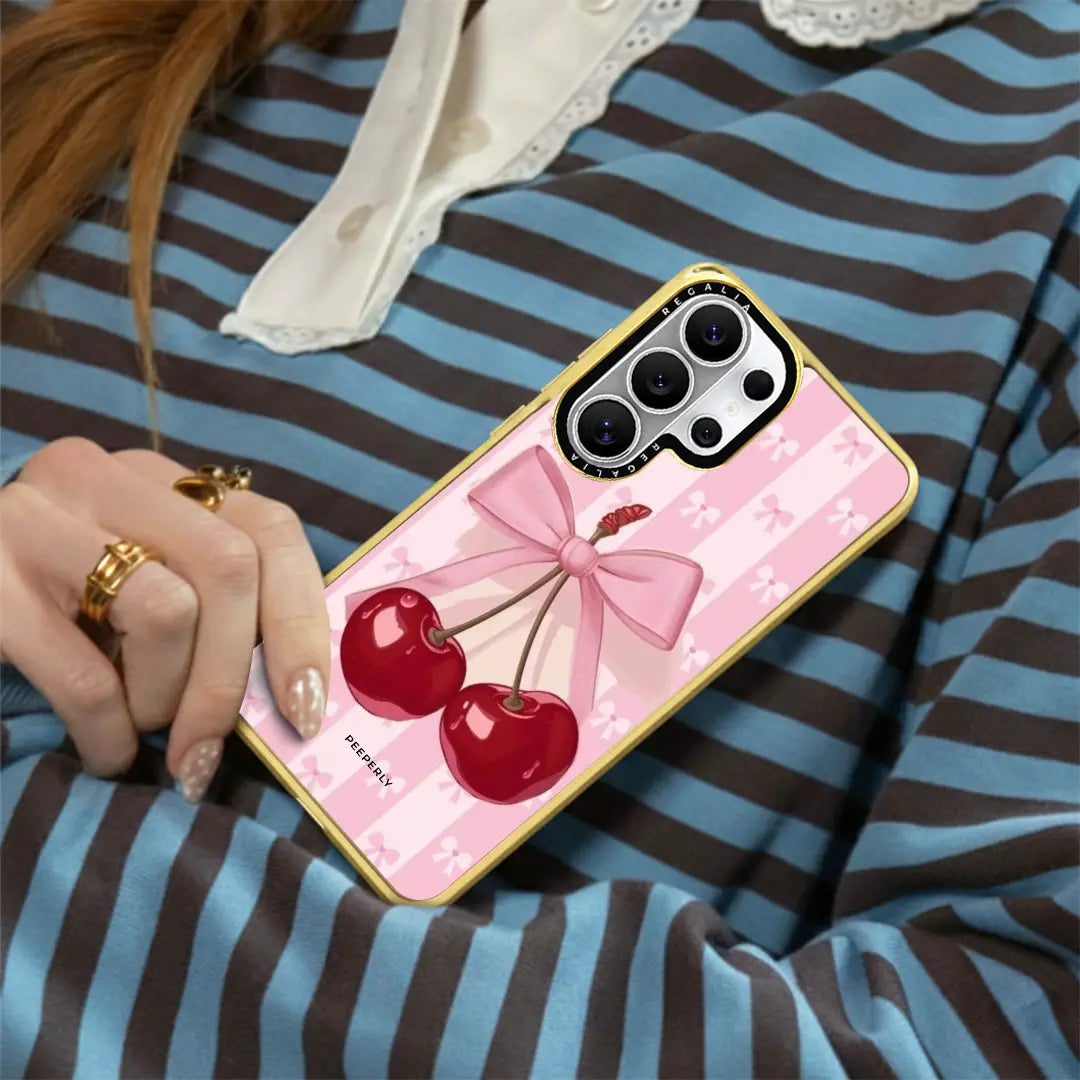 Sweet, playful, and full of charm — the Cupid Berry Bow Case brings a delightful touch of romance to your everyday style. Featuring glossy red cherries tied together with a soft pink ribbon bow, this design sits beautifully on a pastel striped backdrop sprinkled with tiny bows for an extra dose of sweetness.