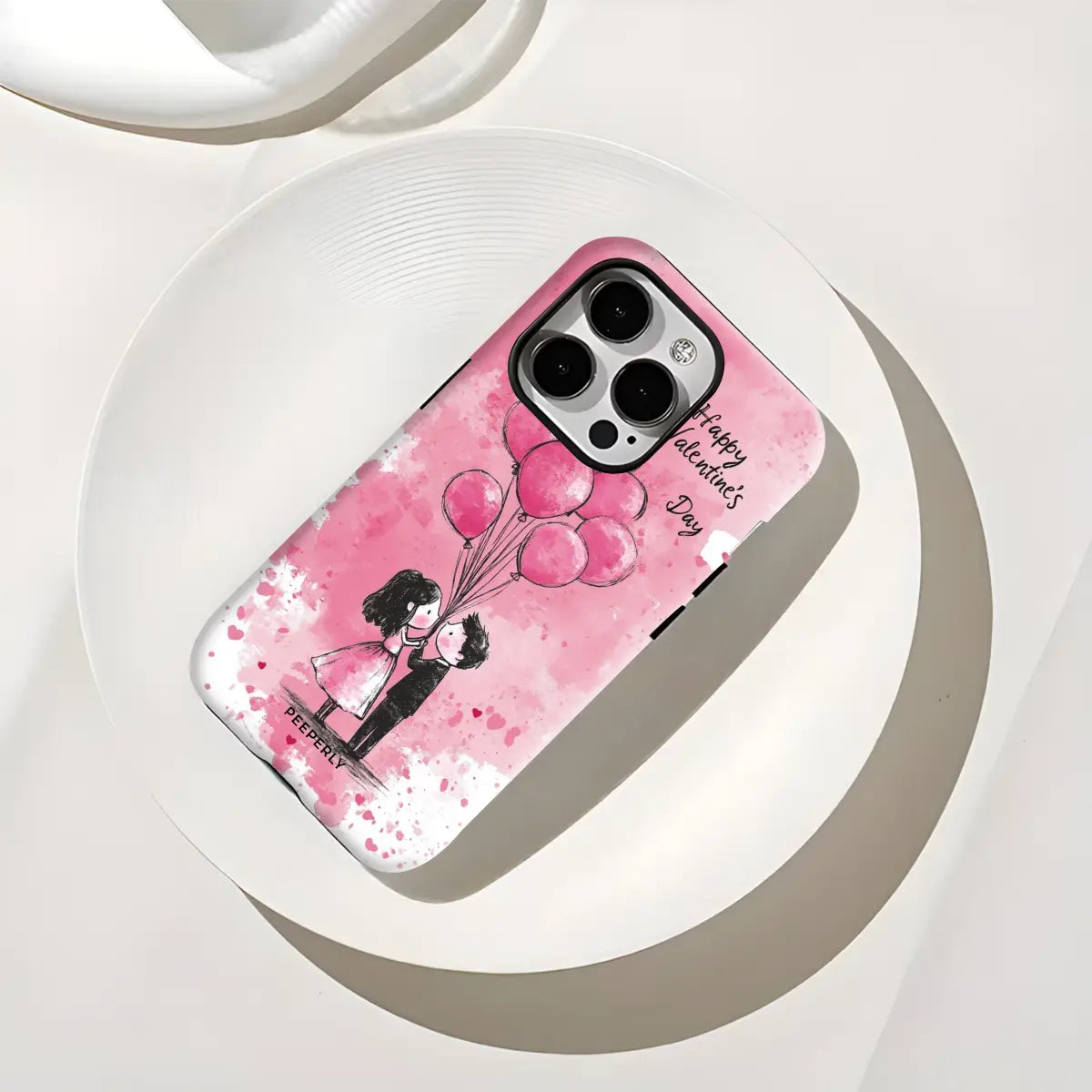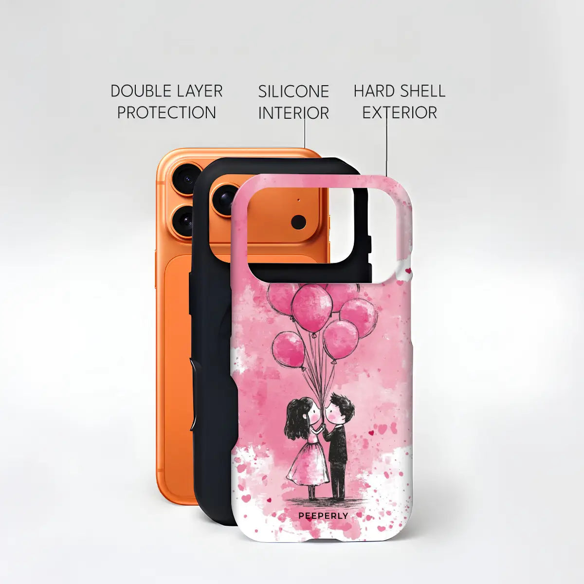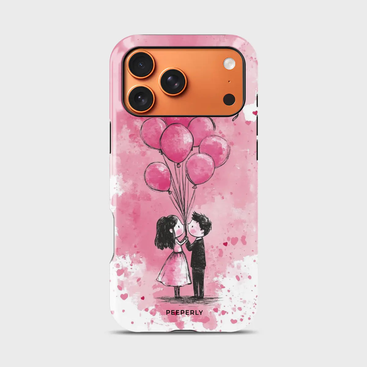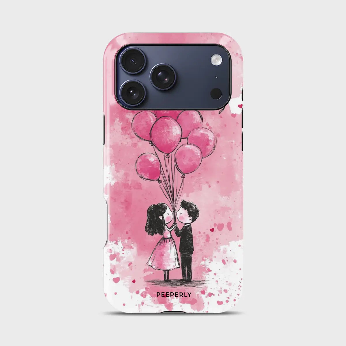 Forever Float is a romantic phone case featuring a delicate illustration of a couple lifted by soft pink heart balloons. The watercolor-style design creates a dreamy, storybook feel that captures love in its most tender moments.