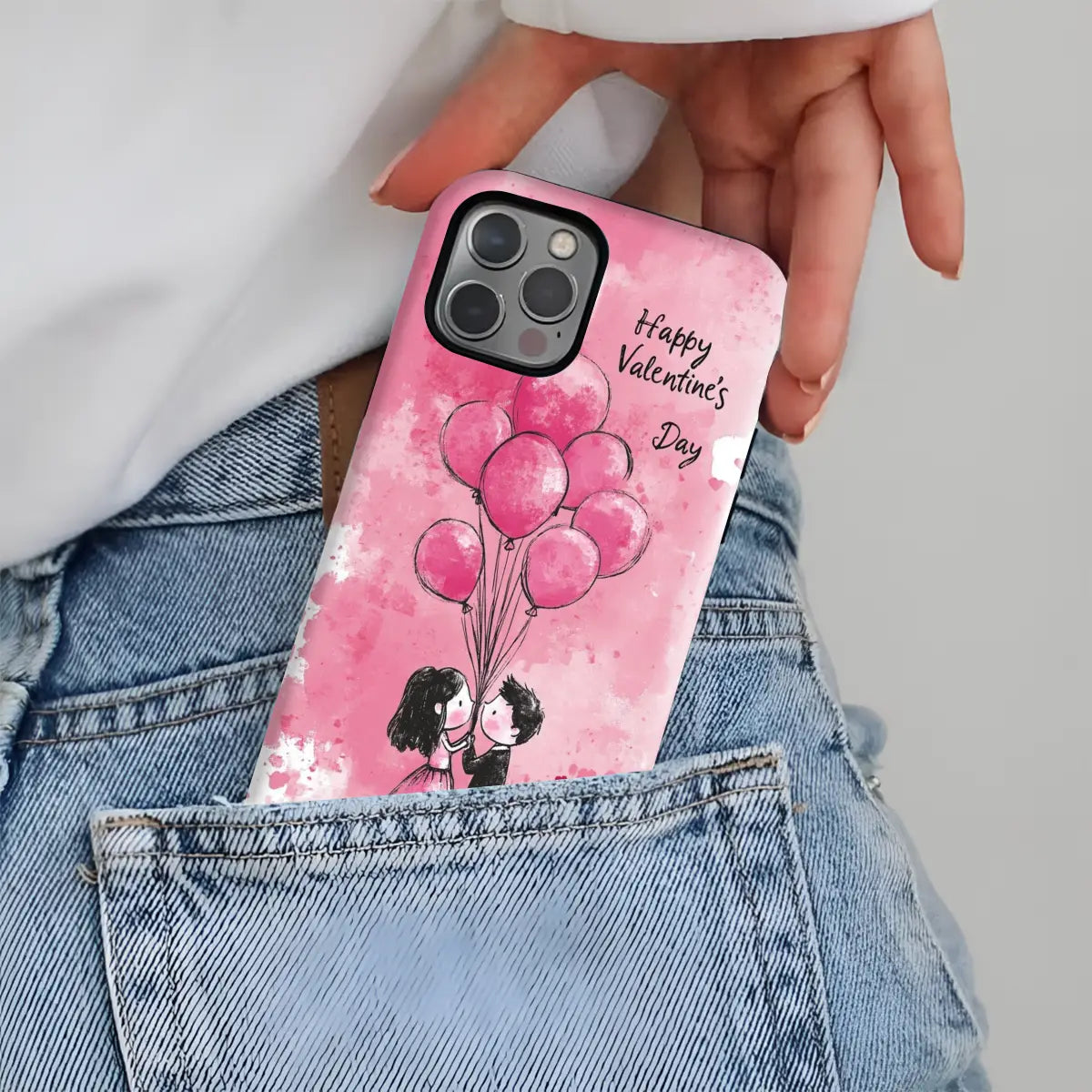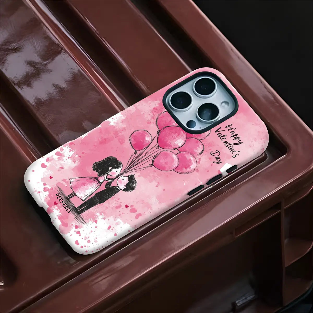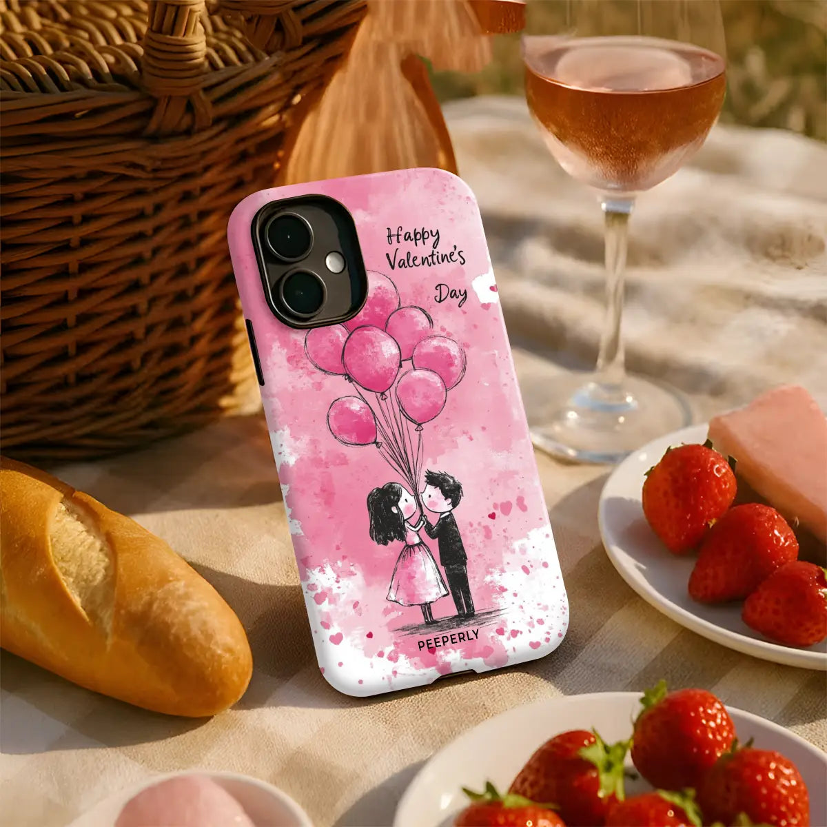 Forever Float is a romantic phone case featuring a delicate illustration of a couple lifted by soft pink heart balloons. The watercolor-style design creates a dreamy, storybook feel that captures love in its most tender moments.