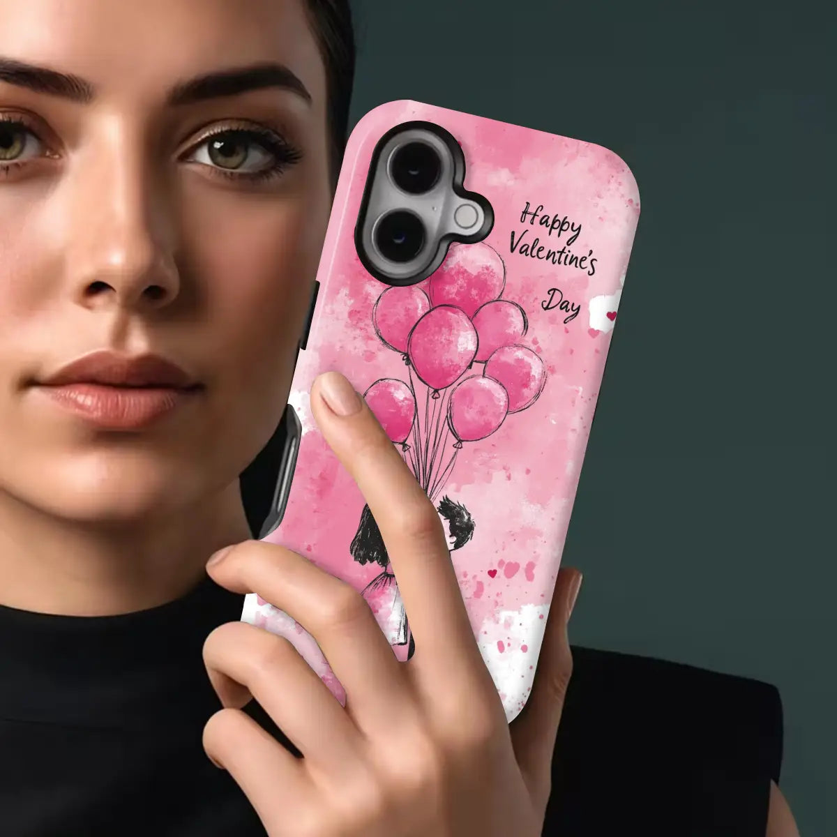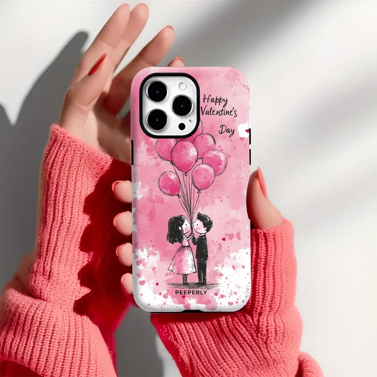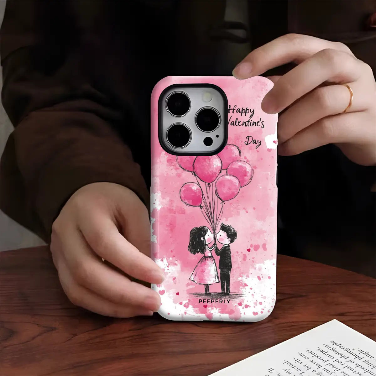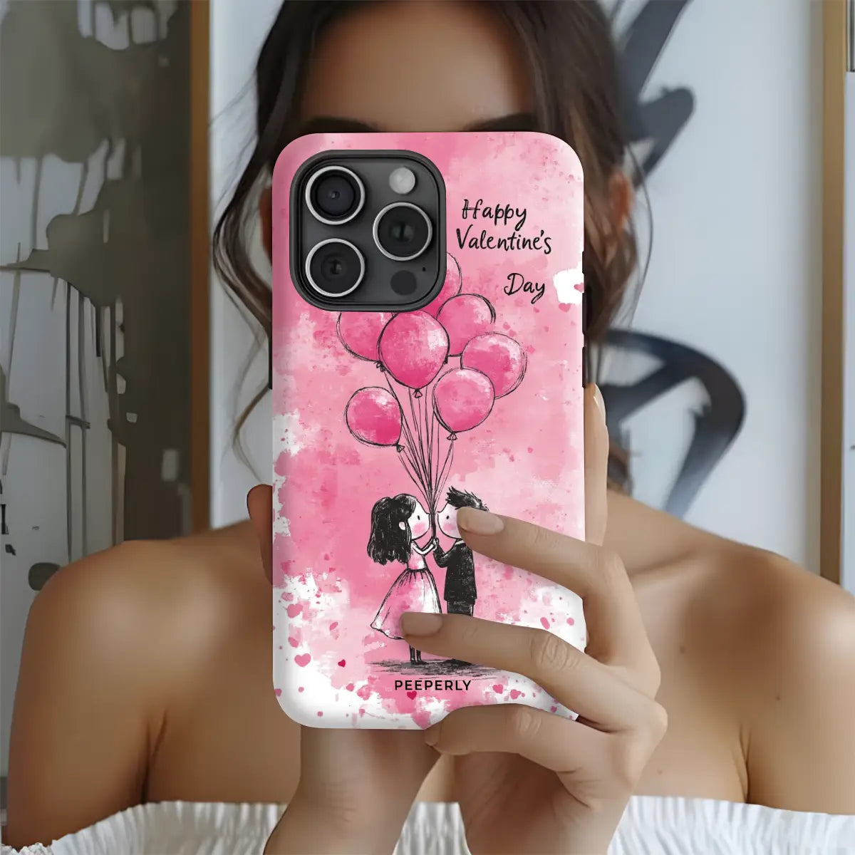 Forever Float is a romantic phone case featuring a delicate illustration of a couple lifted by soft pink heart balloons. The watercolor-style design creates a dreamy, storybook feel that captures love in its most tender moments.