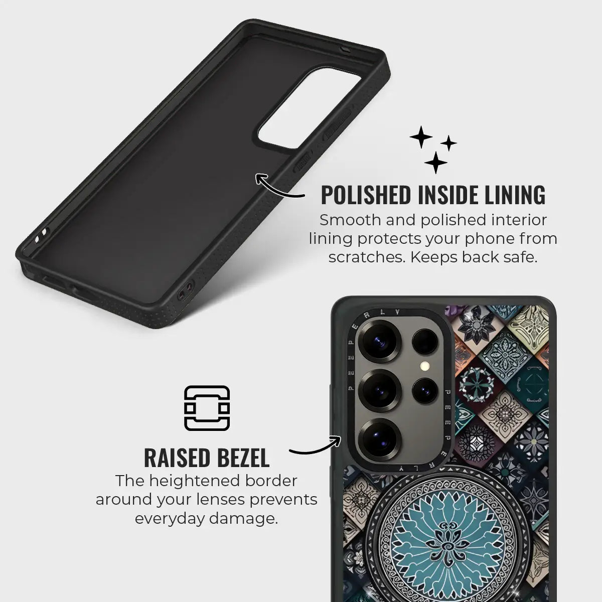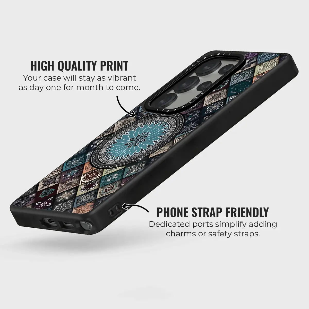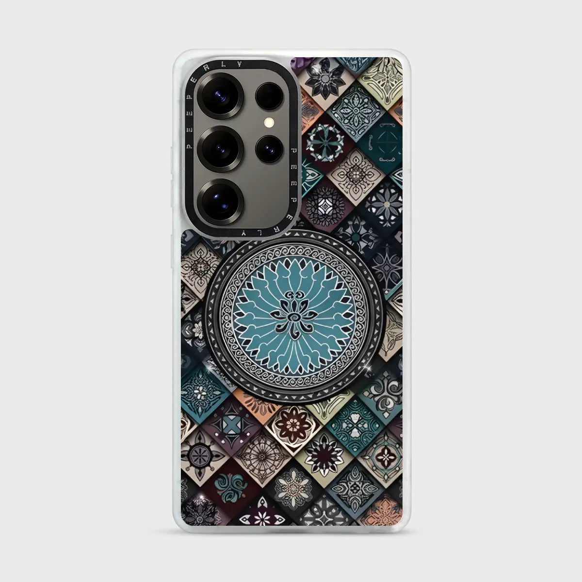 The Regal Pattern Case is a statement of refined luxury and timeless design. Featuring an intricate mosaic-inspired mandala at its center, this case blends rich textures with symmetrical elegance for a look that feels both royal and artistic.