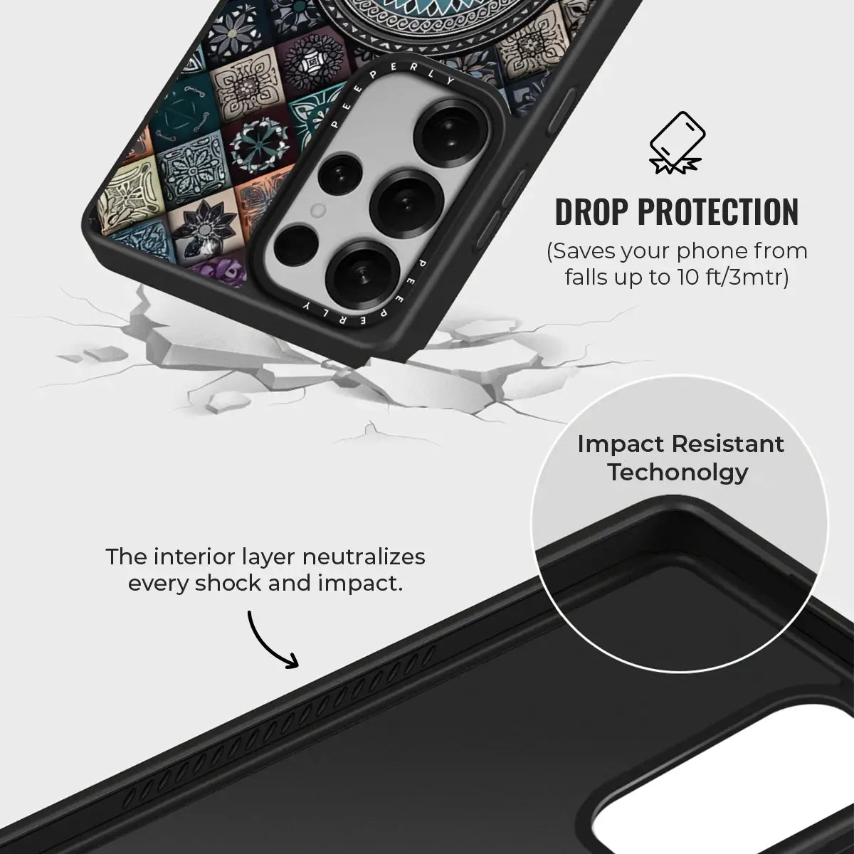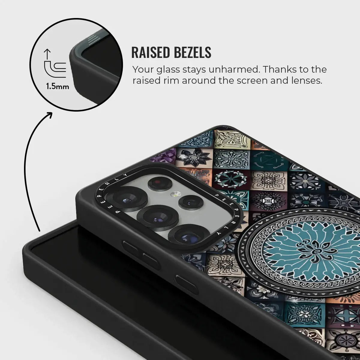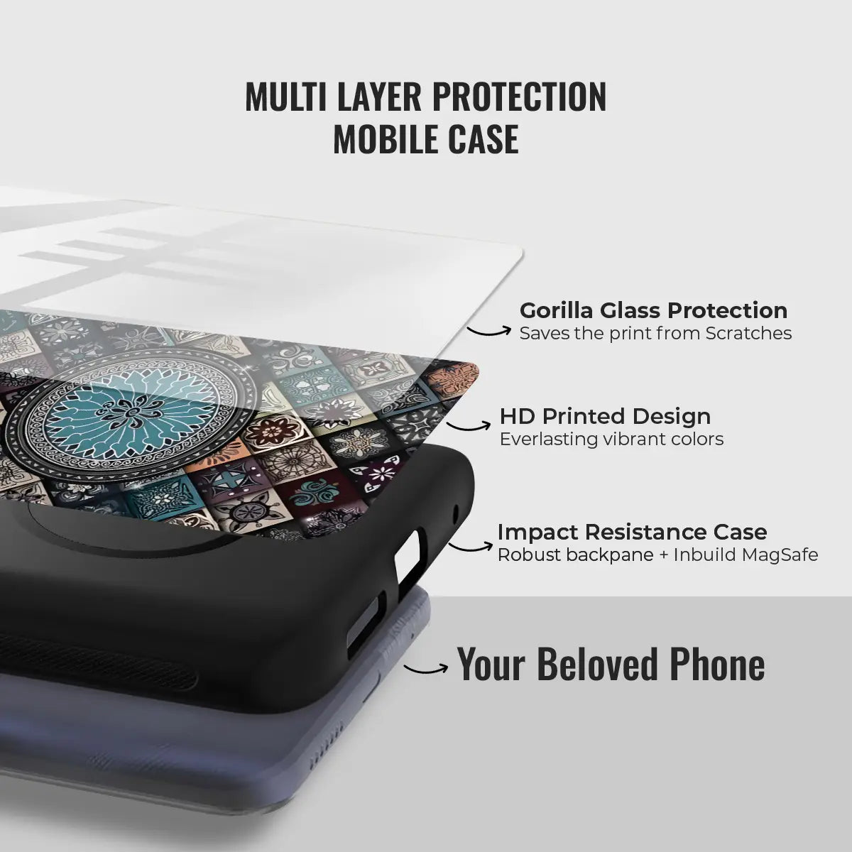 The Regal Pattern Case is a statement of refined luxury and timeless design. Featuring an intricate mosaic-inspired mandala at its center, this case blends rich textures with symmetrical elegance for a look that feels both royal and artistic.