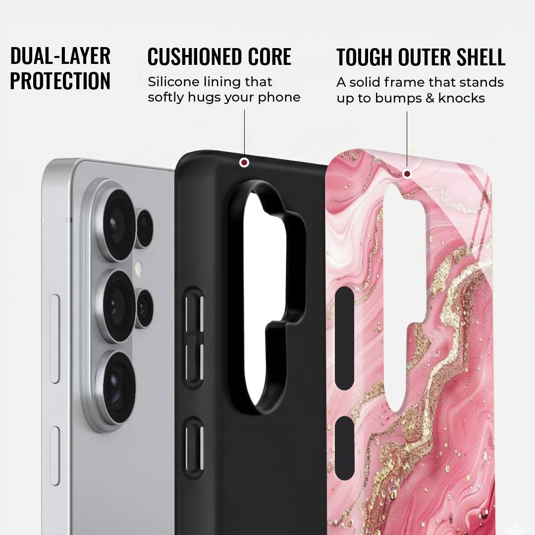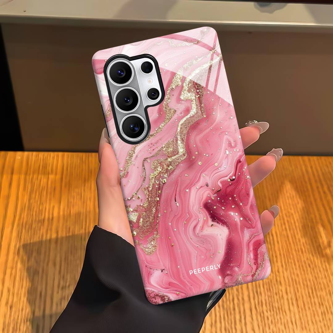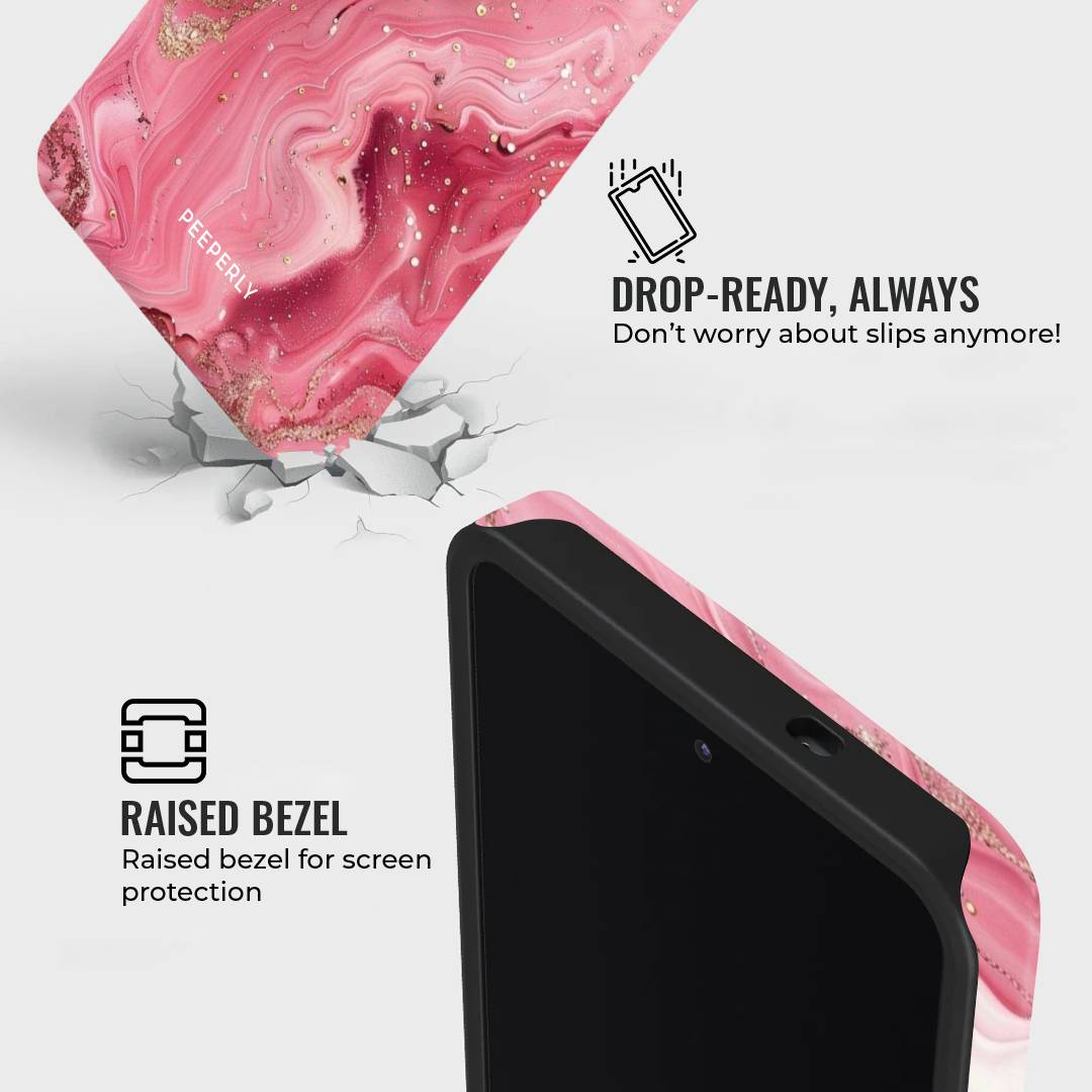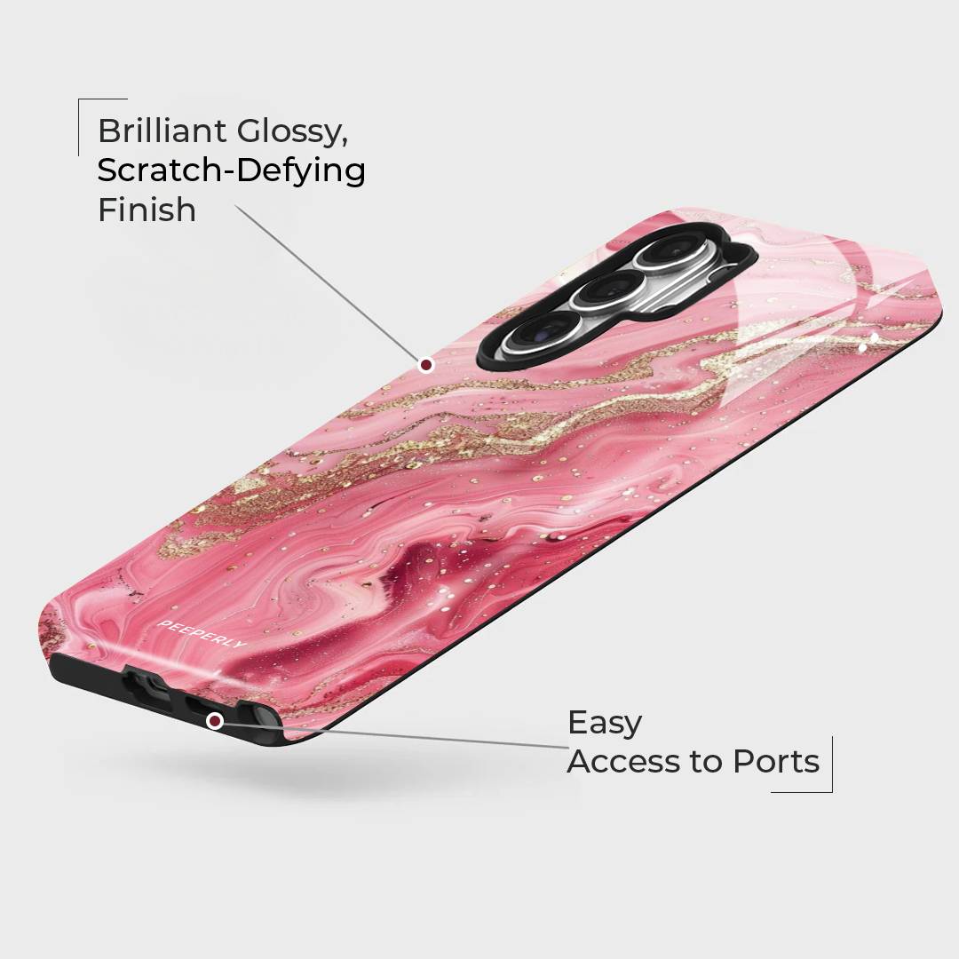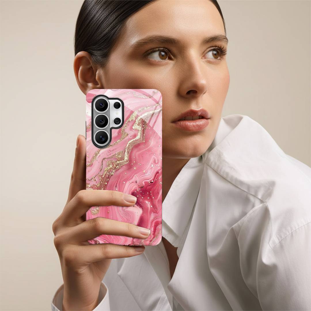 Wrap your phone in pure elegance with the Rosy Quartz Case, a stunning blend of glamour and grace. Inspired by the soft beauty of rose quartz crystals, this case showcases a swirling pink marble design accentuated with delicate golden veins and shimmering details.