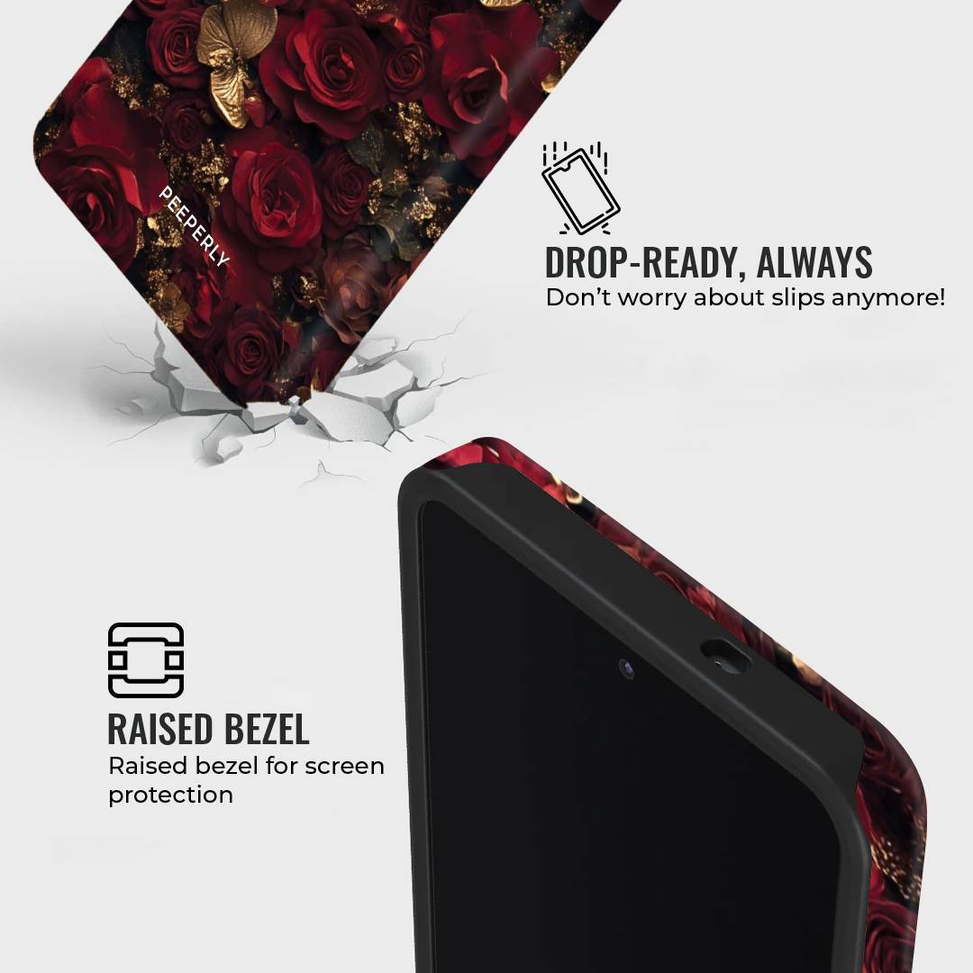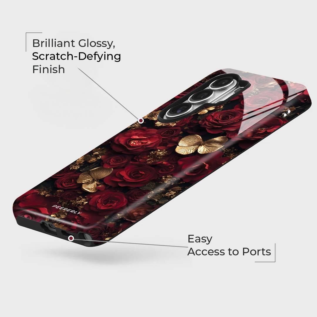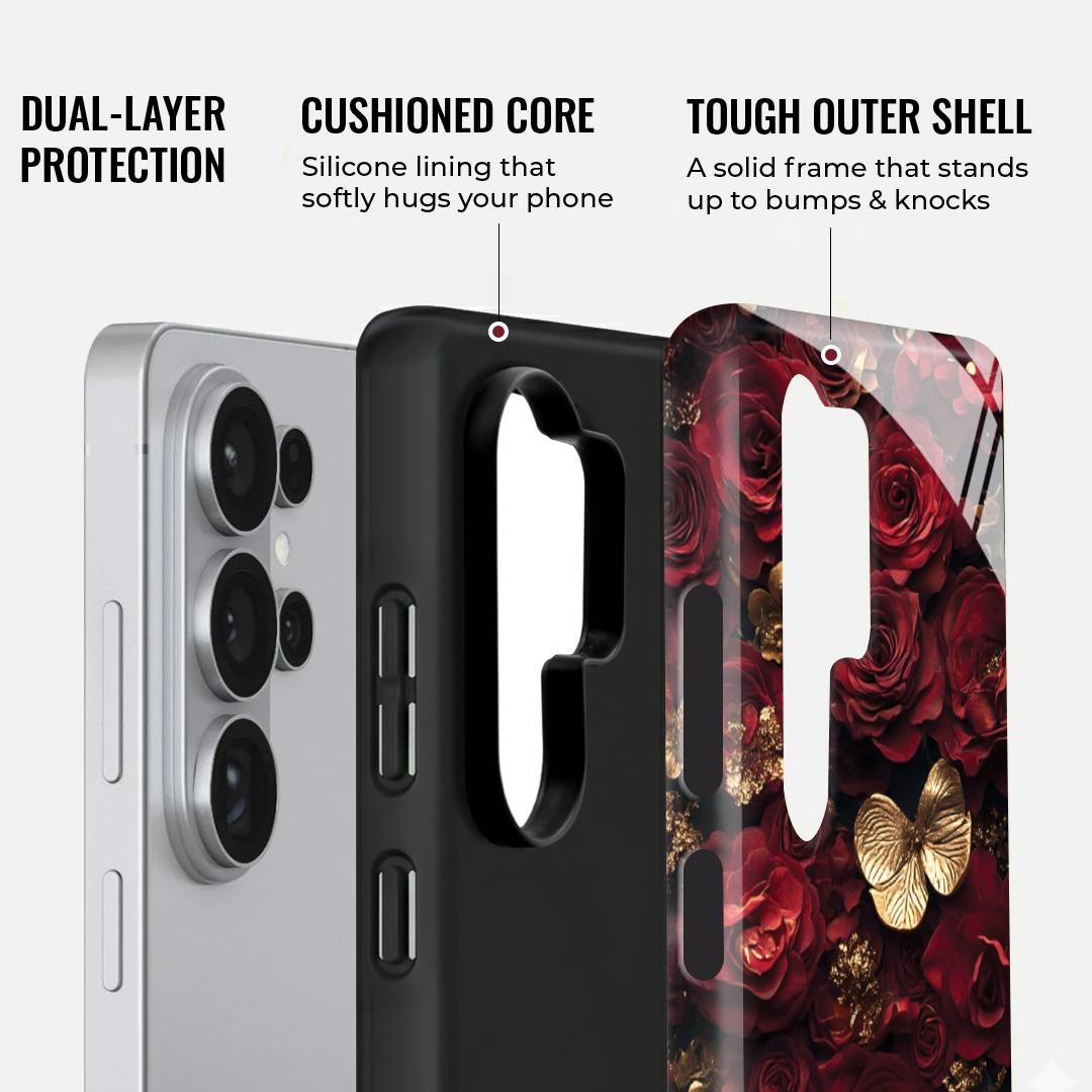 Royal Rose Luxe is a case that exudes timeless beauty and sophistication. Featuring deep crimson roses paired with golden butterflies, it creates a striking contrast of passion and luxury. Every detail is crafted to reflect elegance and charm, making this case not just protection but a statement accessory.