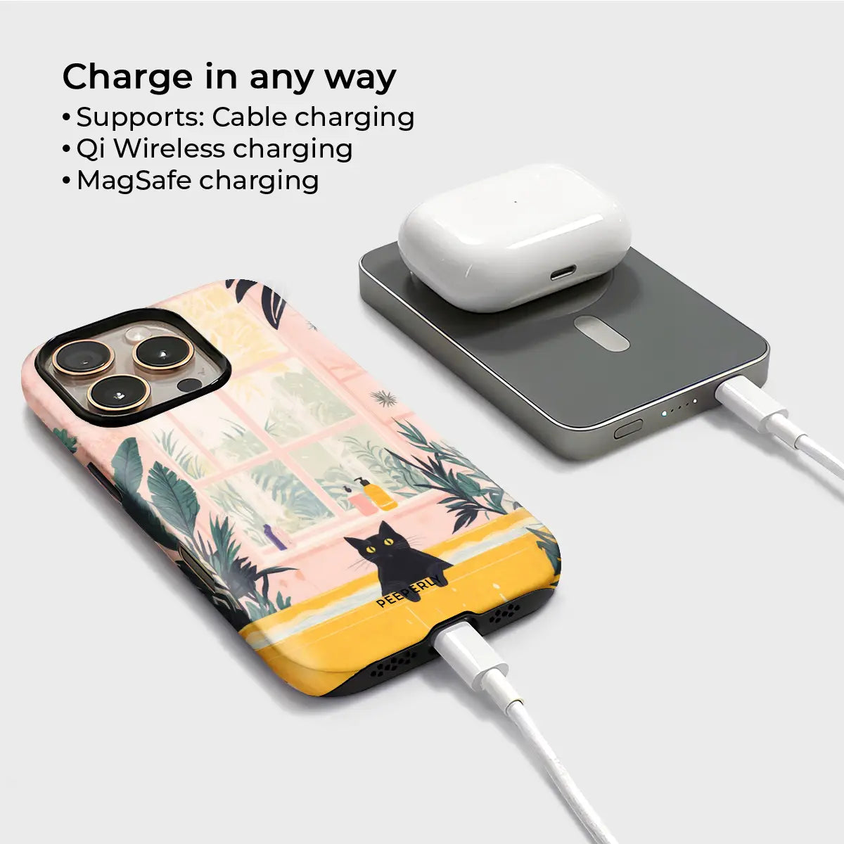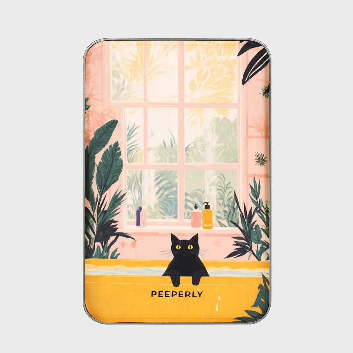 Soak in warmth and comfort with Cozy Sunbath—a gentle, feel-good design that captures a peaceful moment bathed in soft sunlight. Featuring an adorable black cat peeking over a warm golden tub, surrounded by lush greenery and a sunlit window, this powerbank radiates calm, comfort, and quiet joy.