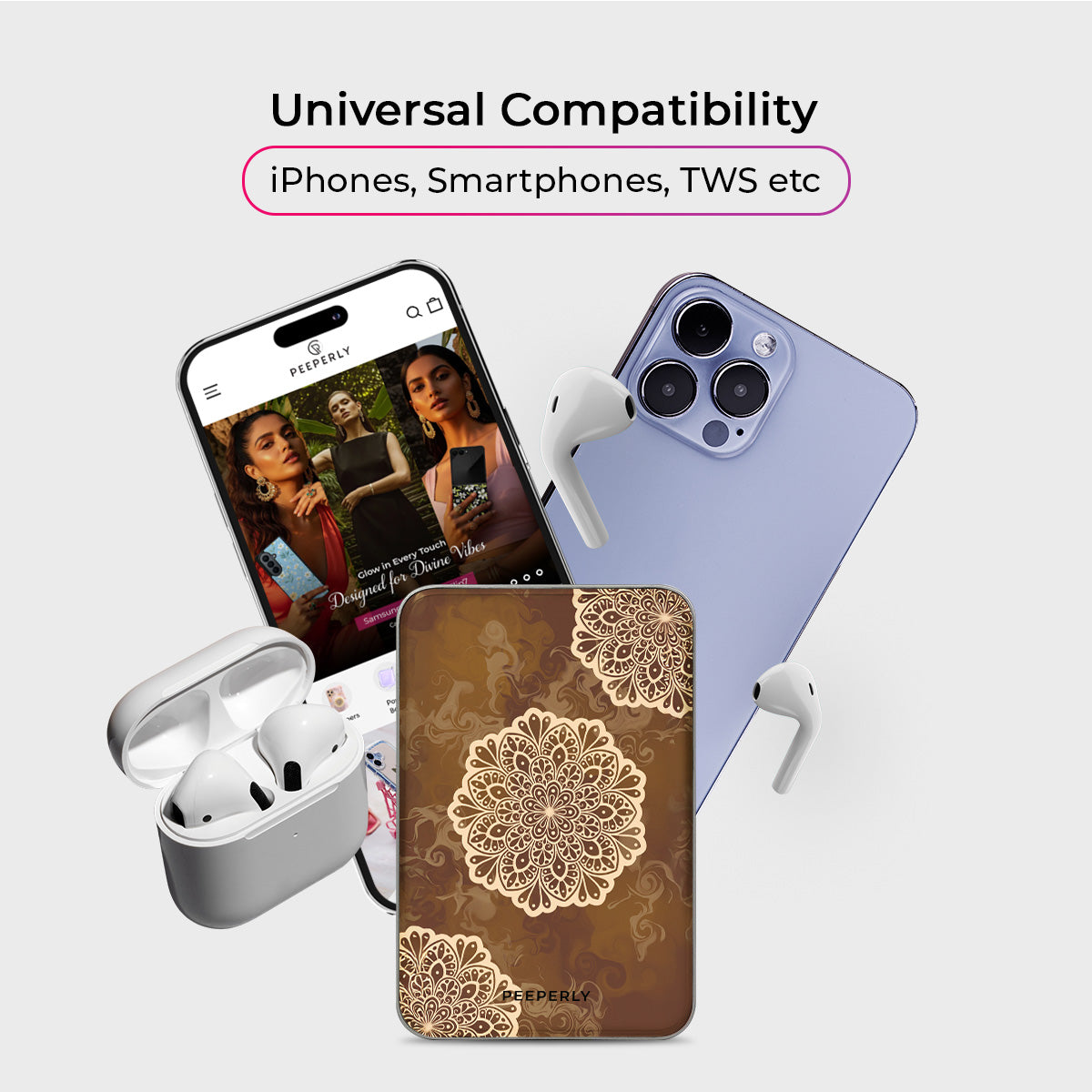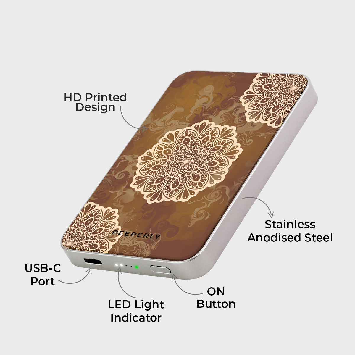 Ground your style with the warm, calming tones of the Earth Tone Mandala Magnetic Power Bank. Featuring intricate mandala patterns in soft beige layered over rich, earthy browns, this design reflects balance, stability, and a deep connection to nature.