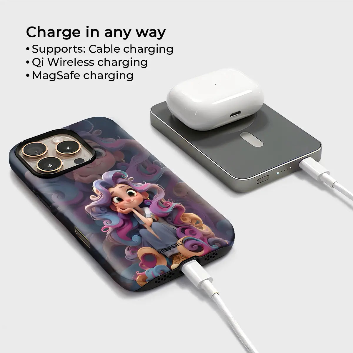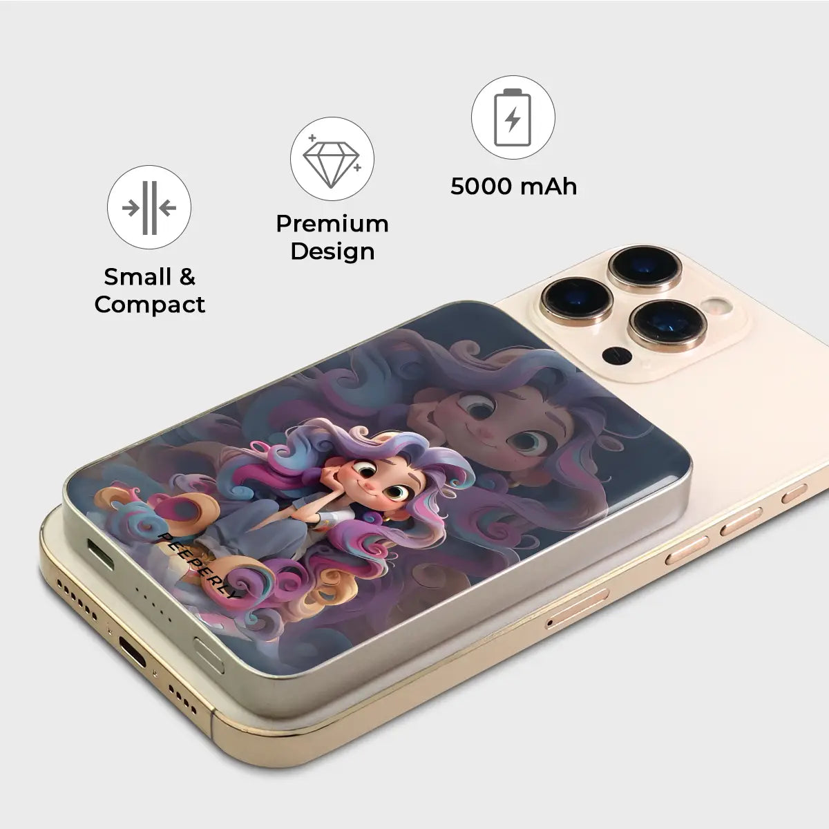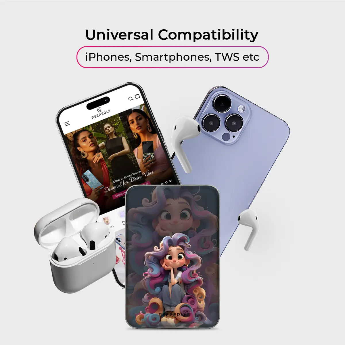 Bring a little magic to your daily charging routine with the Pixie Smile Magnetic Power Bank. Featuring an adorable, whimsical character with flowing pastel curls and a gentle, cheerful expression, this design radiates positivity and playful charm.