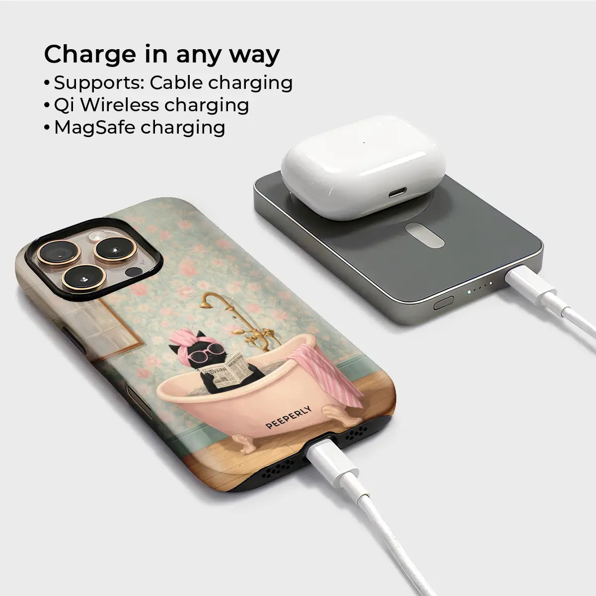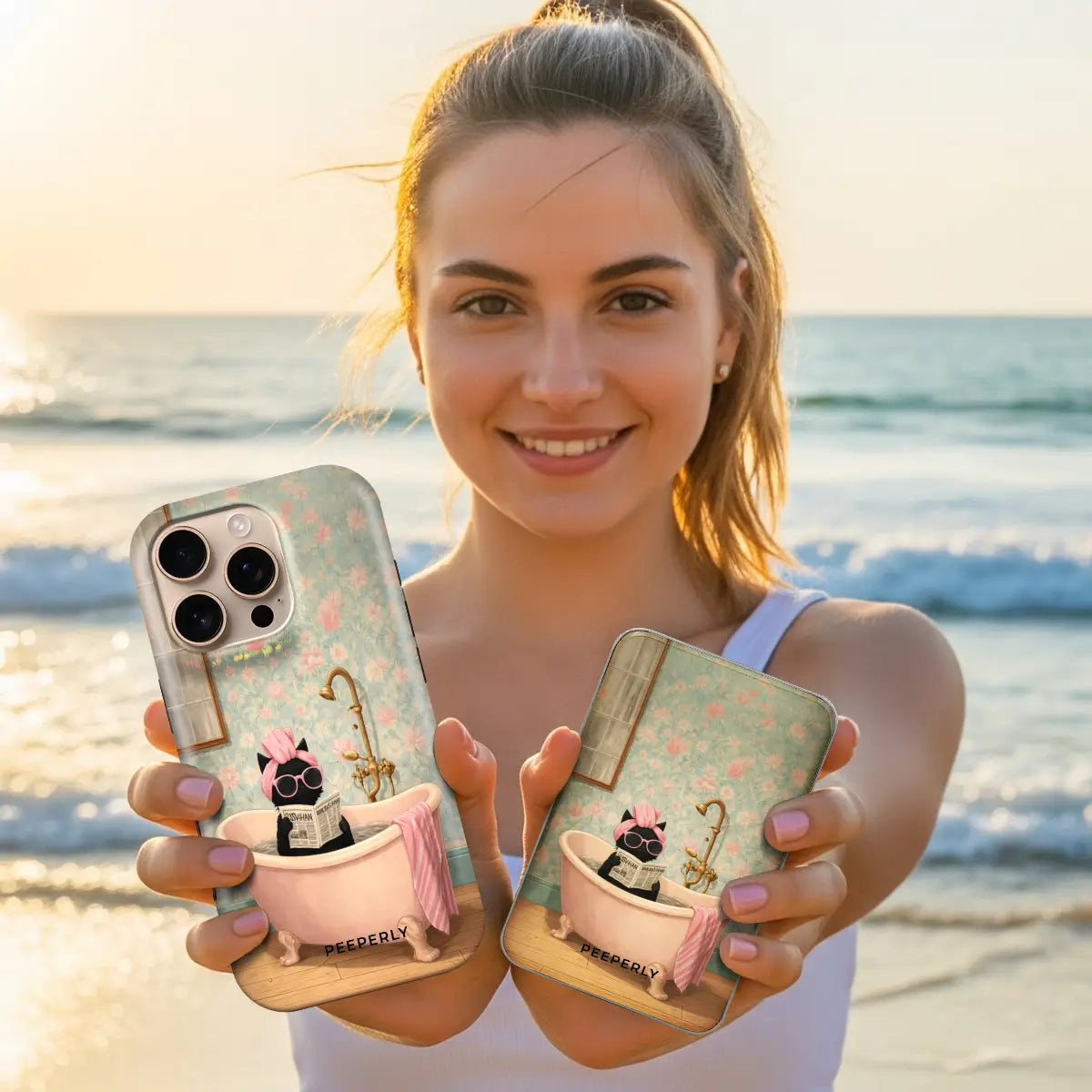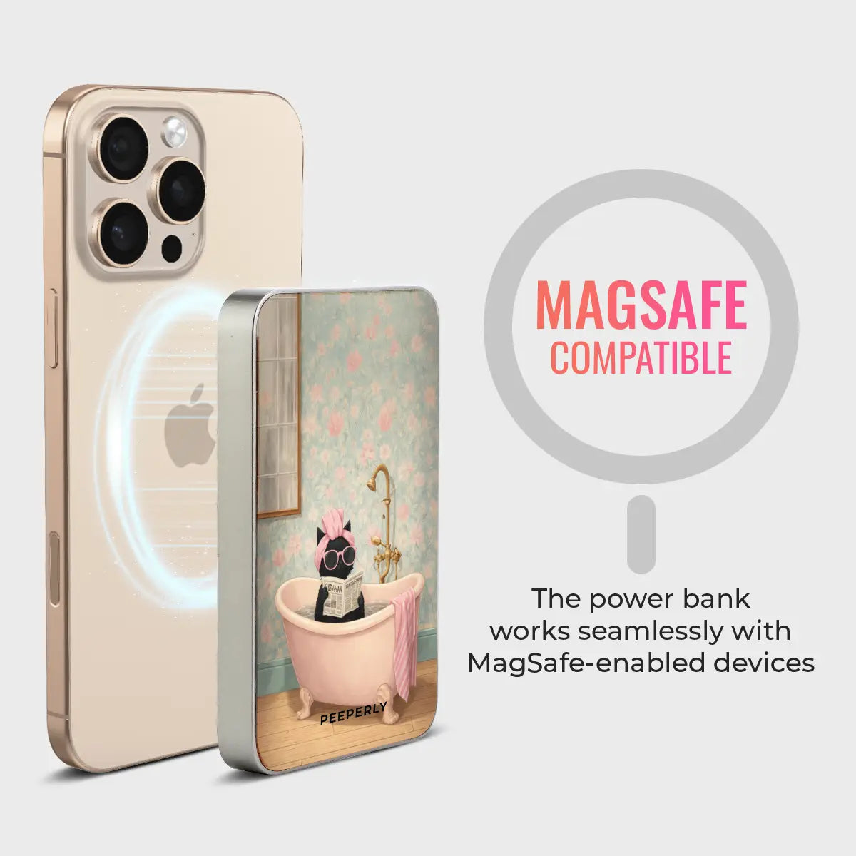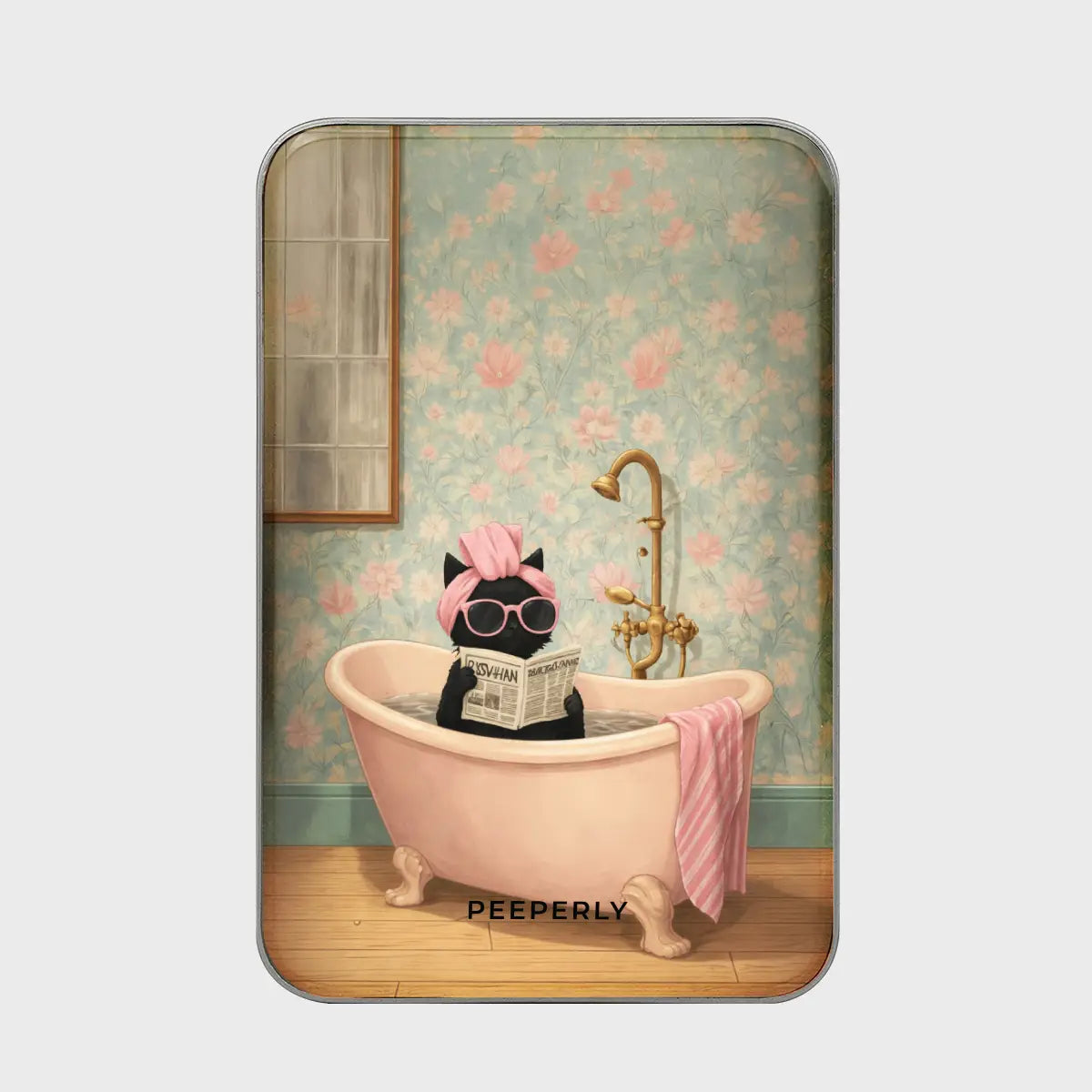 Indulge in pure relaxation with Spa Kitty—a charming design that captures the ultimate self-care moment. Featuring an adorable cat soaking in a vintage tub, wrapped in soft pastel tones with stylish sunglasses and a cozy towel, this powerbank radiates calm