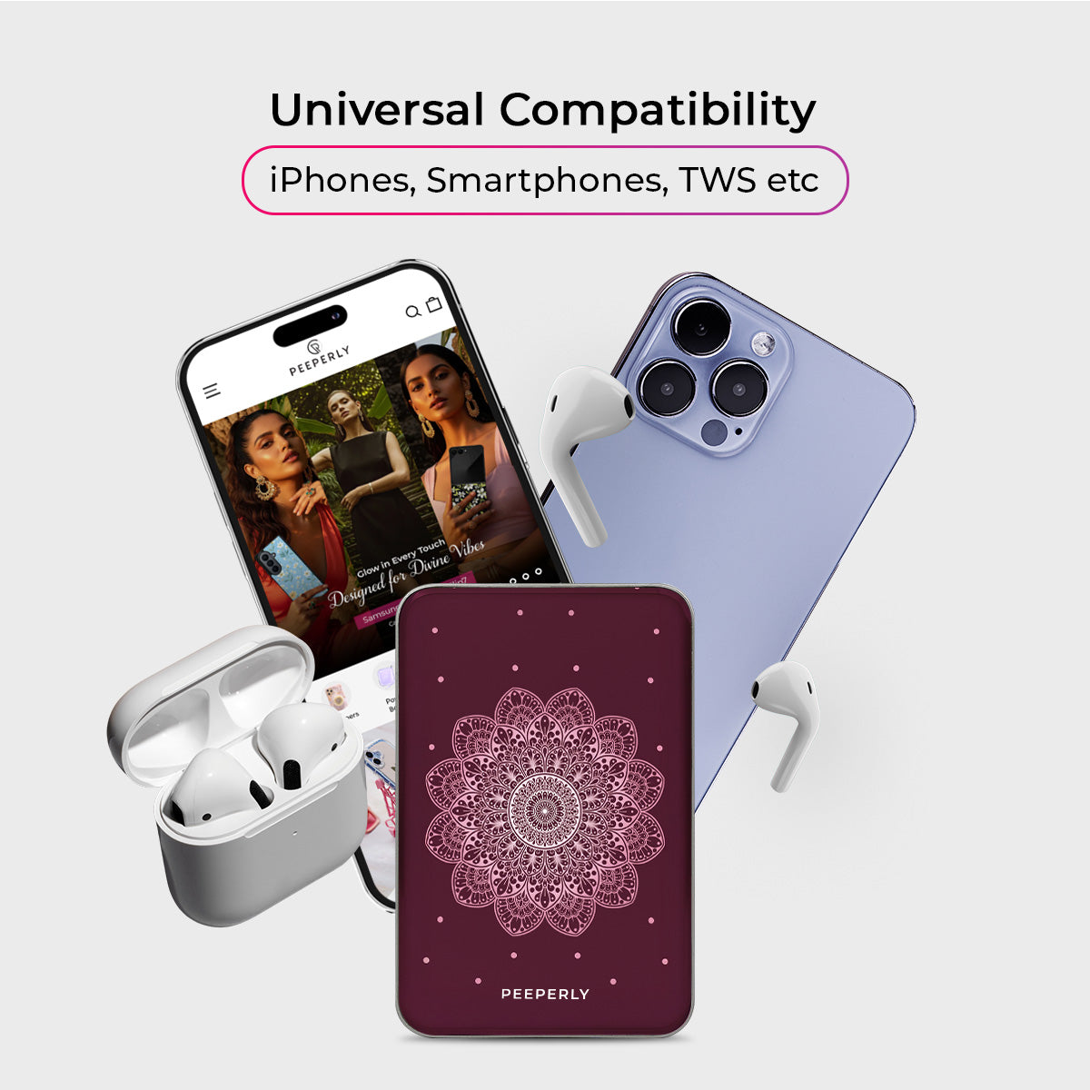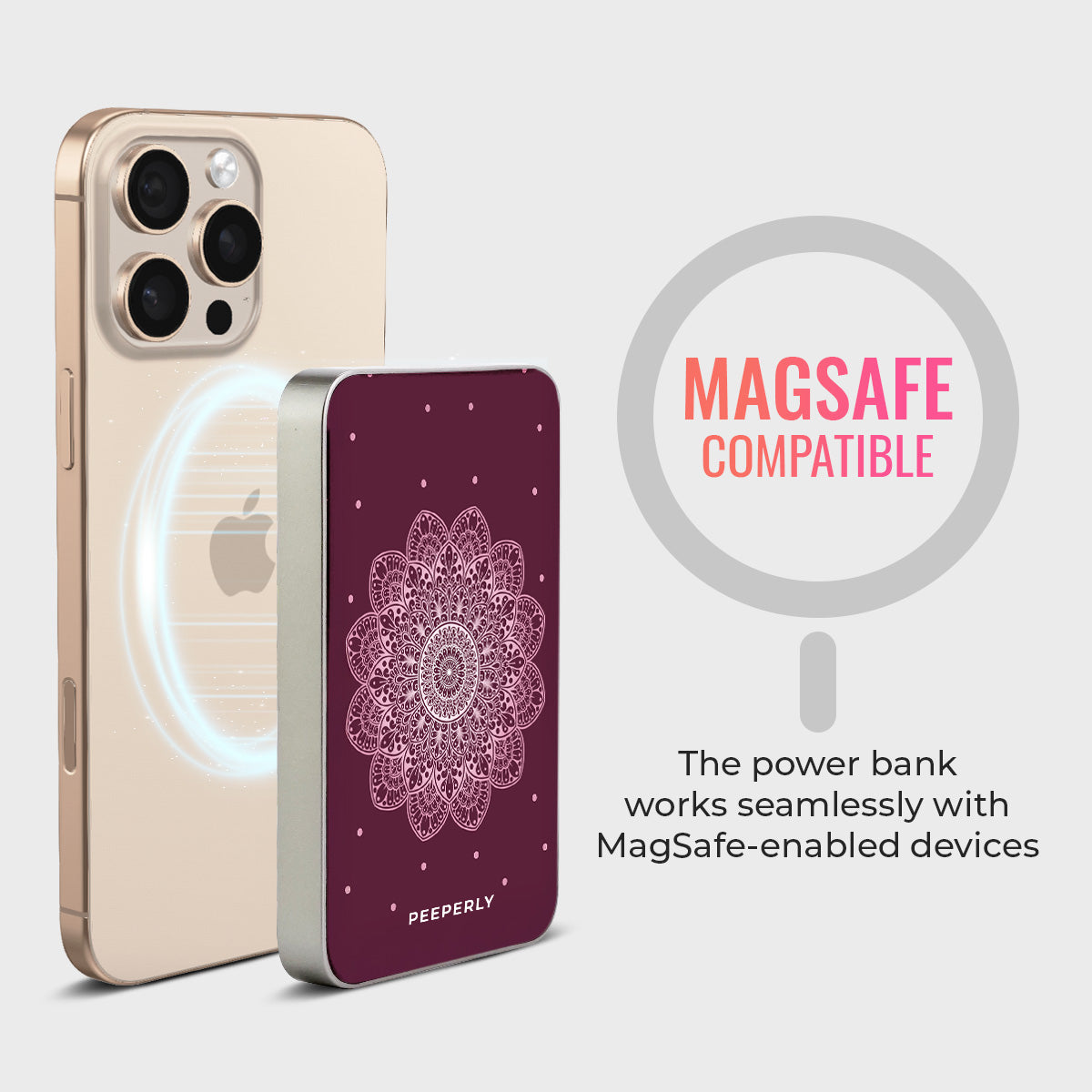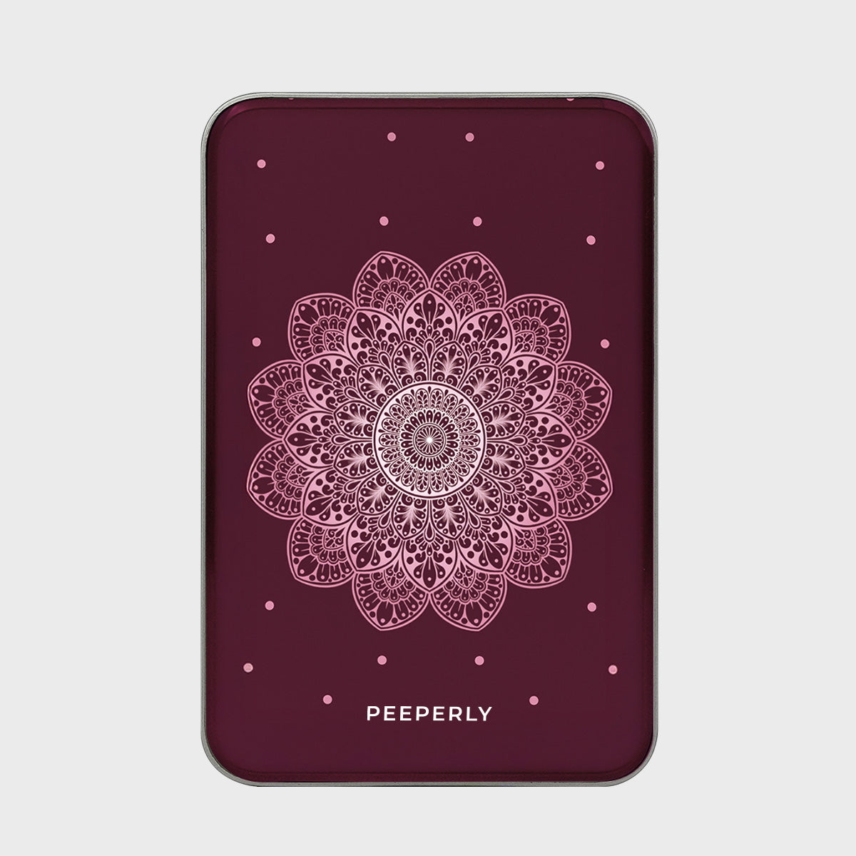 Timeless and refined, the Wine Petal Serenity Magnetic Power Bank brings a touch of sophistication to your everyday essentials. Showcasing a delicate mandala design in soft blush tones against a rich maroon backdrop, this piece exudes grace, balance, and understated beauty.