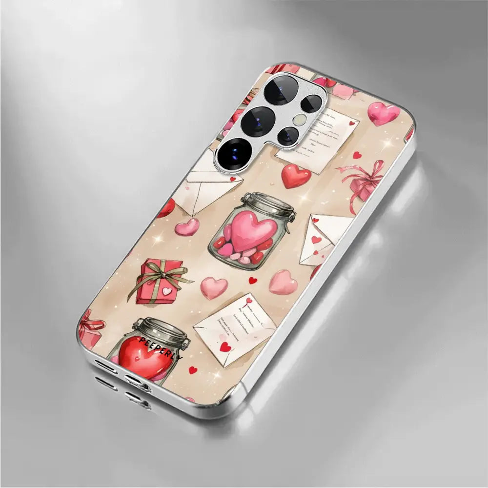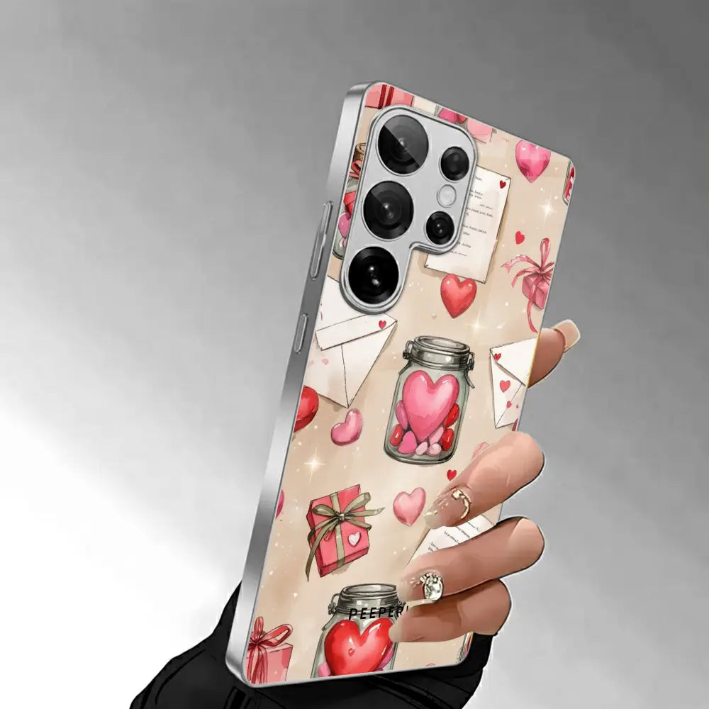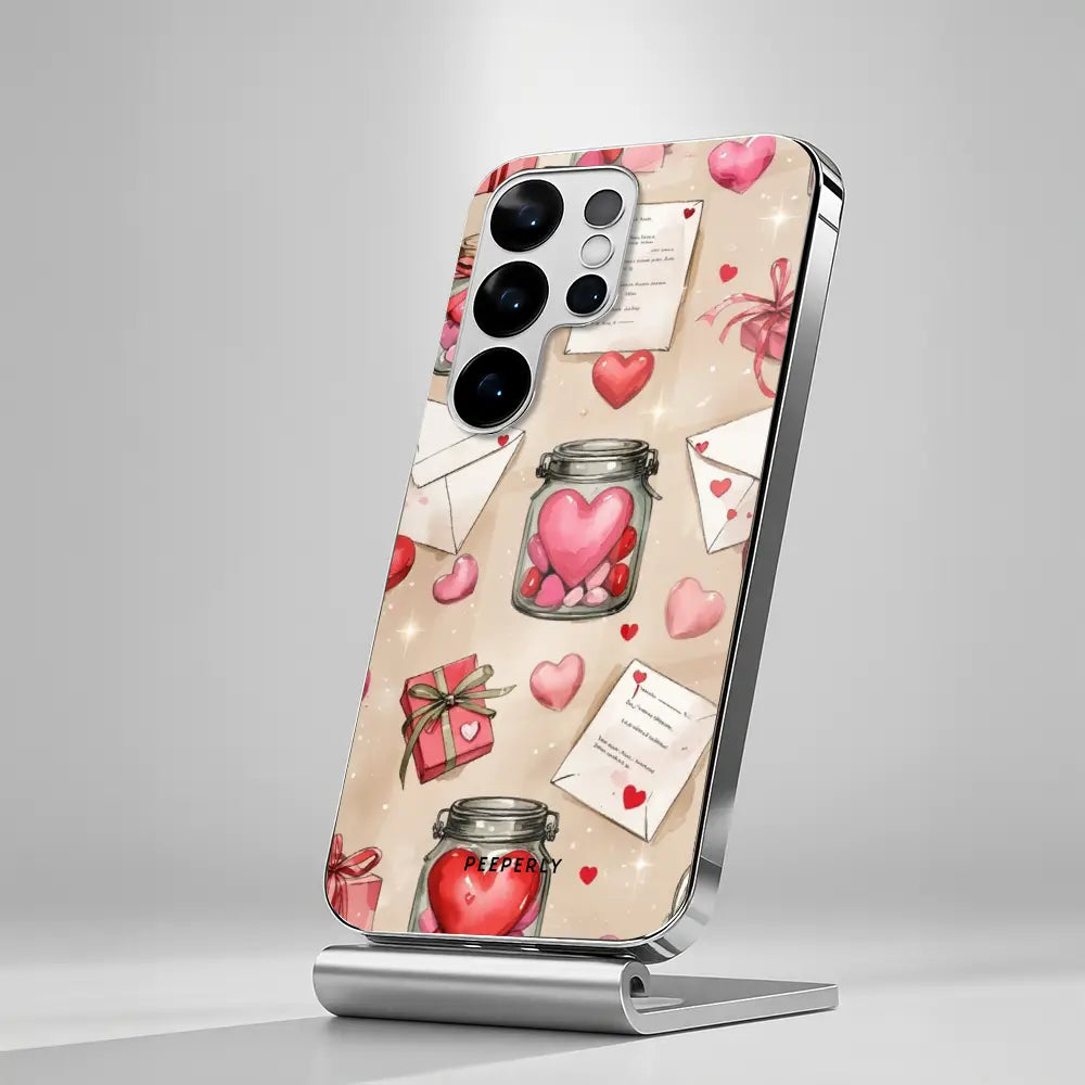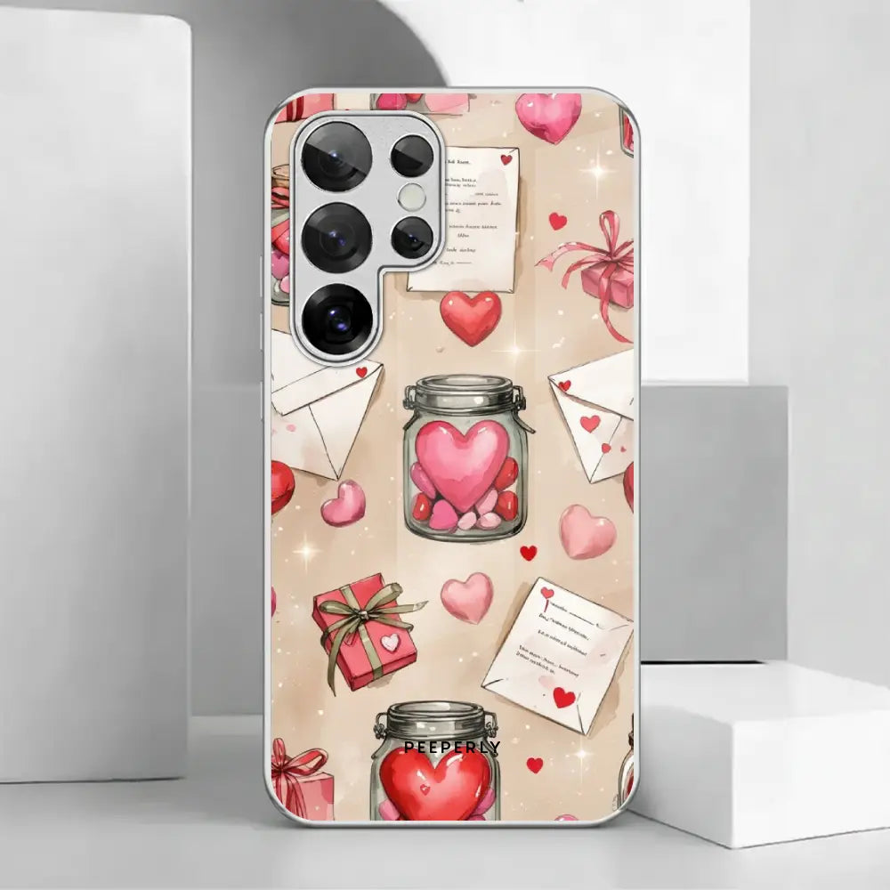 Love Keepsakes is a charming phone case that captures the magic of heartfelt memories. Featuring delicate illustrations of love letters, gift boxes, and heart-filled jars, this design celebrates the little moments that make love special.