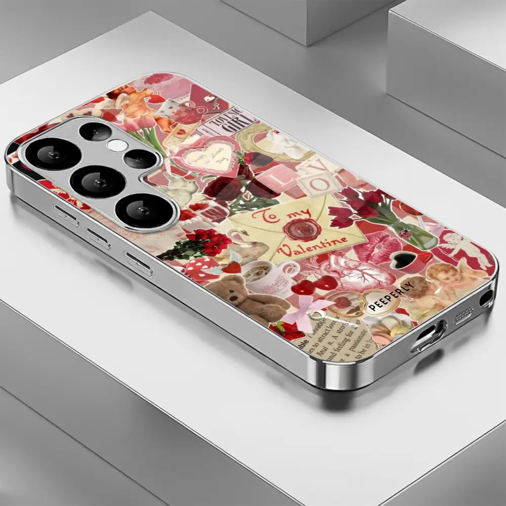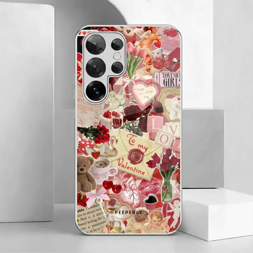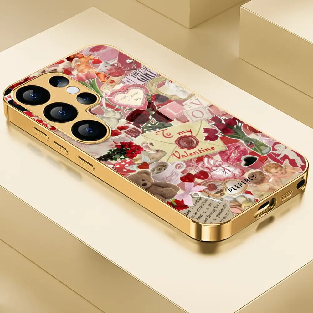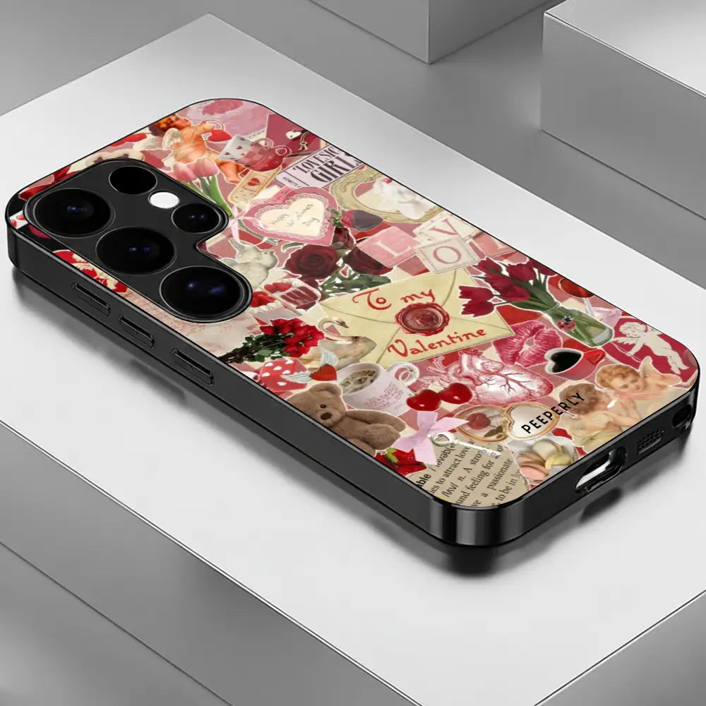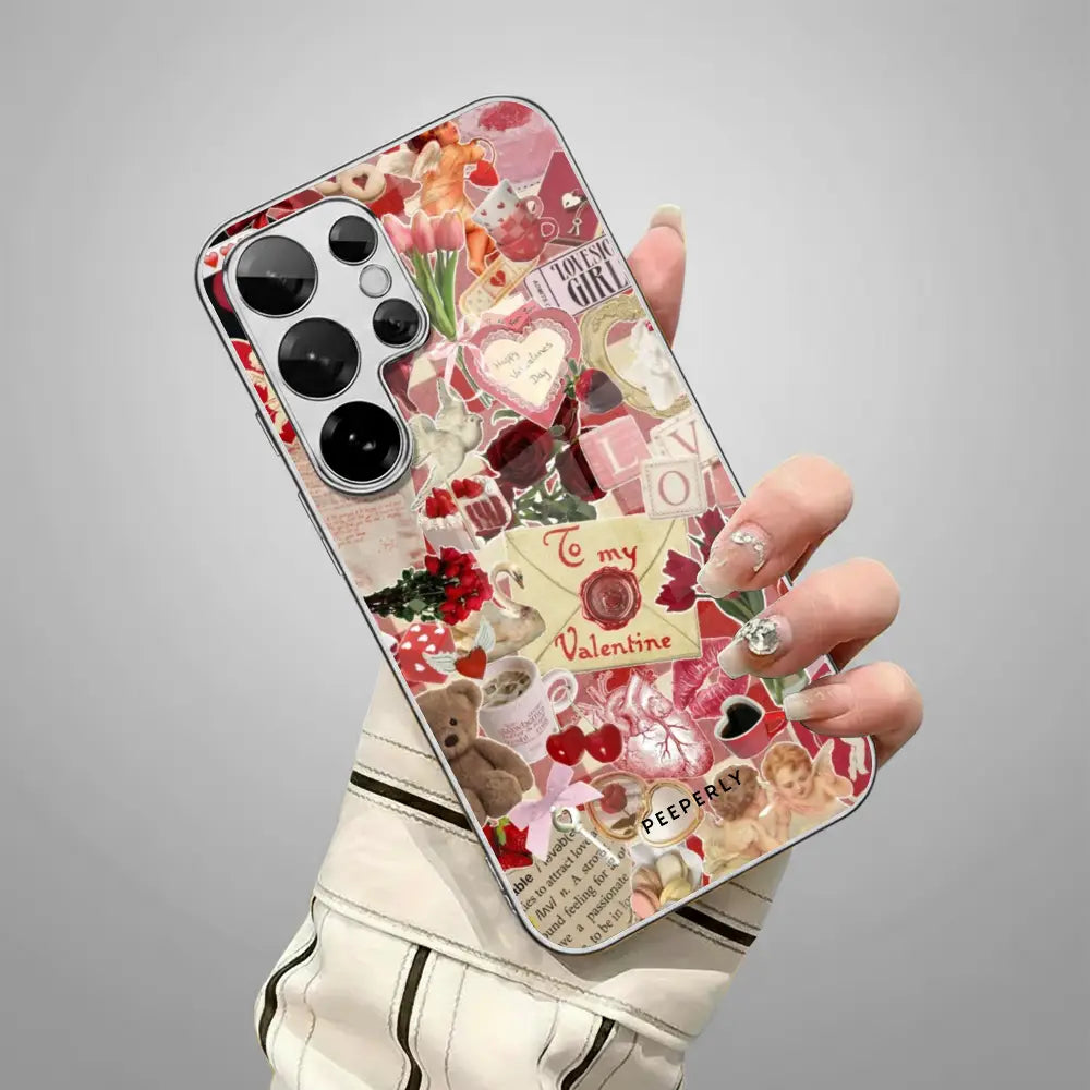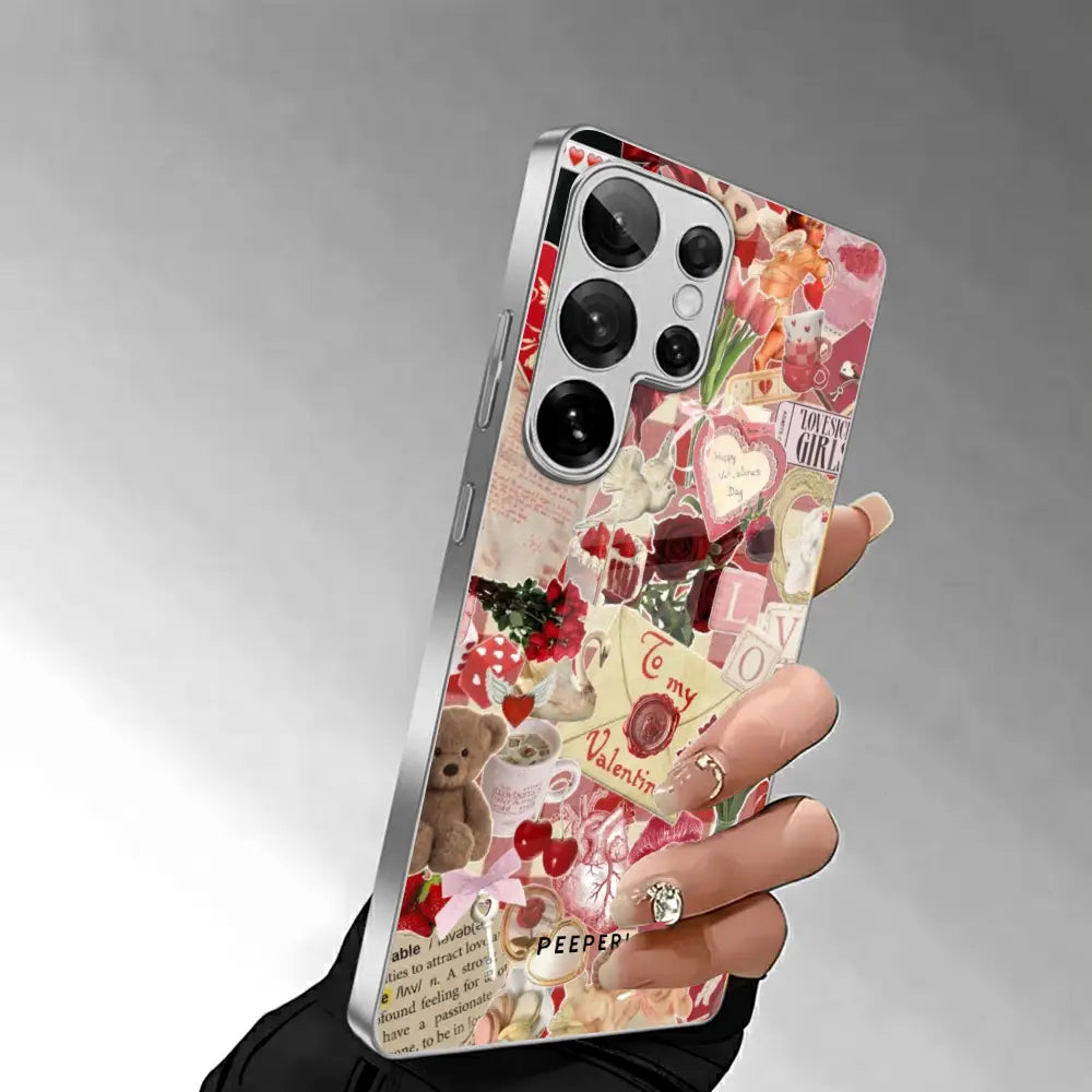 A charming collage of vintage love notes, roses, hearts, and soft blush tones that feels like flipping through a cherished scrapbook. This design blends old-world romance with cozy warmth, perfect for those who adore timeless aesthetics and sentimental details.