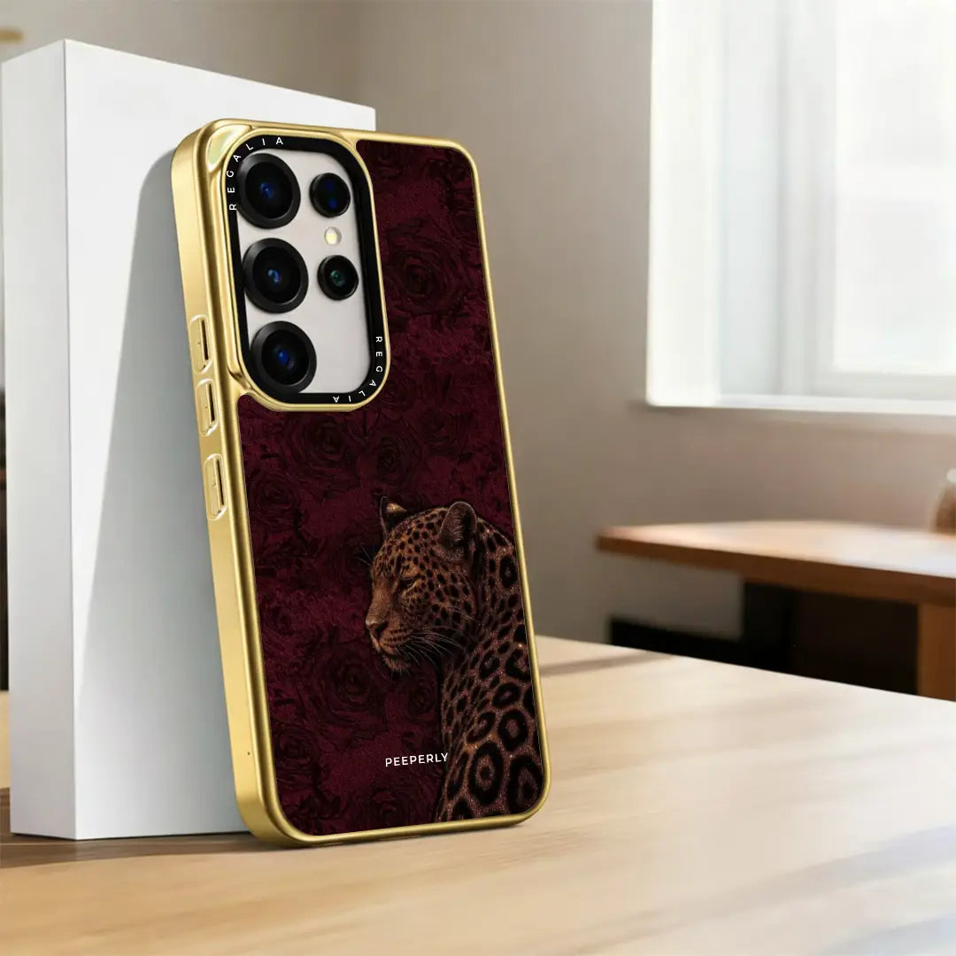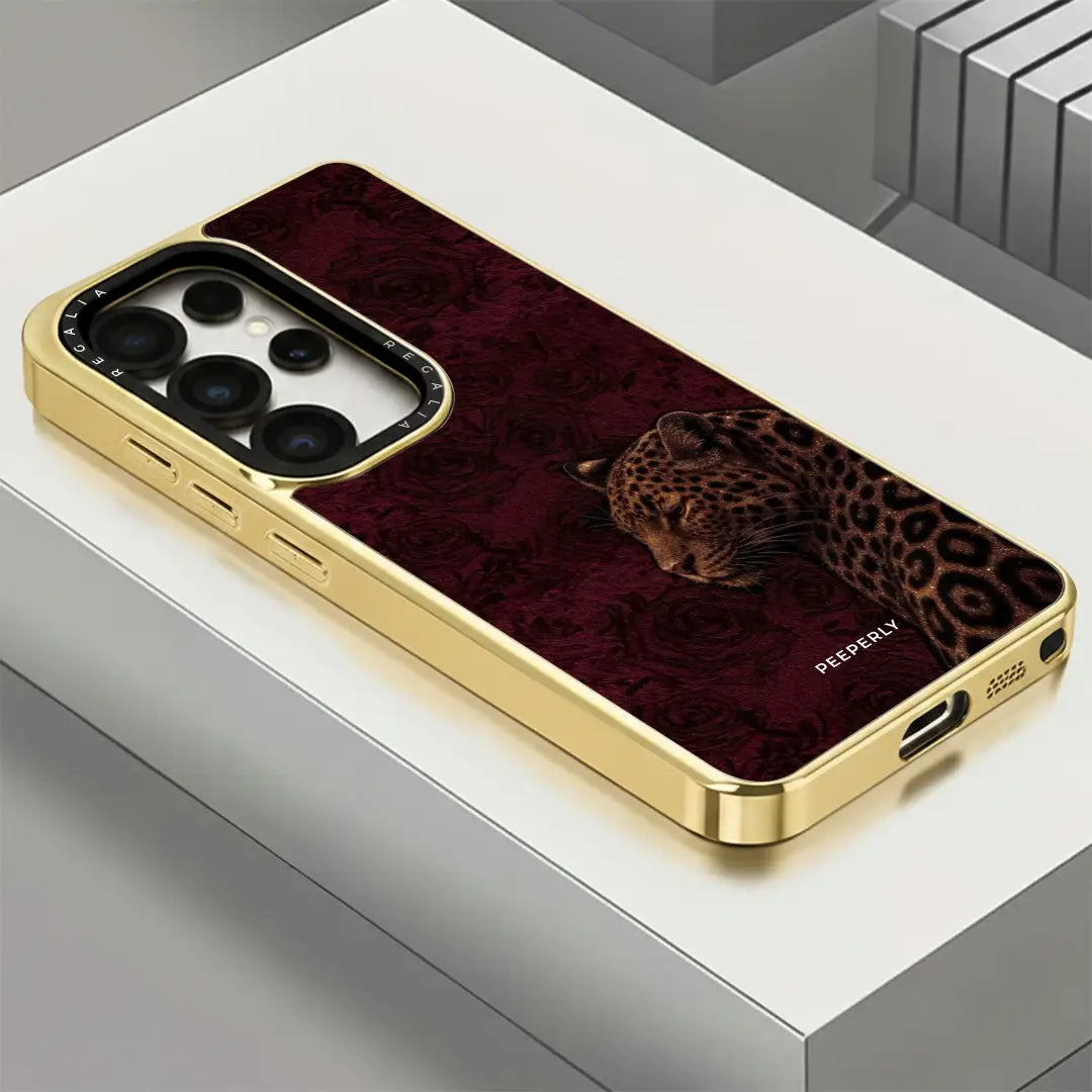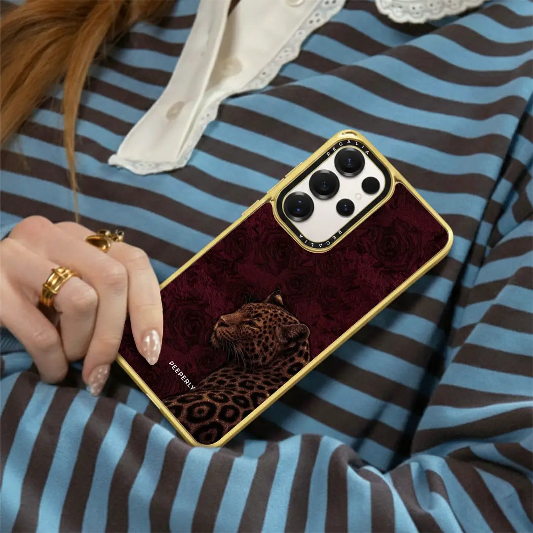 Royal Instinct embodies power wrapped in elegance. Set against a deep crimson backdrop with subtle rose textures, the poised leopard stands calm yet commanding — a symbol of quiet strength and natural authority.