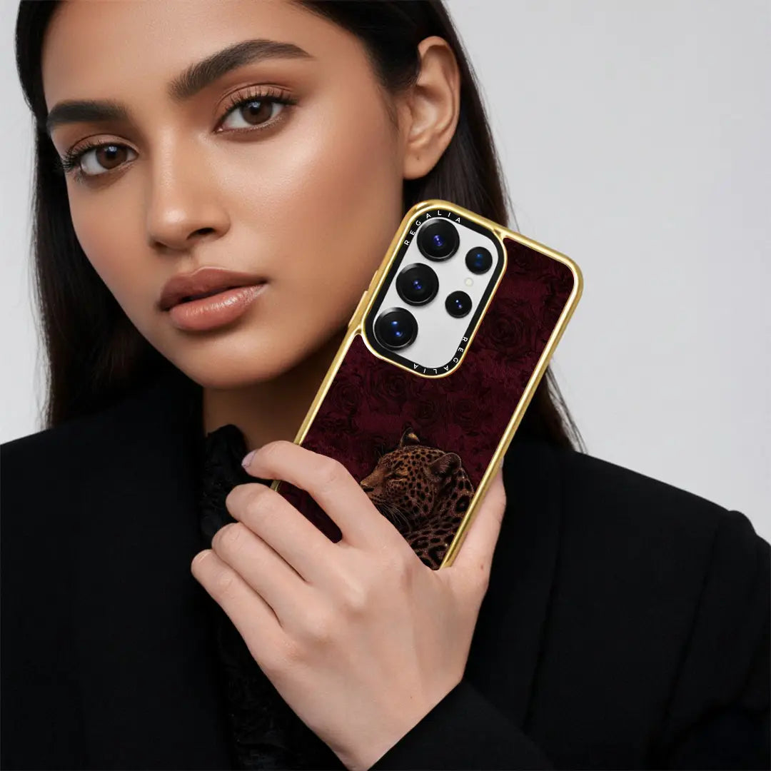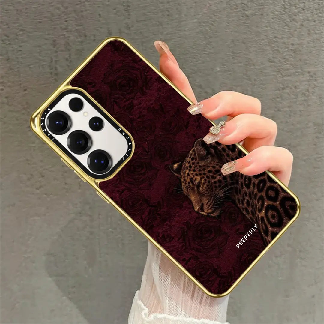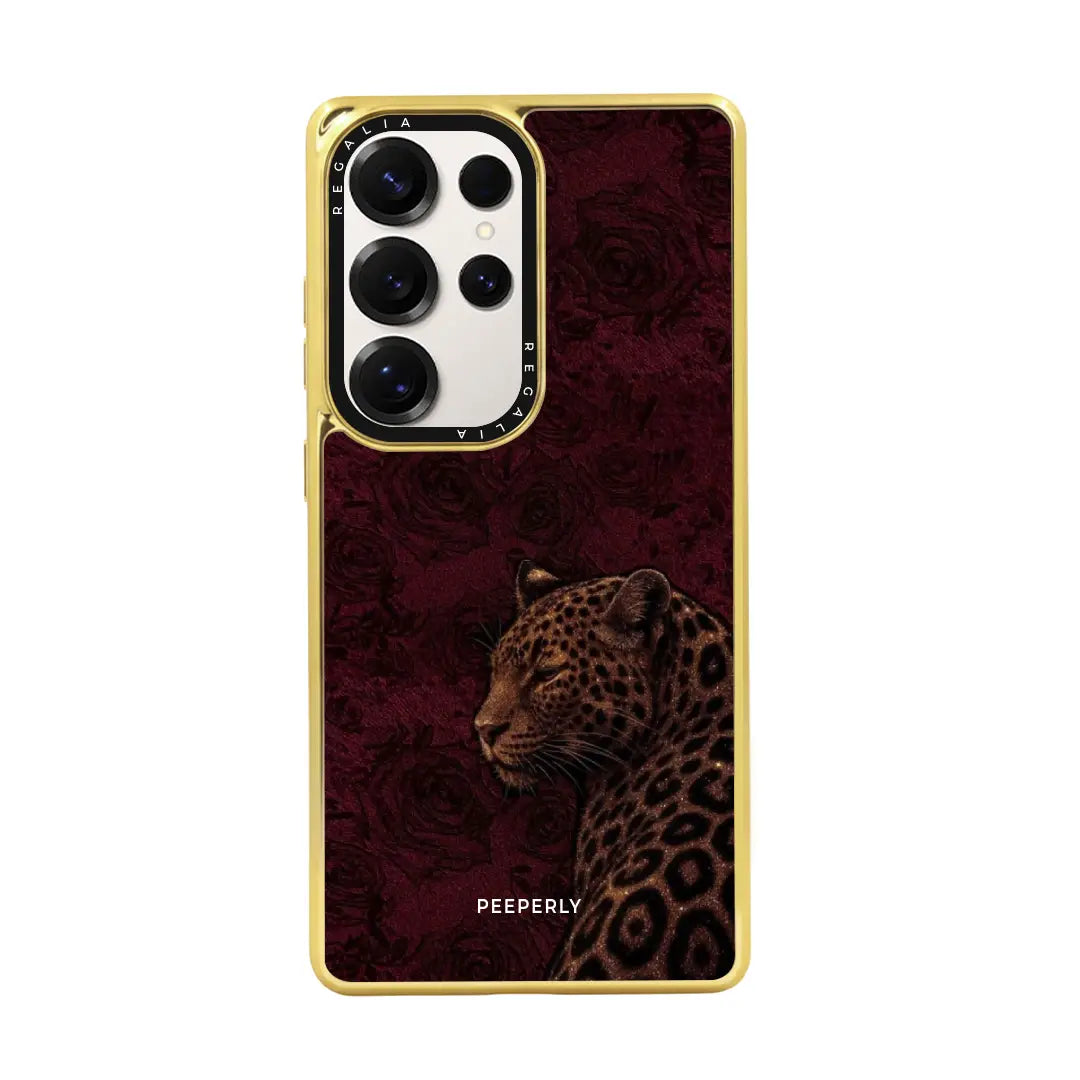 Royal Instinct embodies power wrapped in elegance. Set against a deep crimson backdrop with subtle rose textures, the poised leopard stands calm yet commanding — a symbol of quiet strength and natural authority.