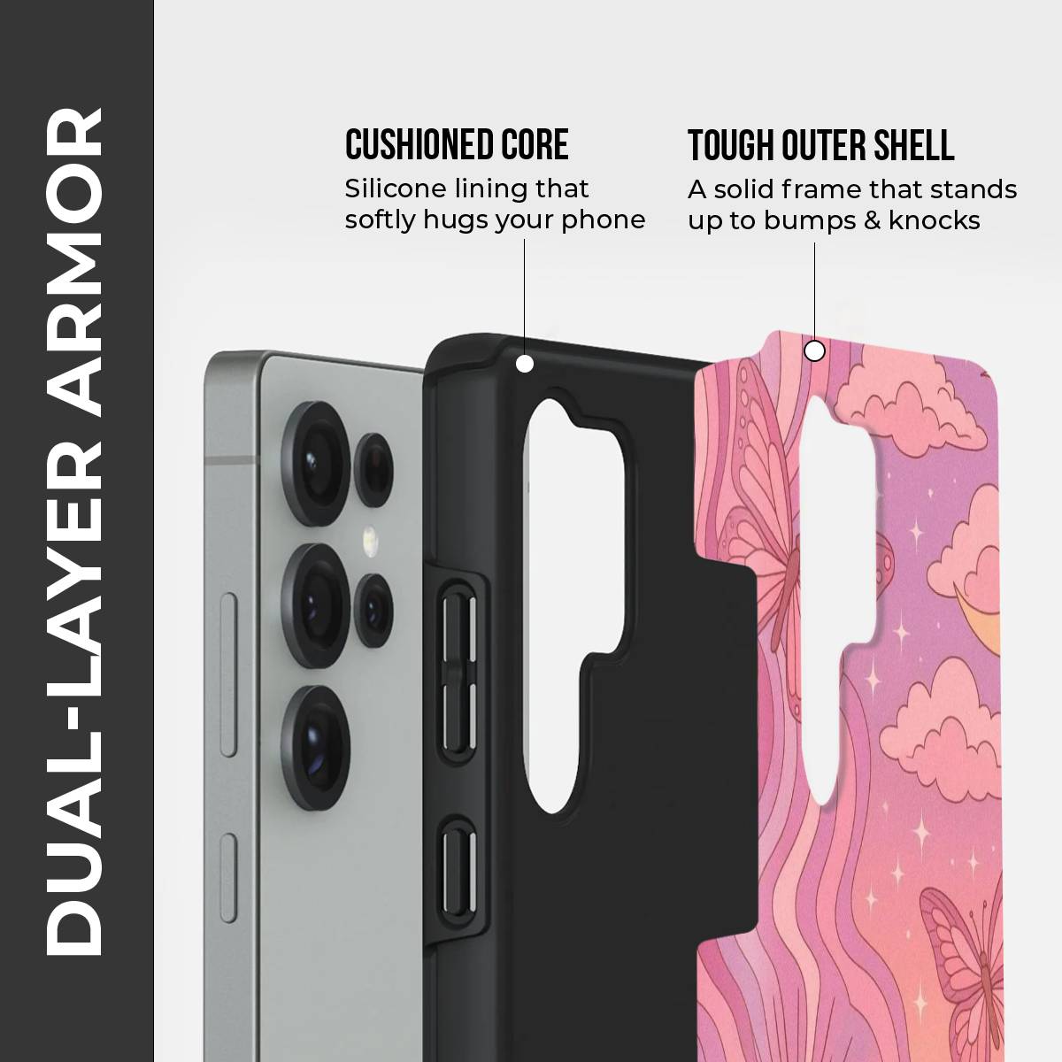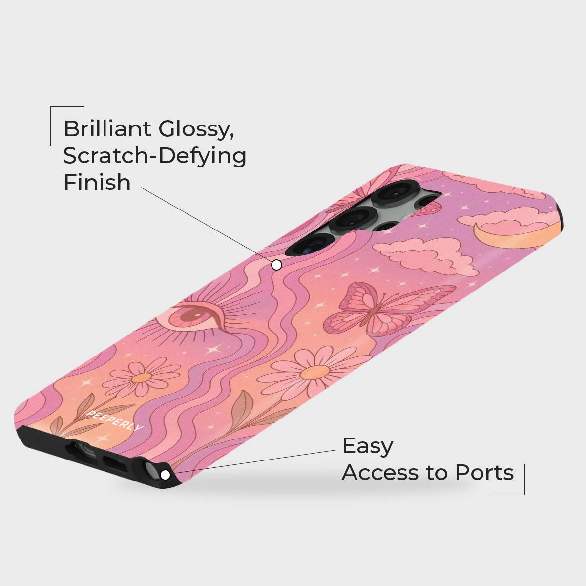 A mystical and captivating design that blends cosmic energy with artistic flair. Featuring a dreamy eye surrounded by soft waves, delicate butterflies, and blooming flowers, this case is a beautiful fusion of spirituality and nature.