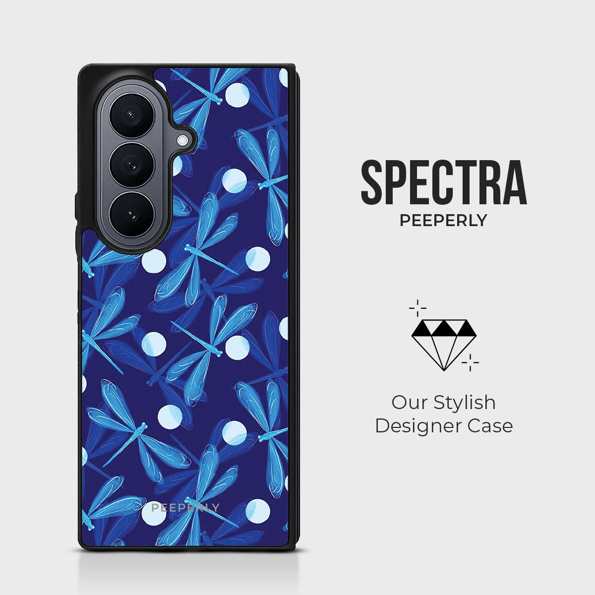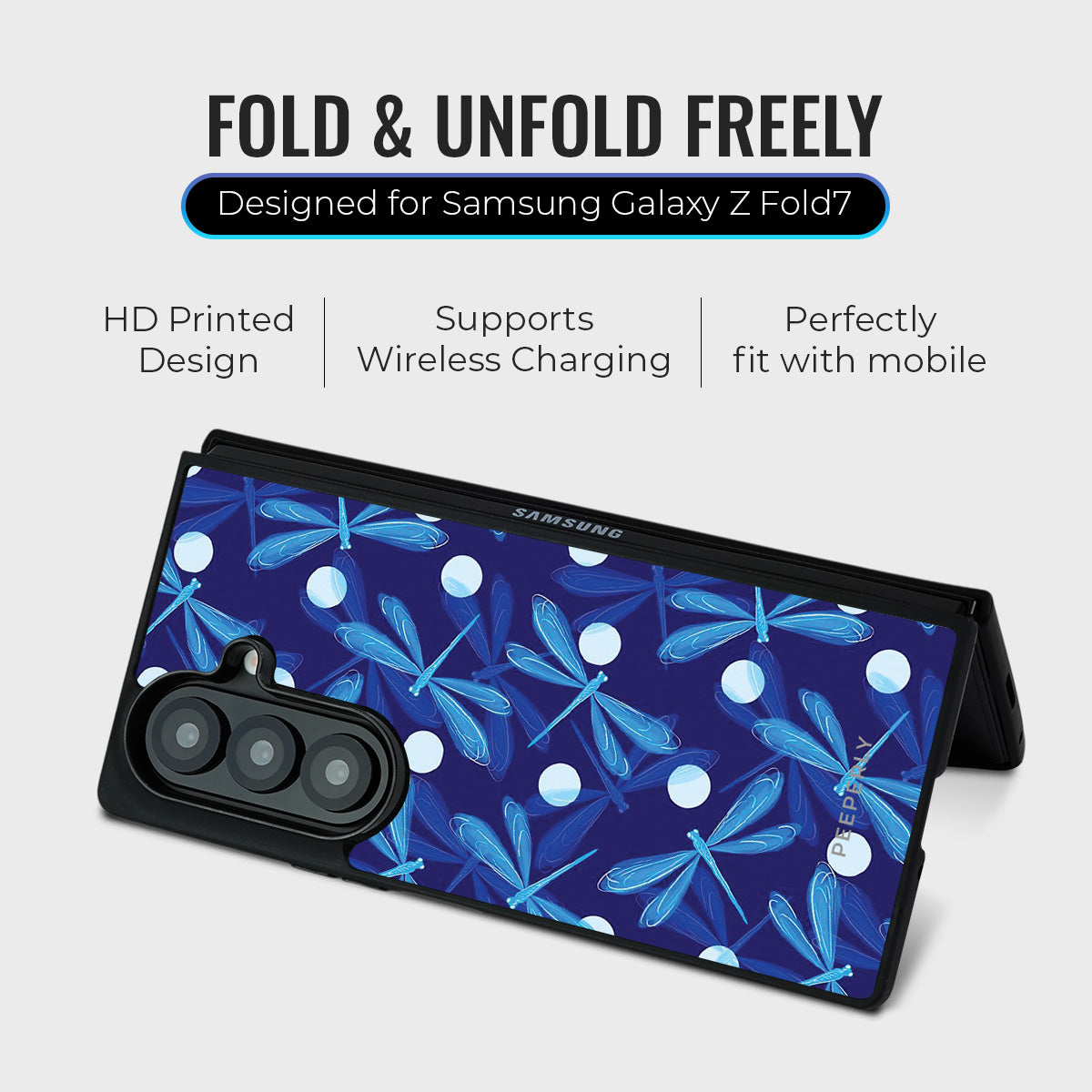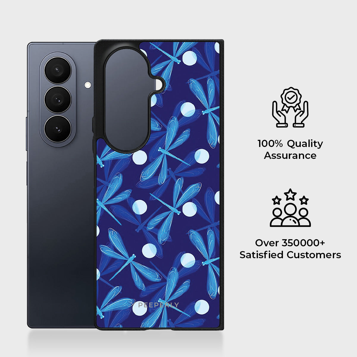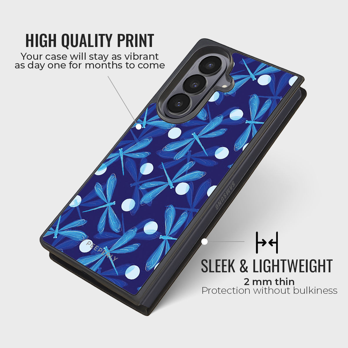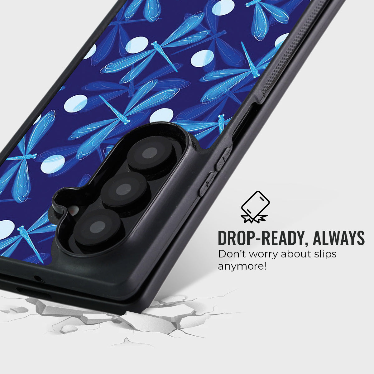 Catch a little night magic. Dragonfly Dots sets translucent sapphire wings gliding across a rich midnight-blue backdrop, dotted with crisp moon-white circles. The layered illustration gives each dragonfly a soft, glassy glow—like they’re hovering just above the surface.