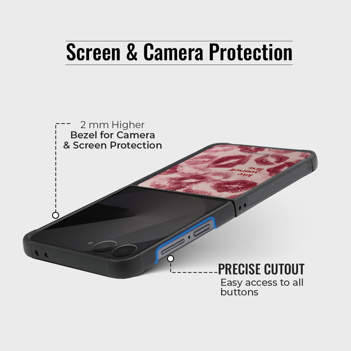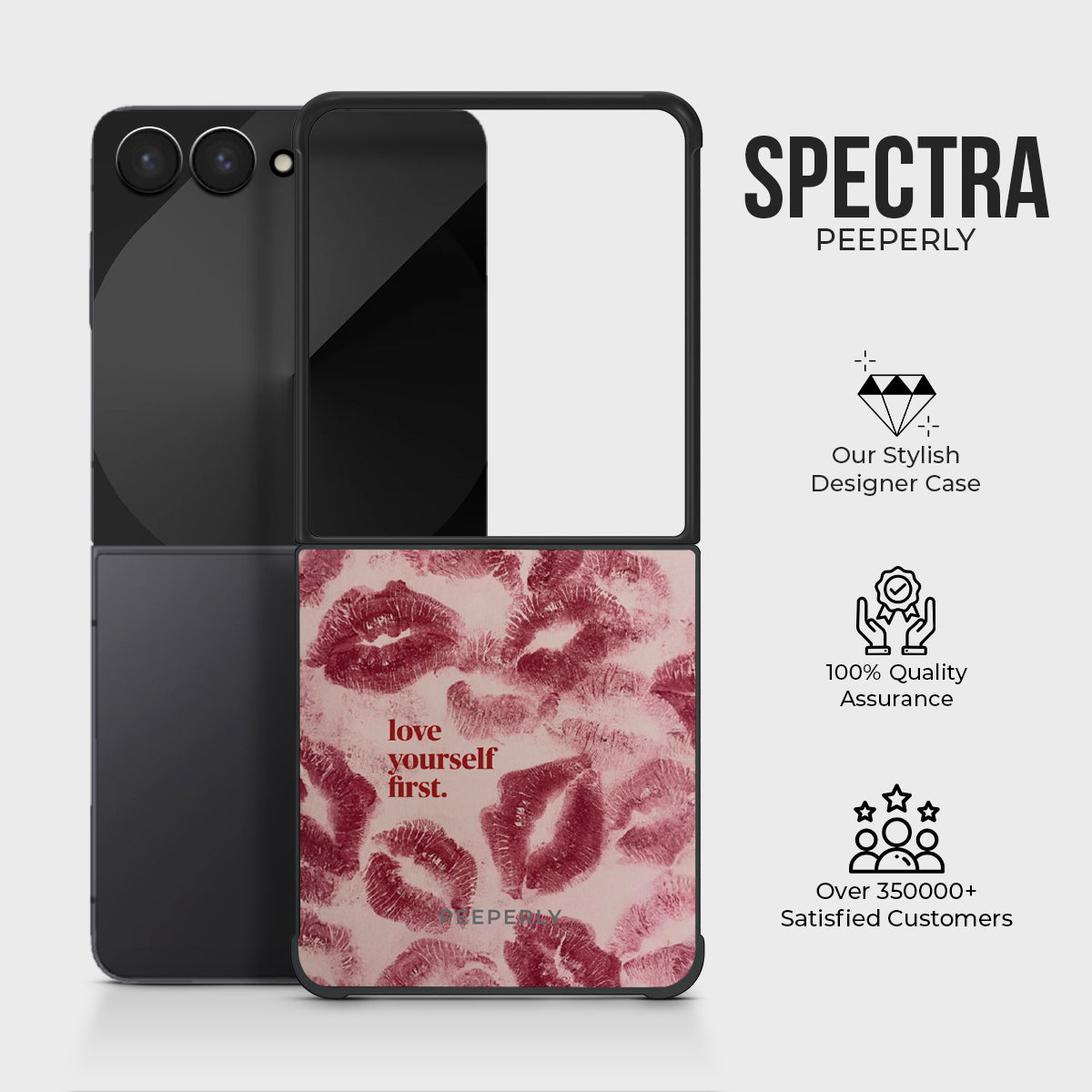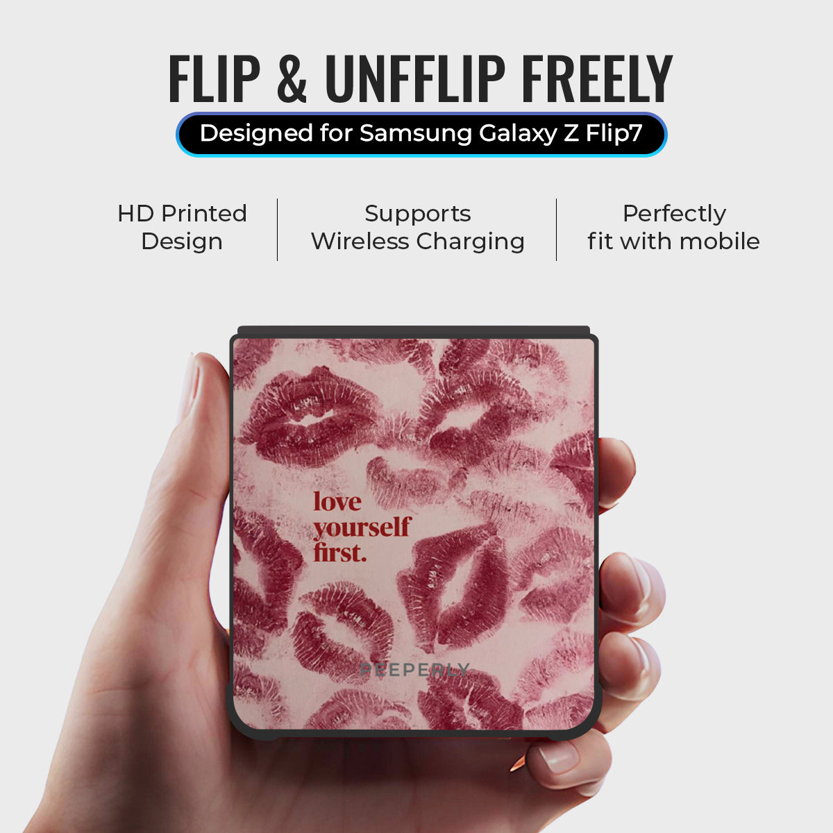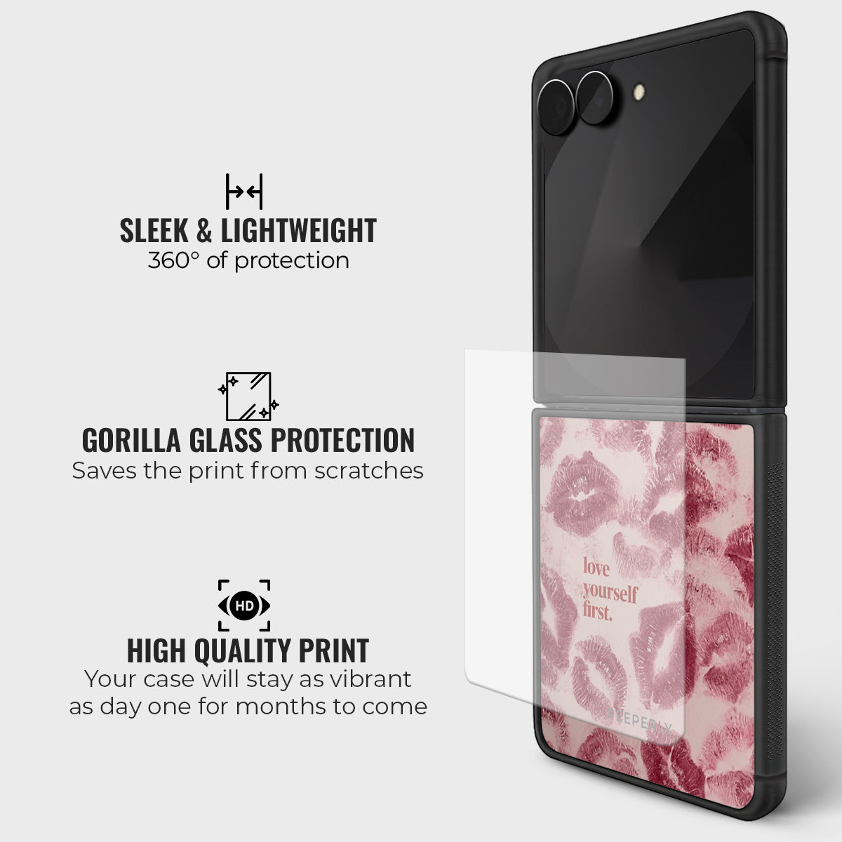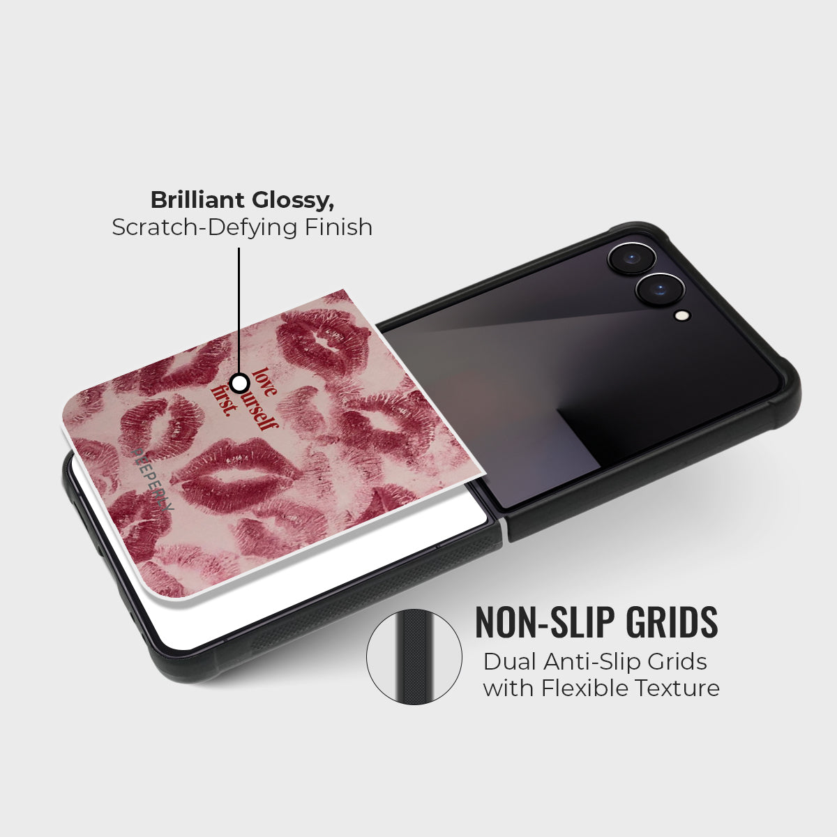 Show the world the strength that comes with loving yourself. This unique phone case, adorned with bold kiss marks and the empowering phrase "Love Yourself First," serves as a constant reminder of your inner power and beauty.