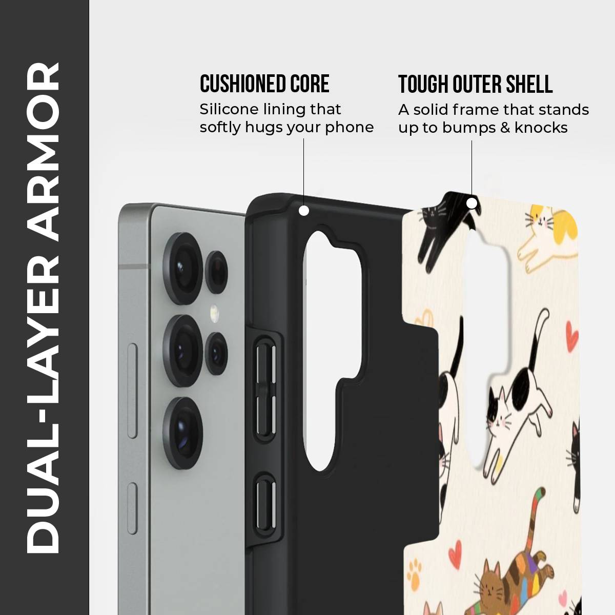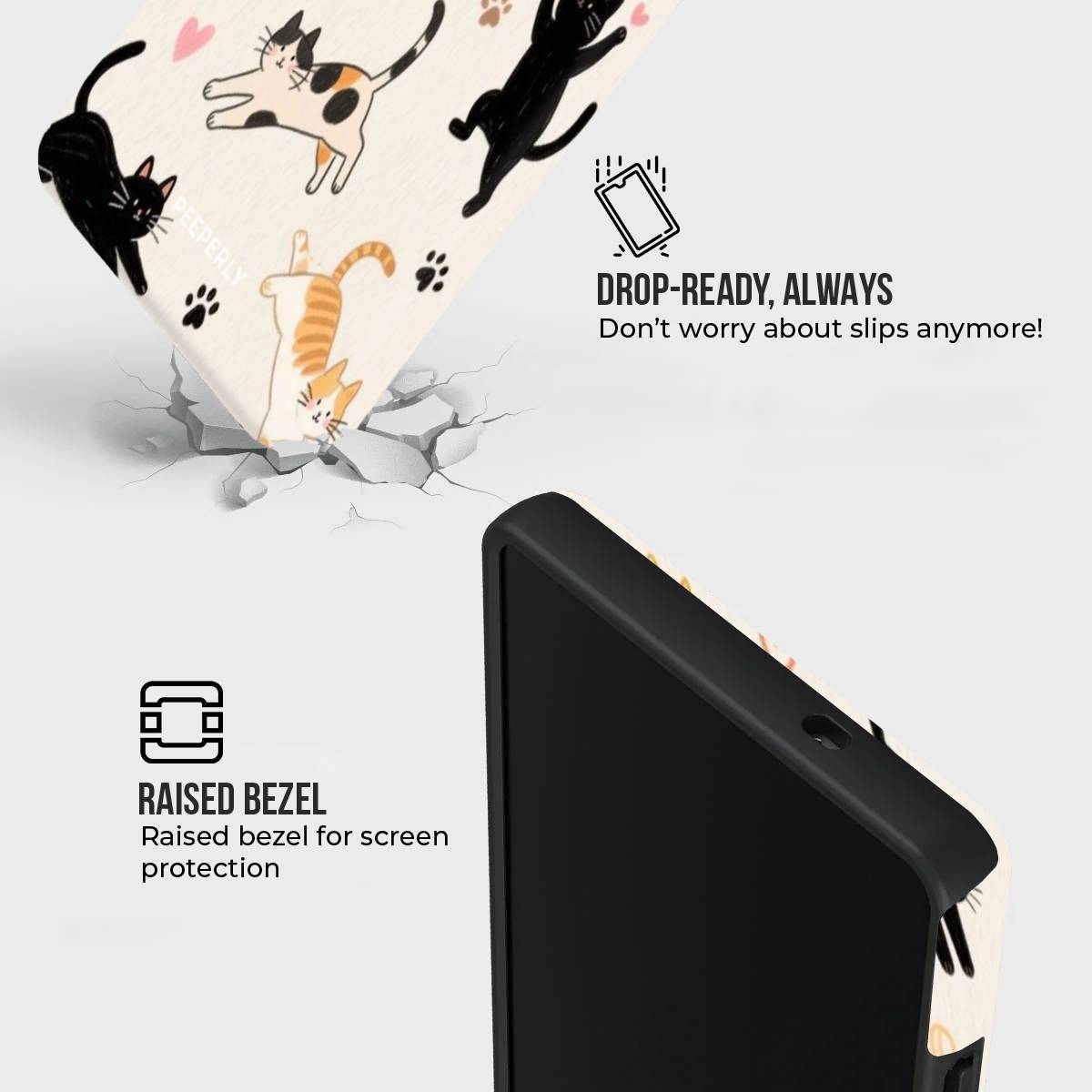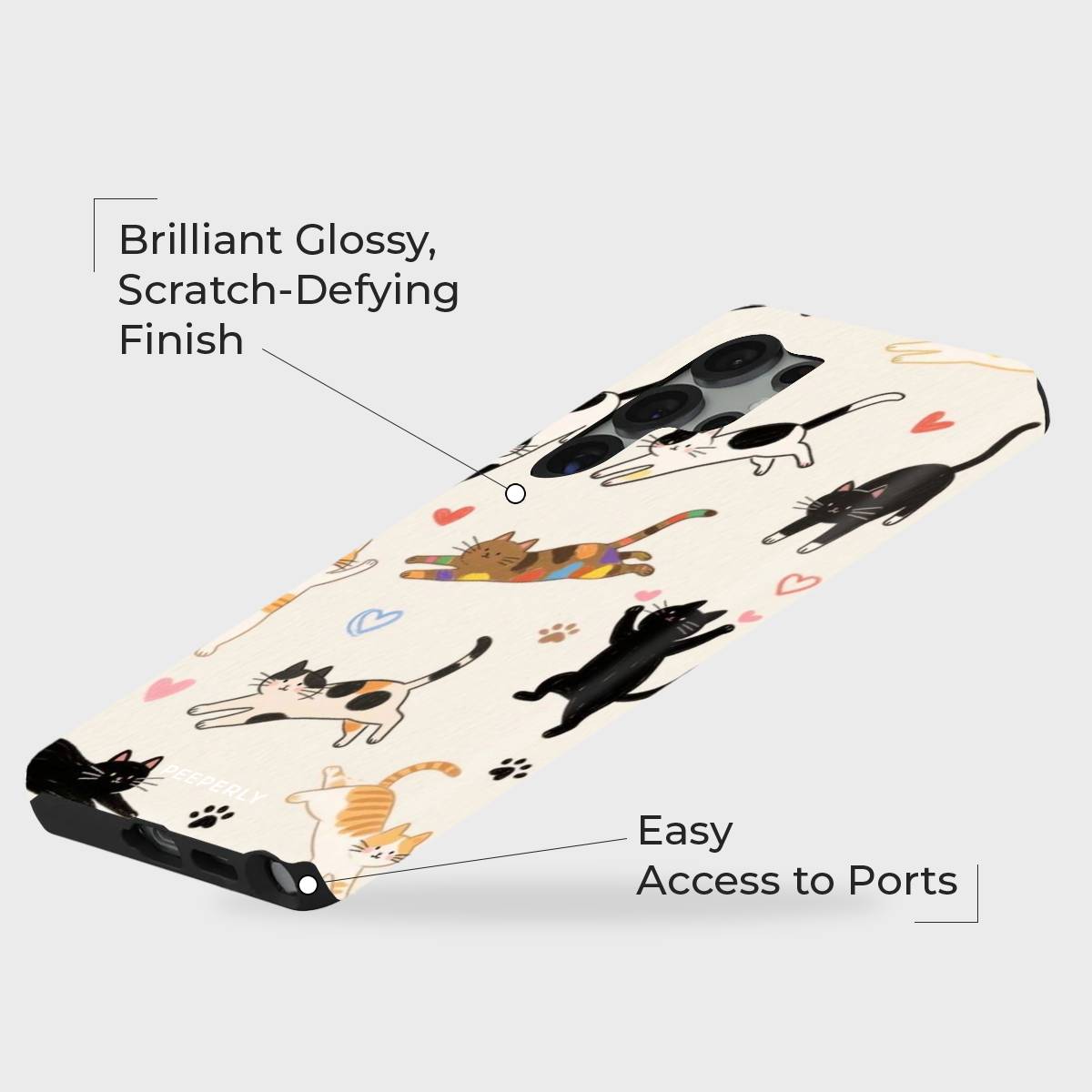 Bring joy to your phone with this adorable case featuring playful kitties in every pose imaginable! From colorful tabbies to sleek black cats, each one is captured mid-pounce, stretch, or snuggle — surrounded by little hearts and paw prints that add extra charm.