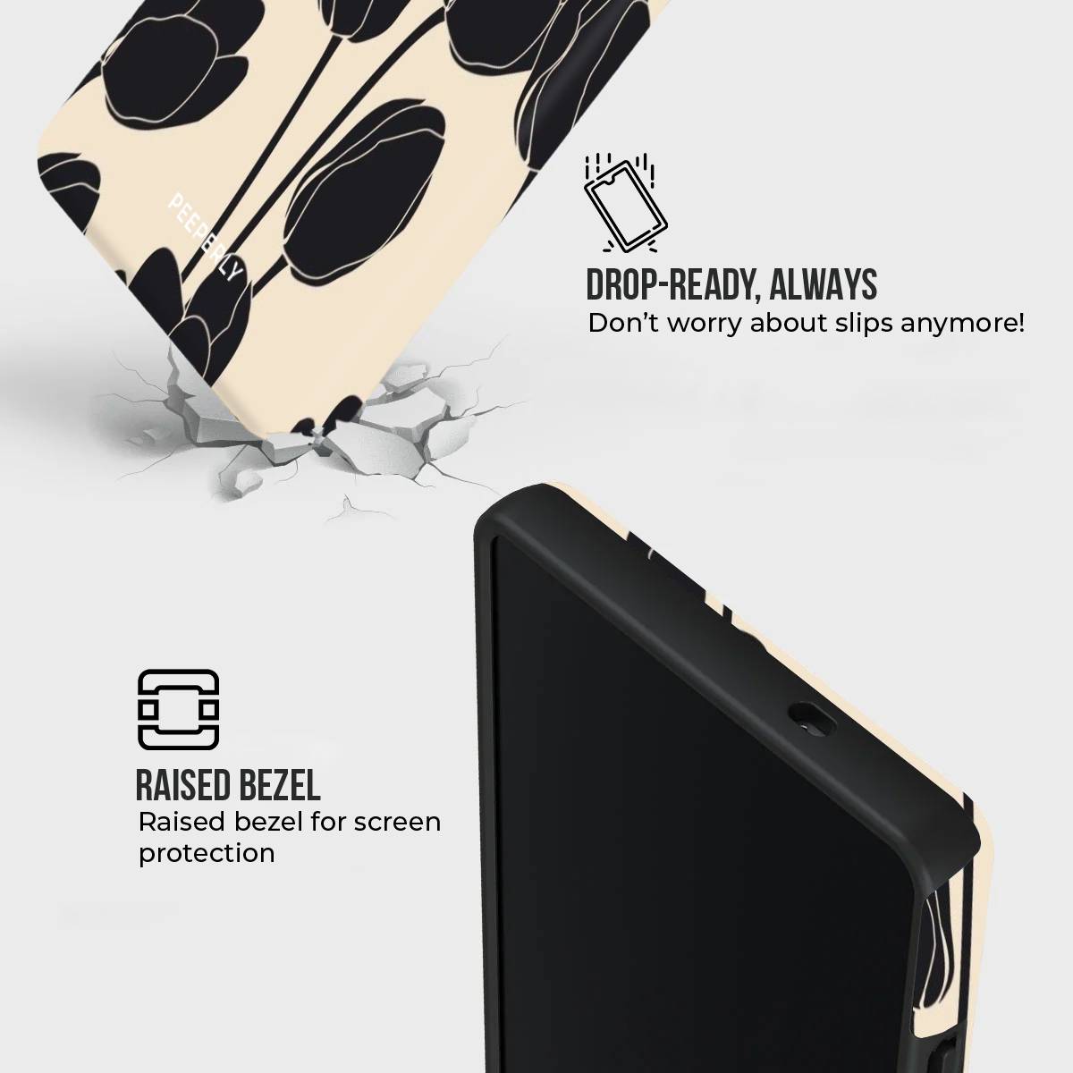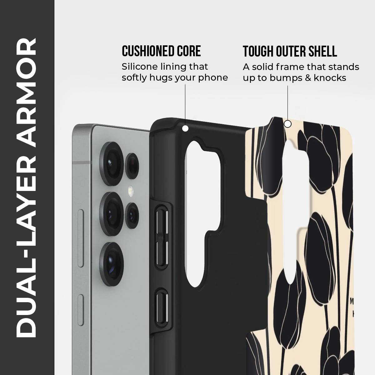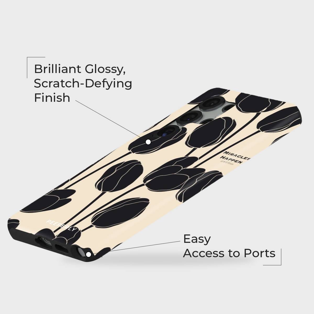 A refined blend of bold black tulips on a soft, neutral backdrop, creating a striking yet subtle floral design for your phone. Perfect for those who appreciate simplicity and elegance.
