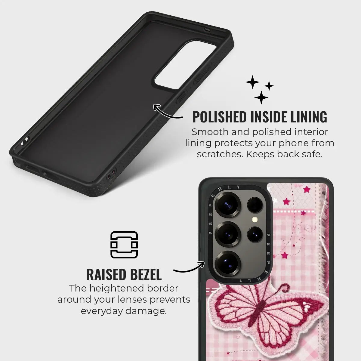 • Polished Inner Lining: Smooth lining shields the phone’s back from scratches.