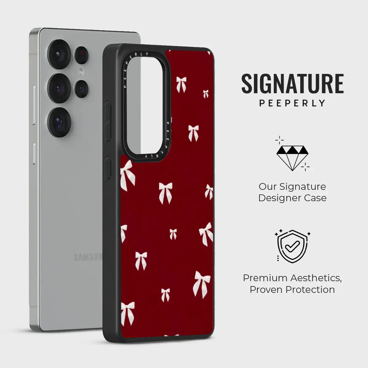 Silk Bows is a refined phone case featuring elegant white ribbon motifs set against a rich, deep red background. The clean, repeating pattern creates a polished and luxurious look, inspired by beautifully wrapped gifts.