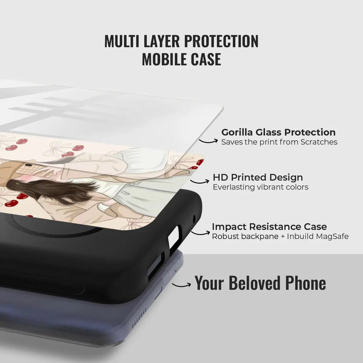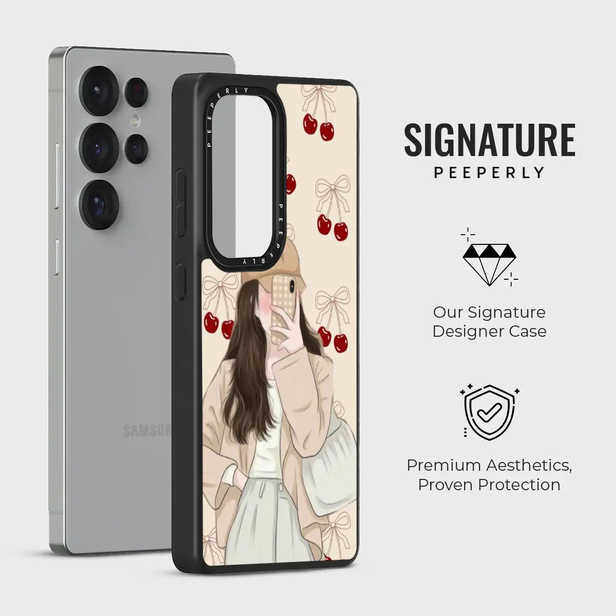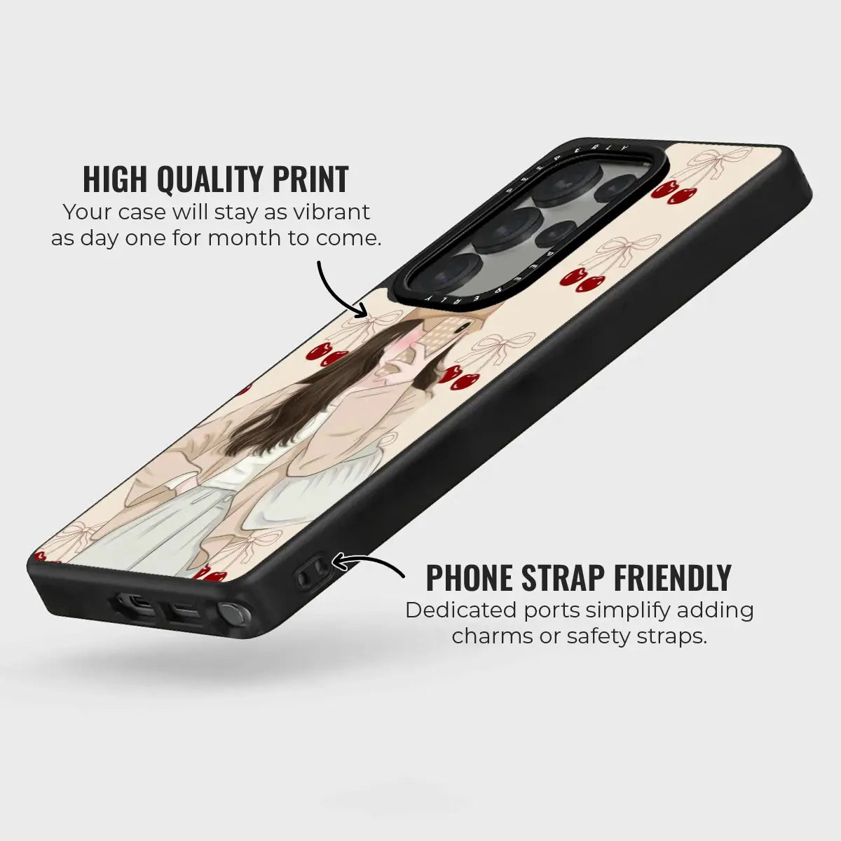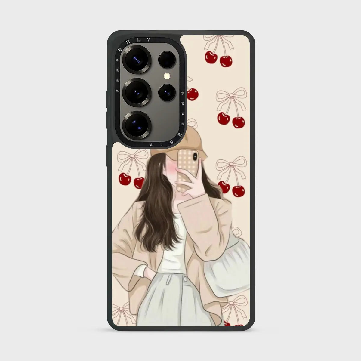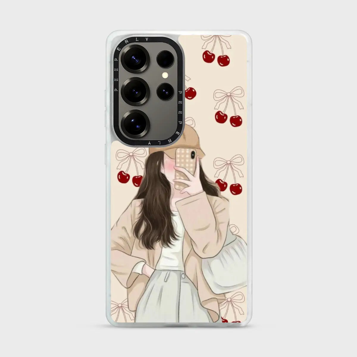 Sweet Silhouette is a soft, aesthetic phone case featuring a delicate illustrated figure paired with charming cherry and bow accents. The muted tones and gentle details create a cozy, dreamy look that feels both modern and romantic.